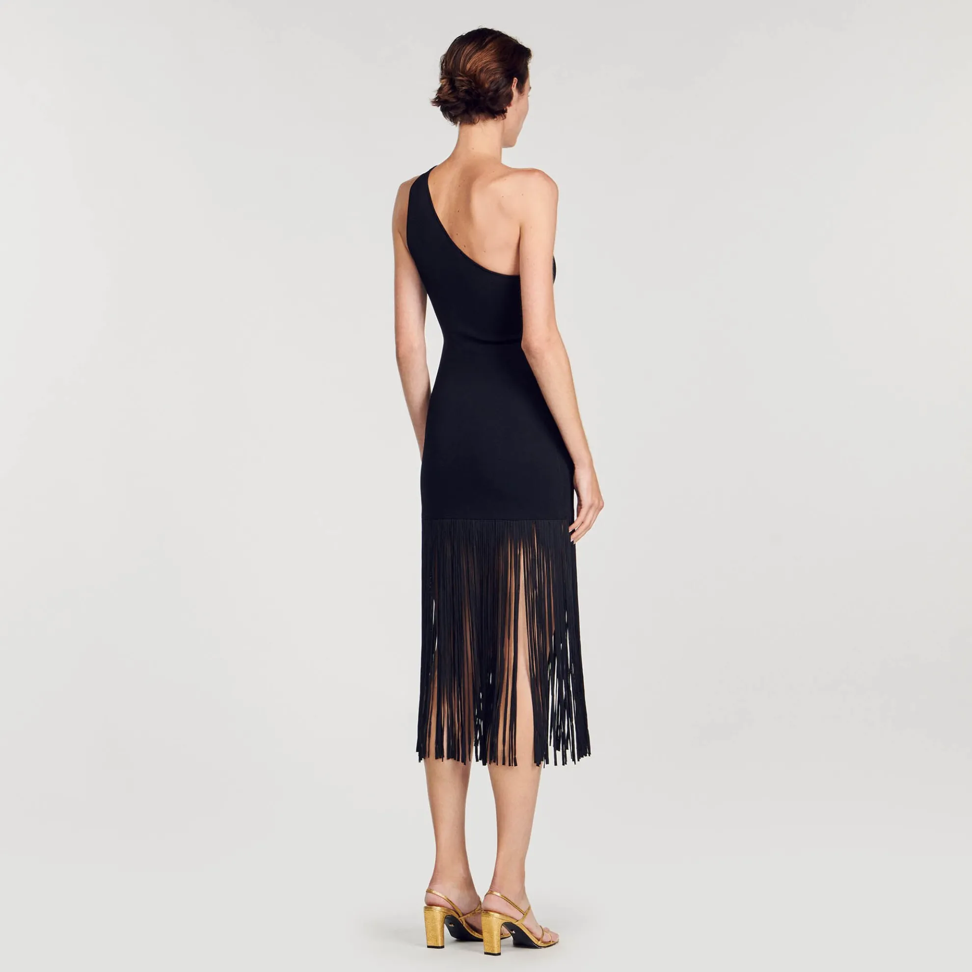 Asymmetrische gebreide midi jurk met dubbele schouderbandjes, een afneembare broche en rokgedeelte met franjes.
