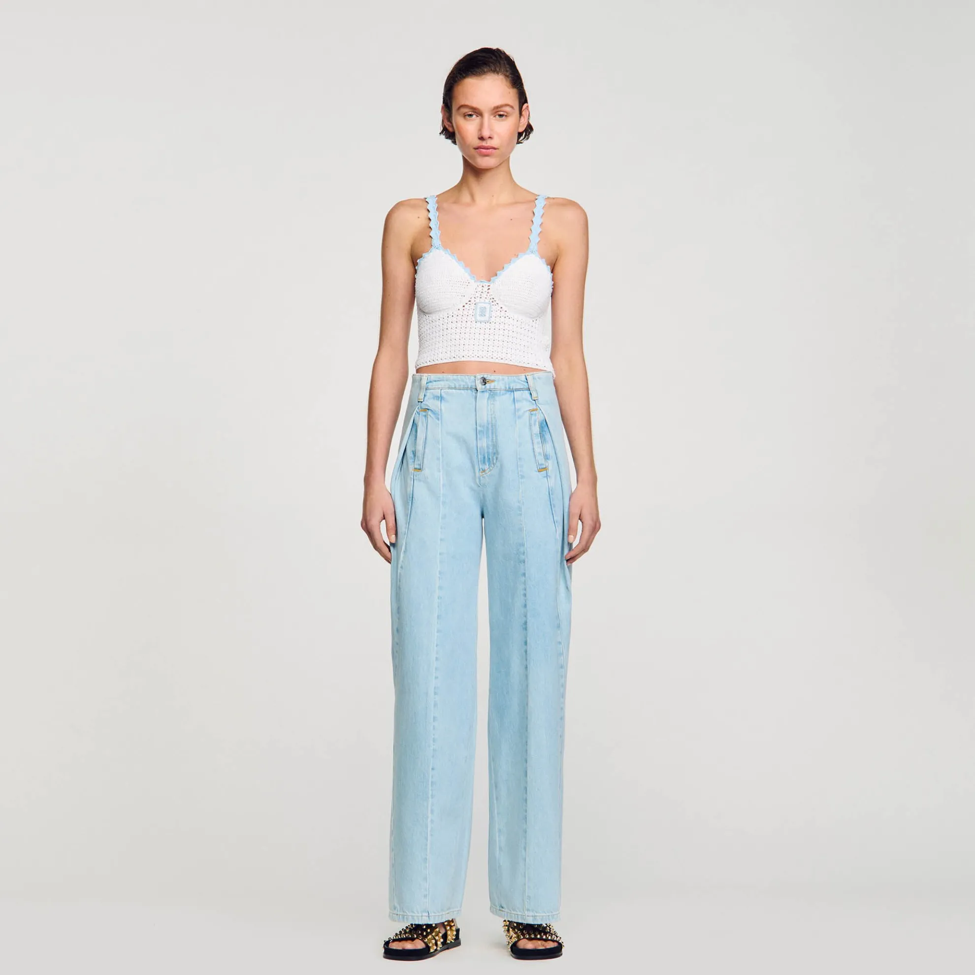 Gehaakte brassière met contrasterende schouderbandjes, geborduurd logo en cut-outs op de borst.