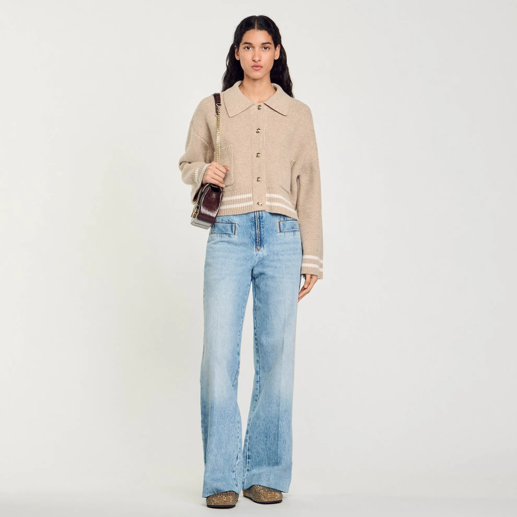 Kort ruim vest van dik tricot met siersteek met een overhemdkraag, lange mouwen, een vergulde knoopsluiting, opgestikte zakken en contrasterende biezen.