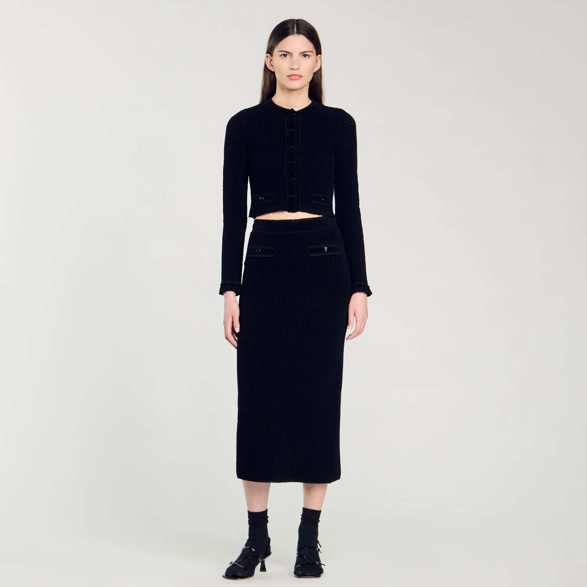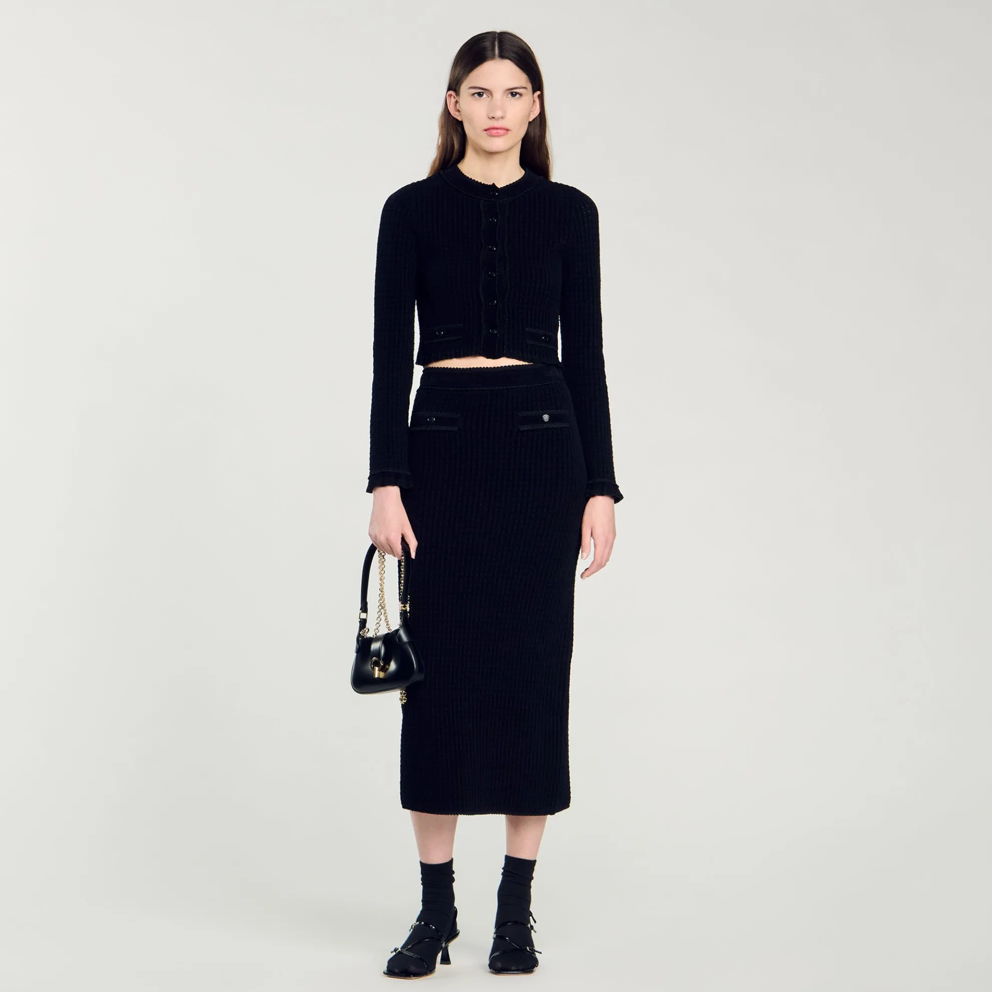 Kort gebreid cardigan vest met velours en pointillé effect, ronde hals, lange mouwen, knoopsluiting en sier-paspelzakken.