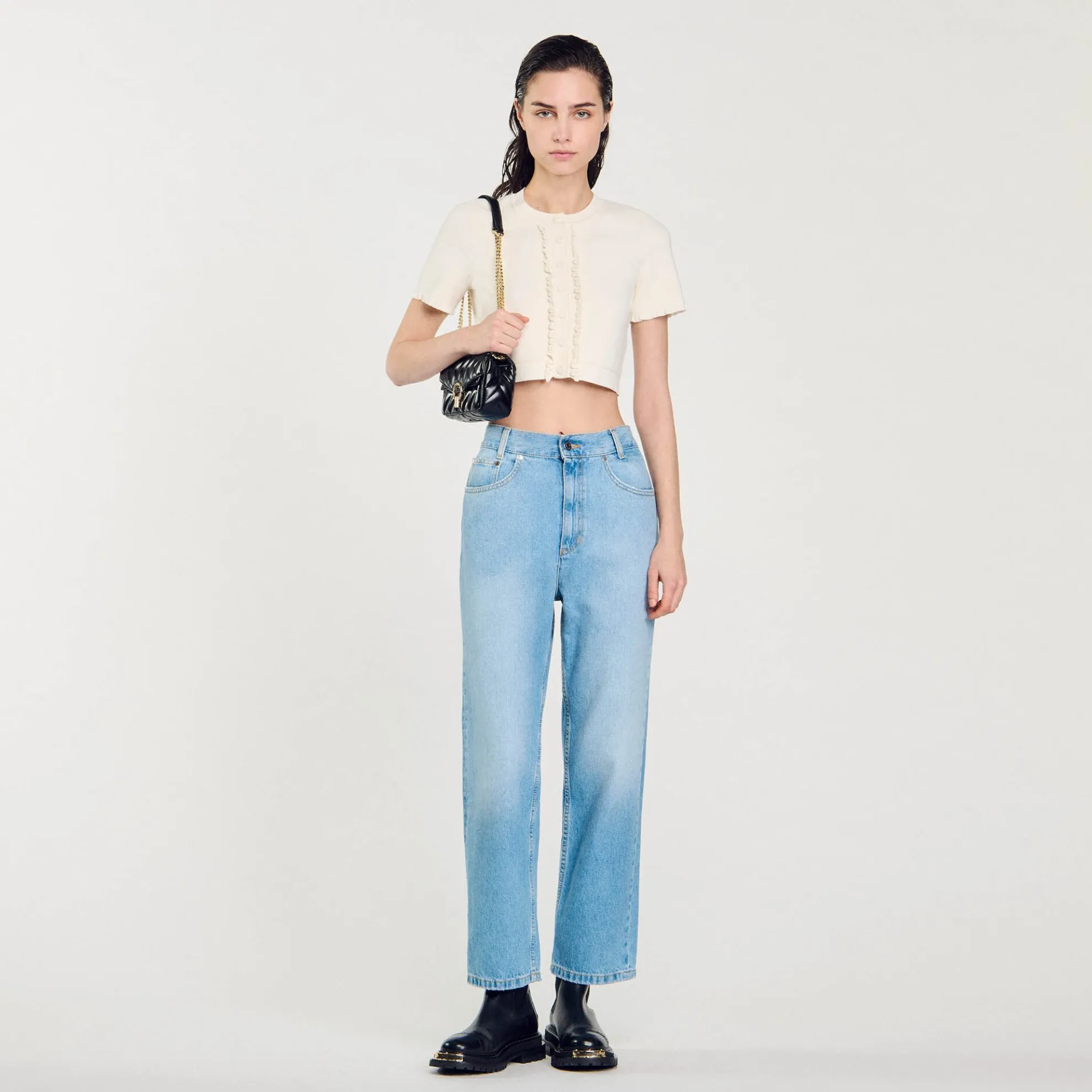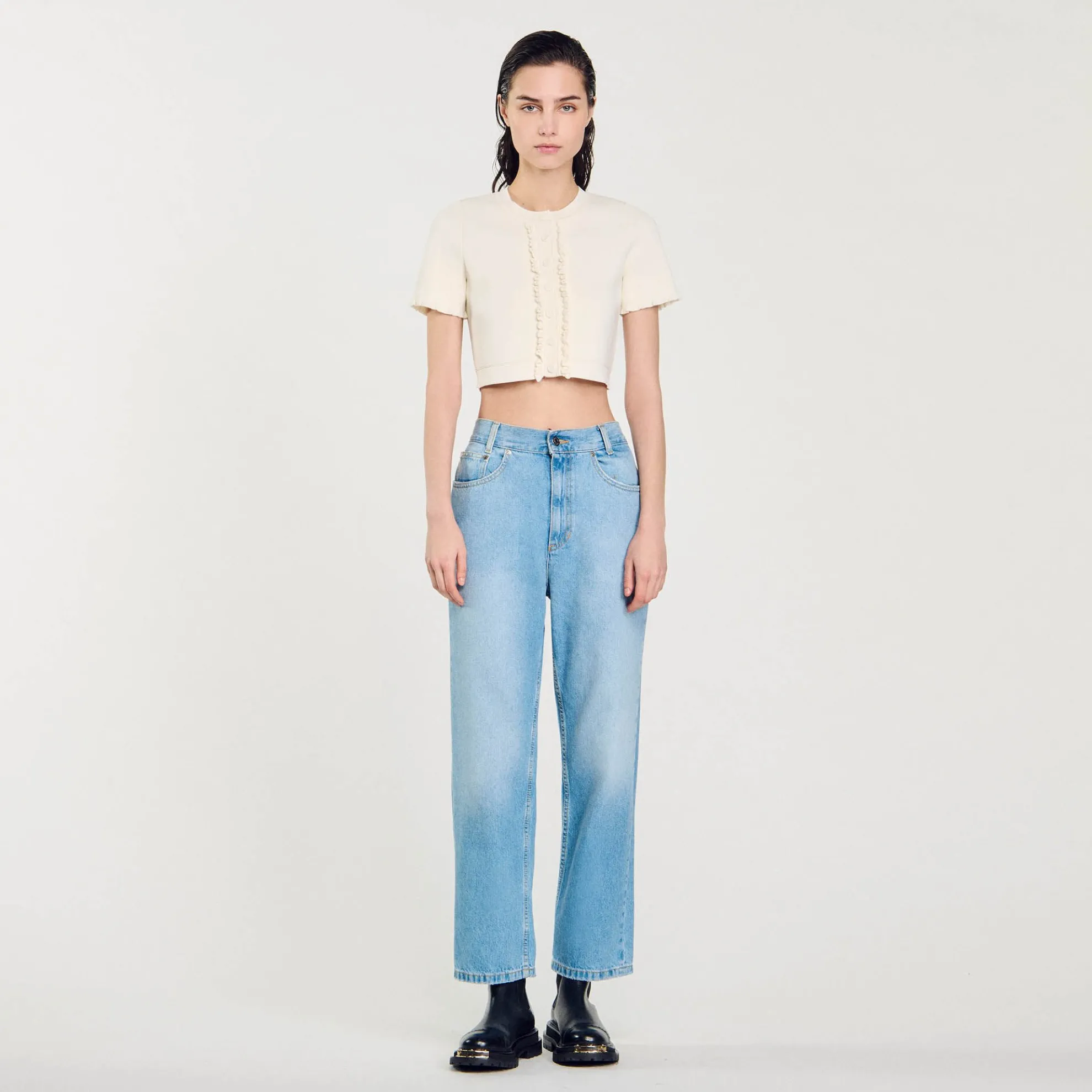 Fijn ribgebreid cardigan vest met korte mouwen, knoopsluiting met volants en een ronde hals.