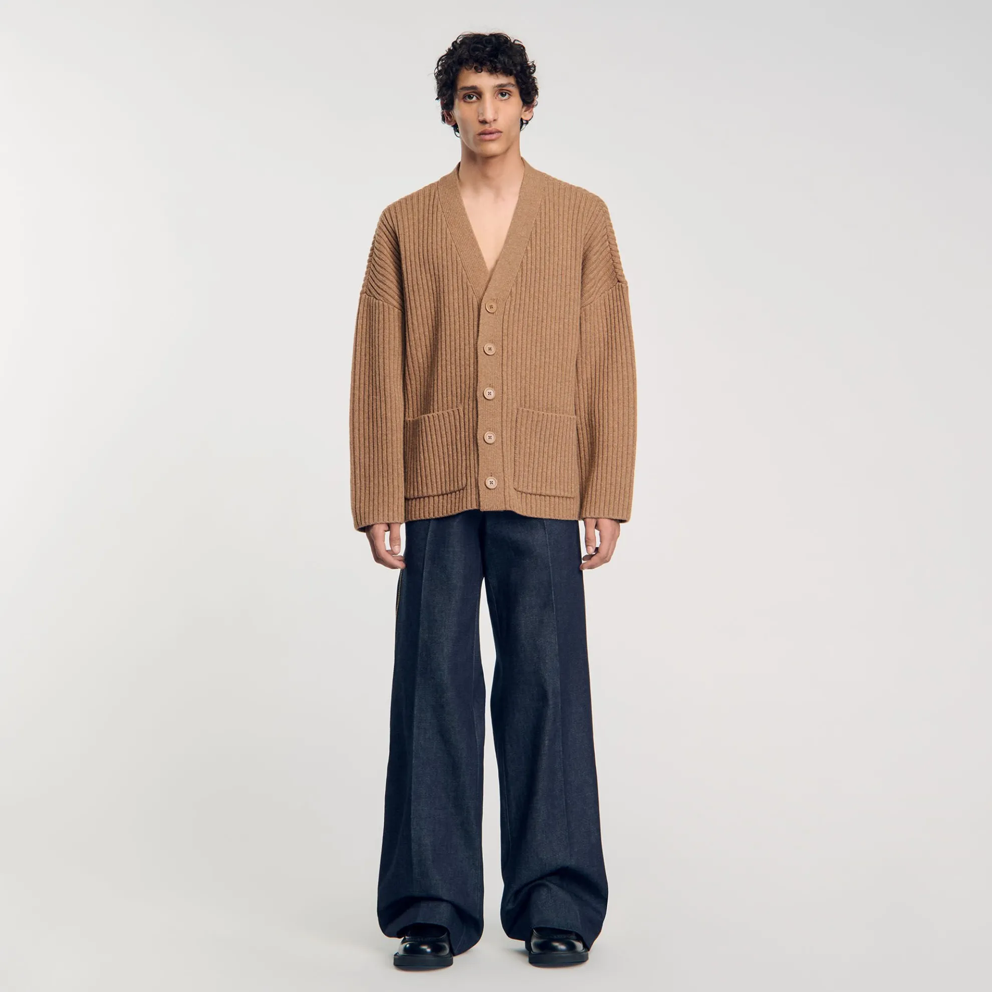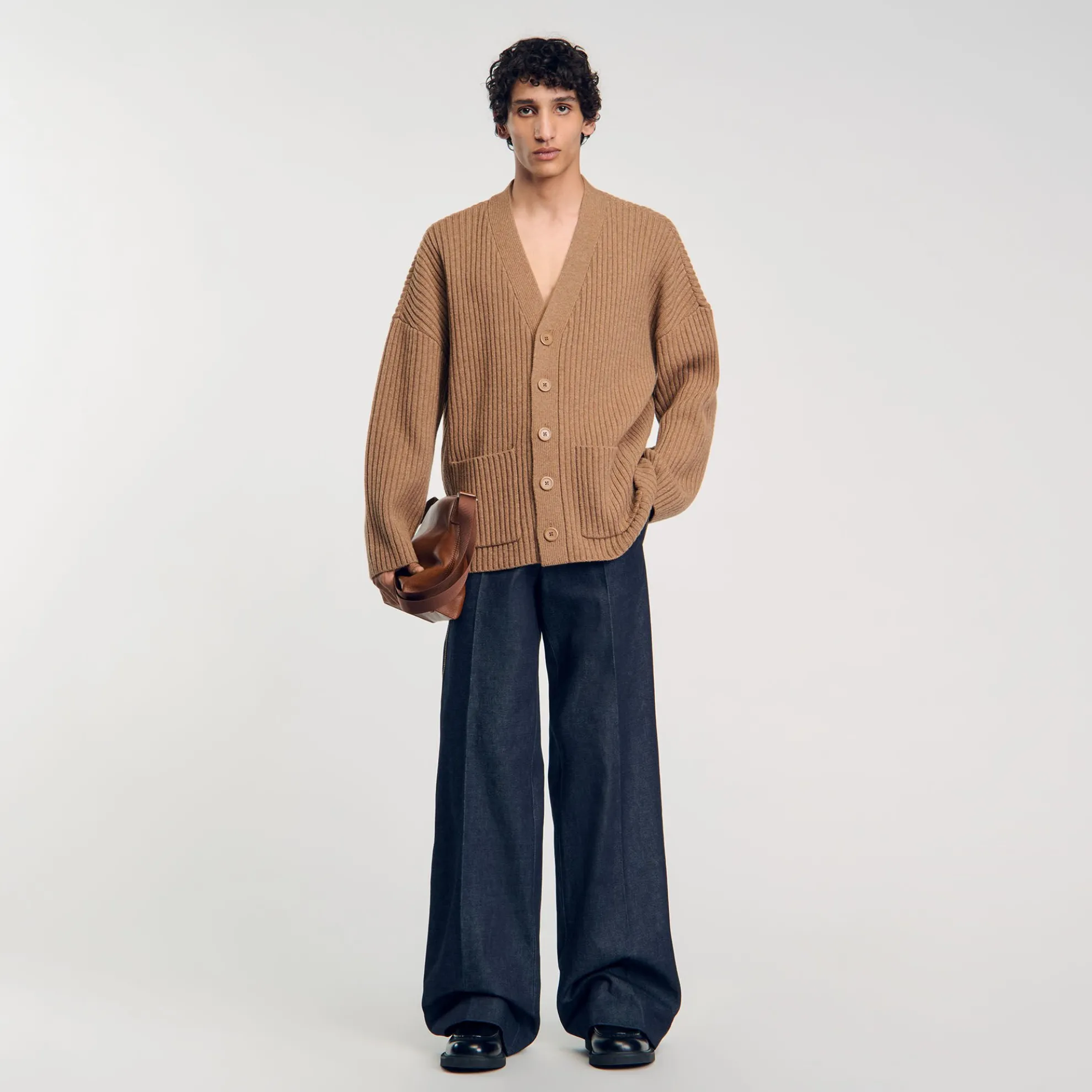 Oversized cardigan vest van grofgebreide stof met volumineuze lange mouwen, V-hals, ton-sur-ton knoopsluiting en opgestikte zakken.