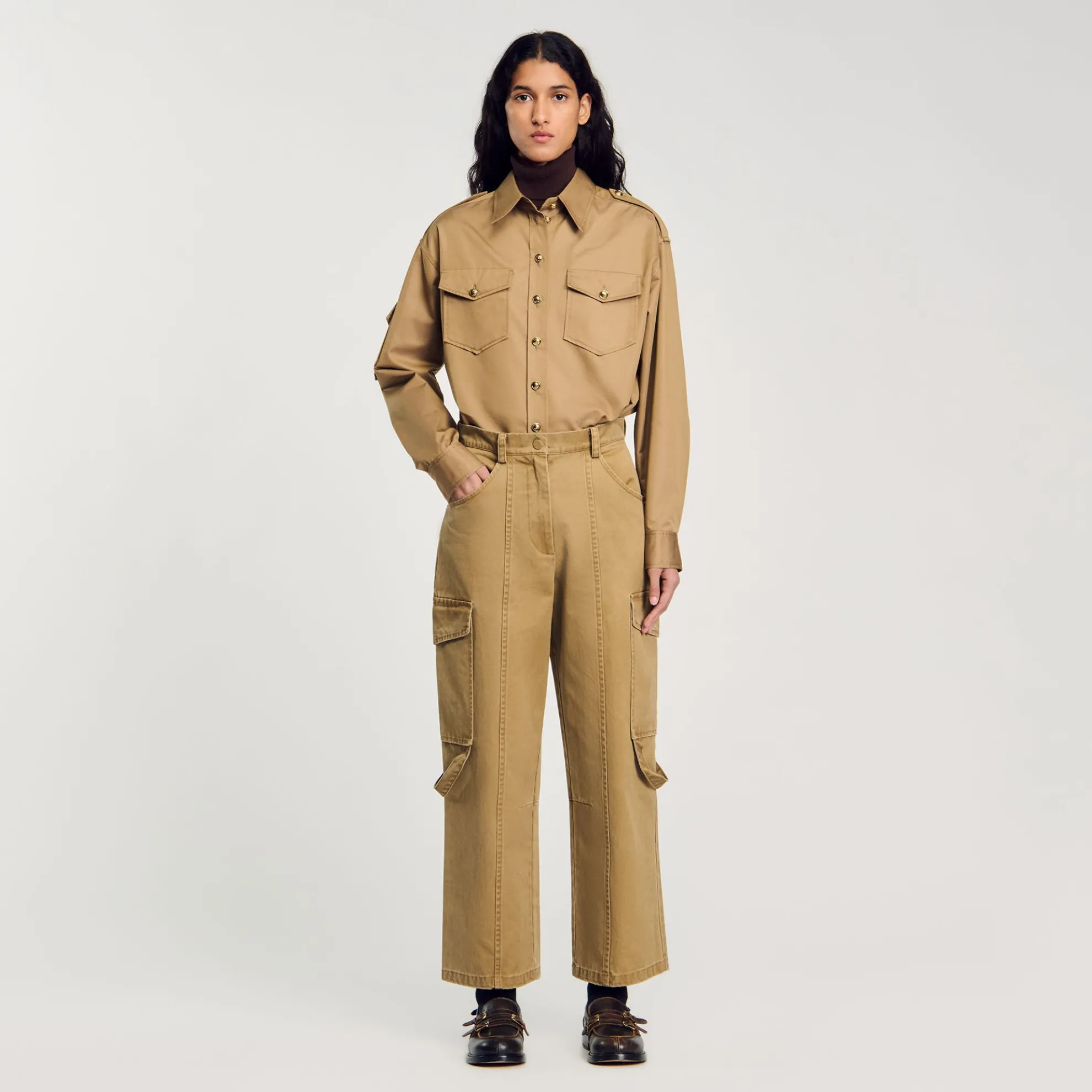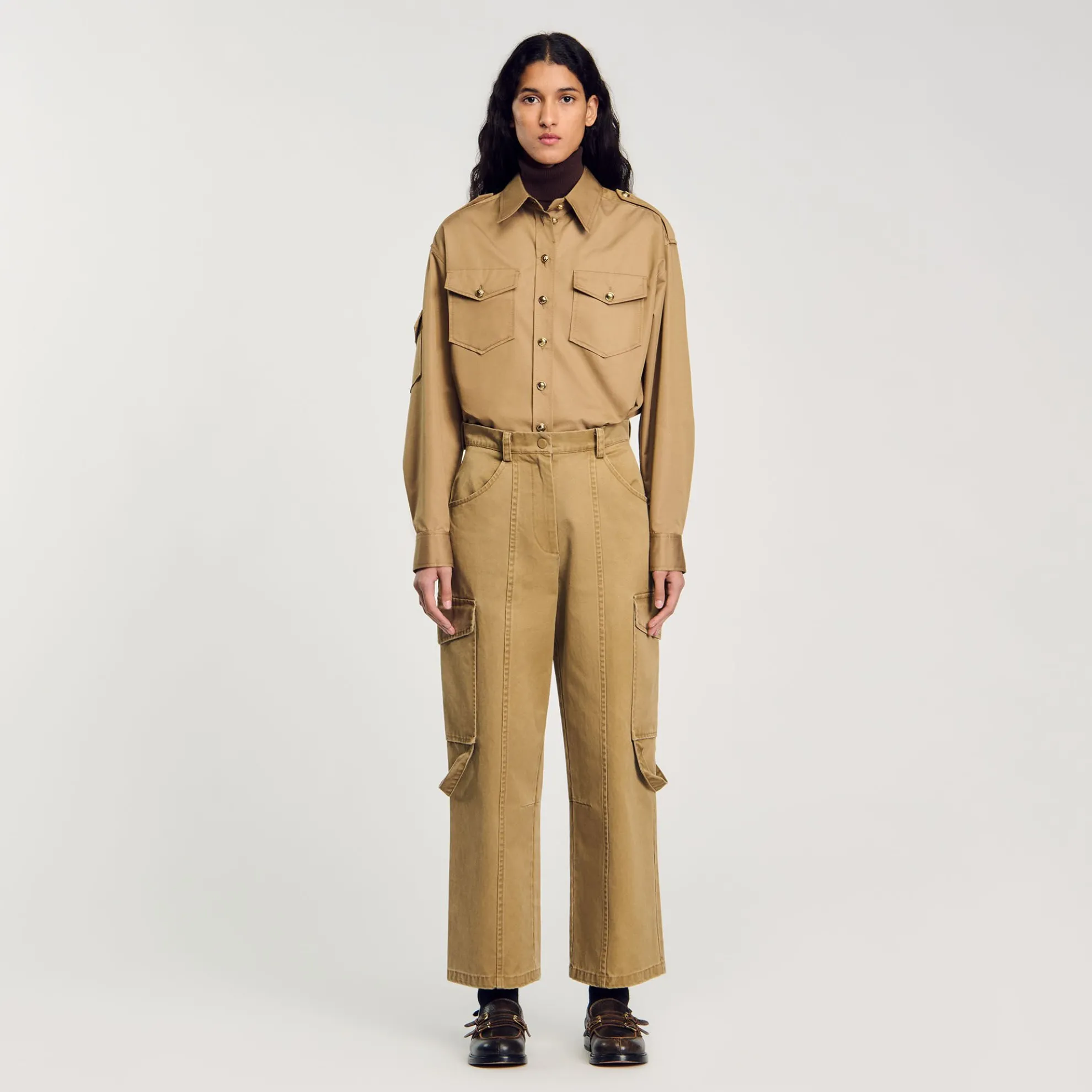 Cargobroek met wijde pijpen, grote klepzakken en zijbanden.