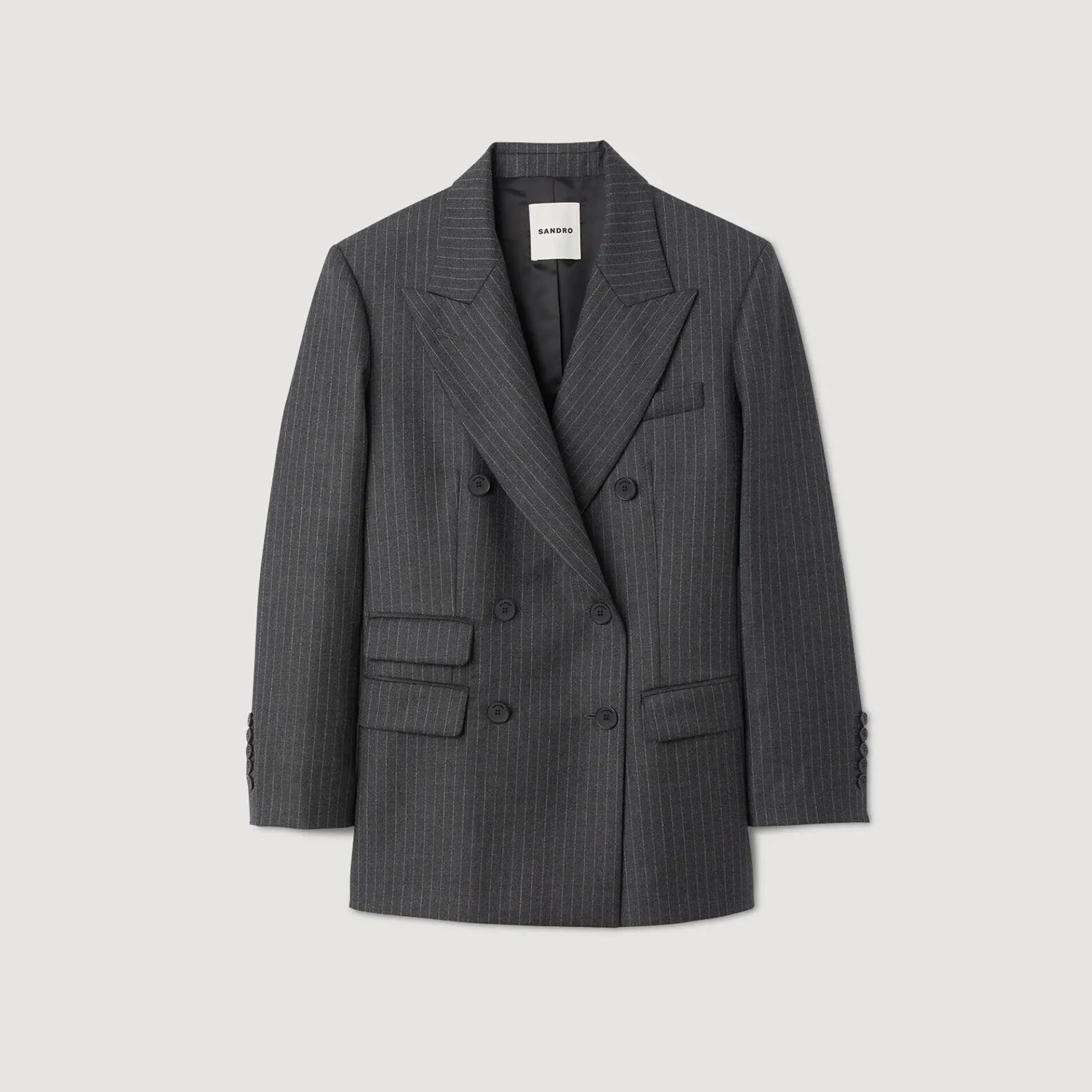 Getailleerd colbert met dunne strepen, een opstaande kraag met revers, een gekruiste knoopsluiting, lange mouwen en paspelzakken.