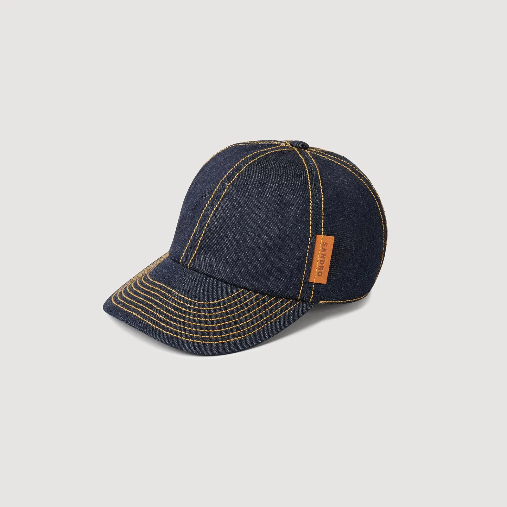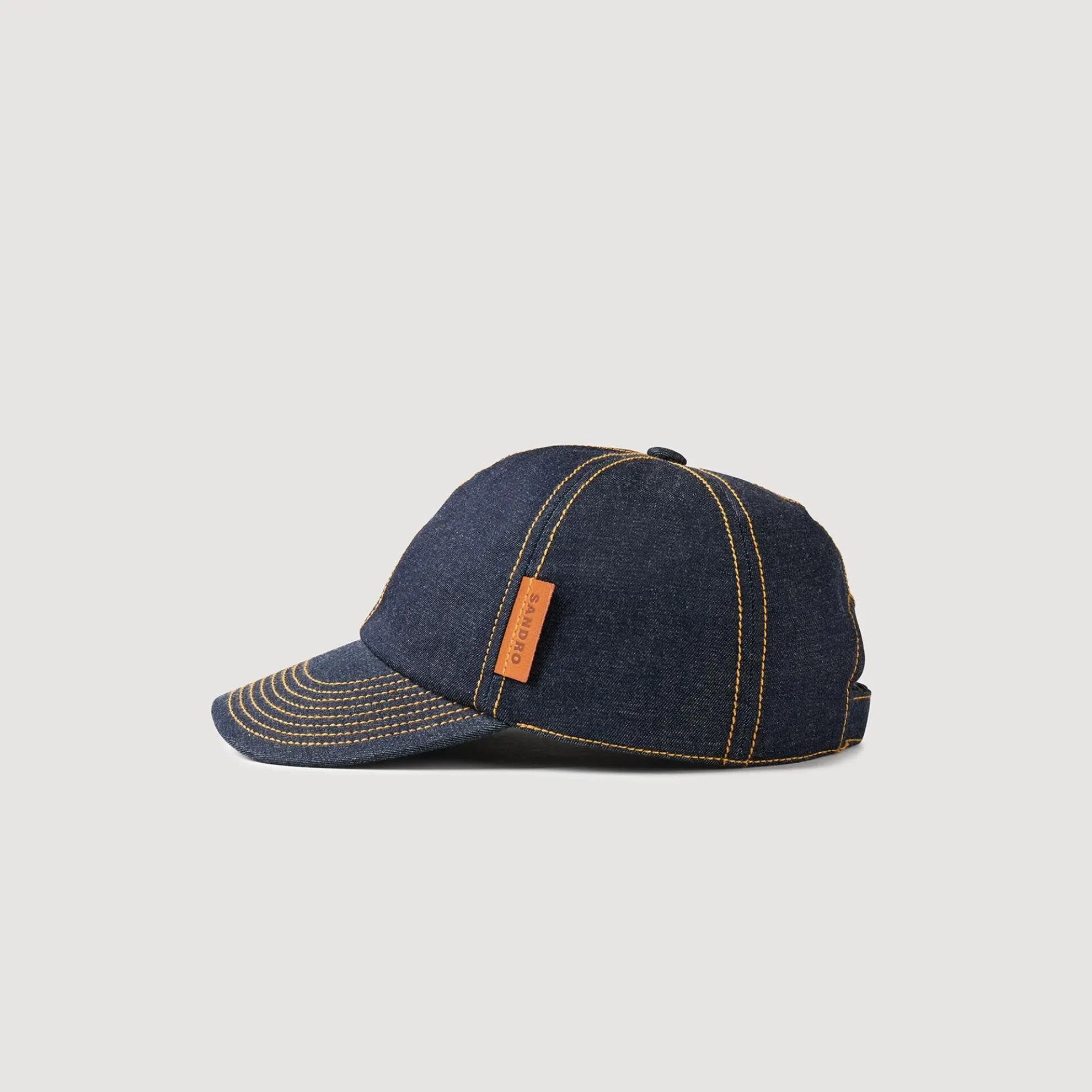 Raw denim pet met zonneklep, verstelbare band, leren SANDRO patch en contrasterende stiksels.