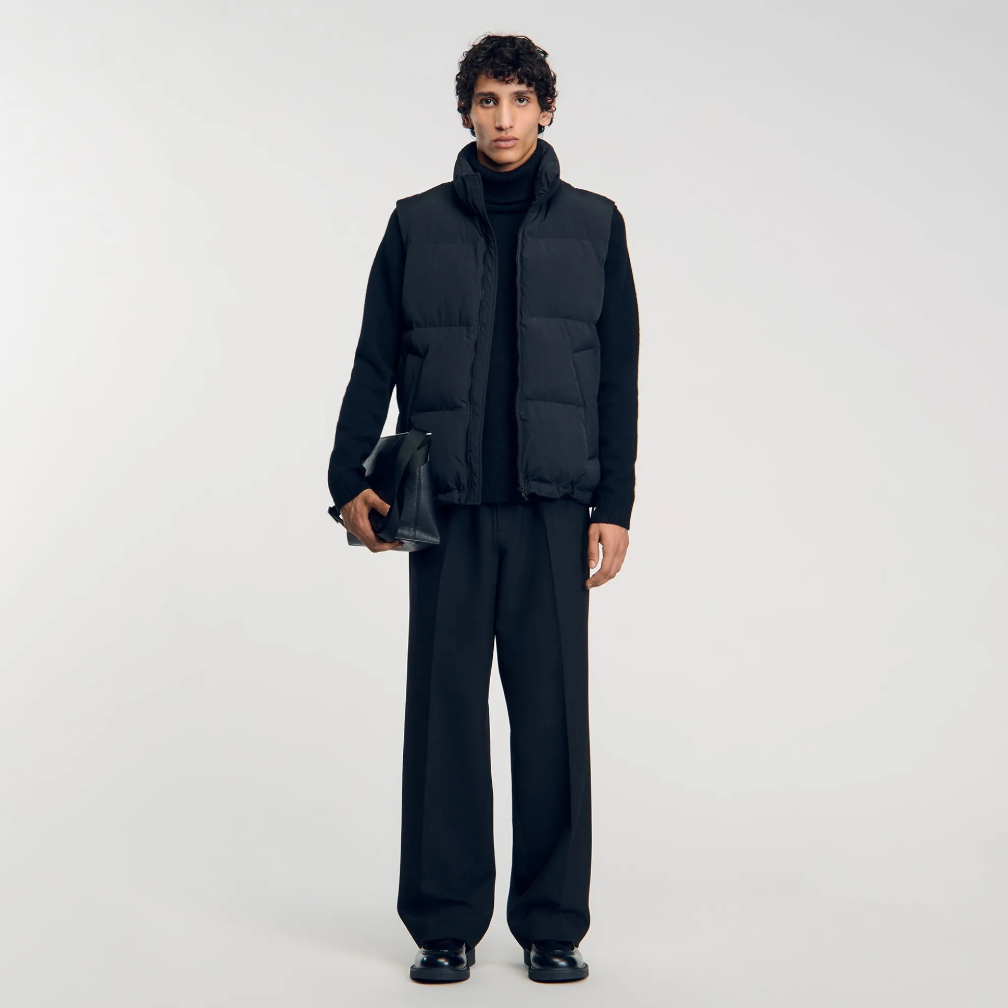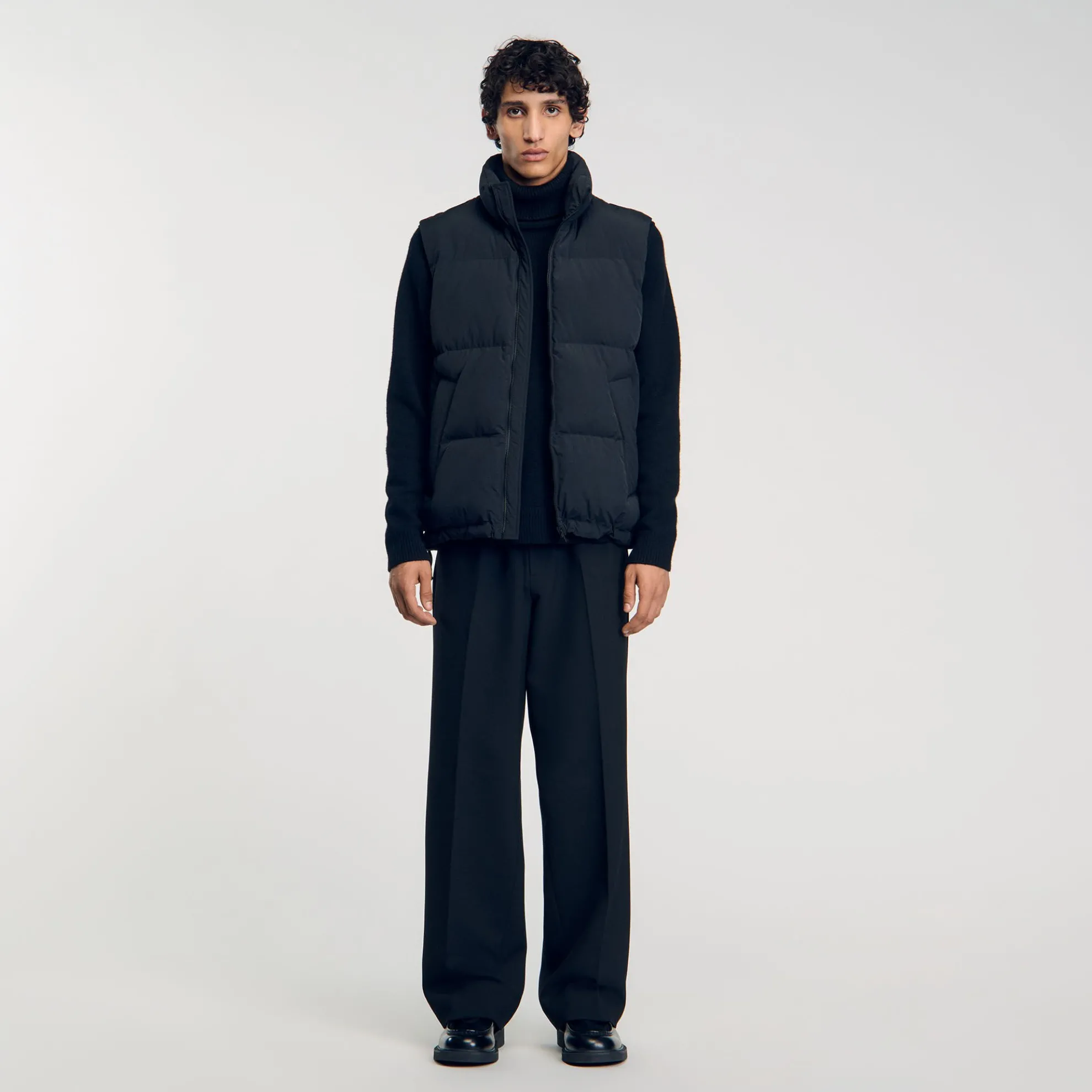 Mouwloos gewatteerd donsjack met ritssluiting, opstaande kraag en trekkoorden aan de onderkant.