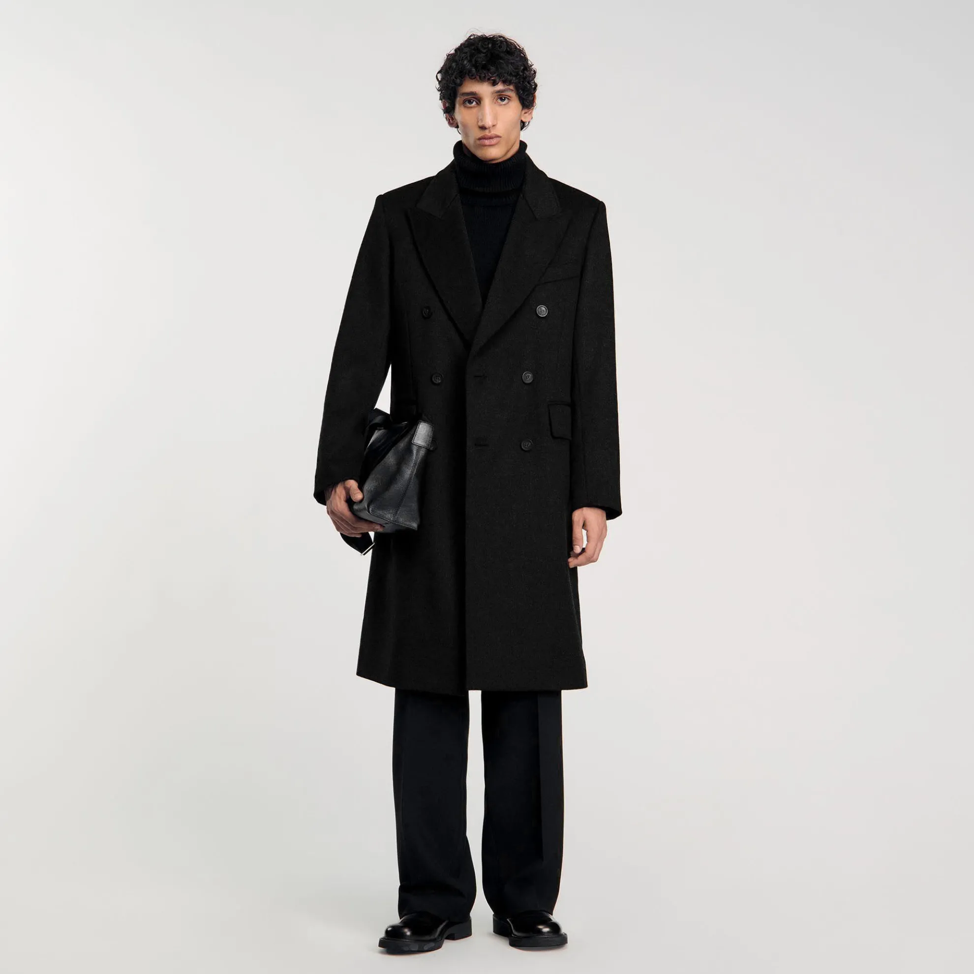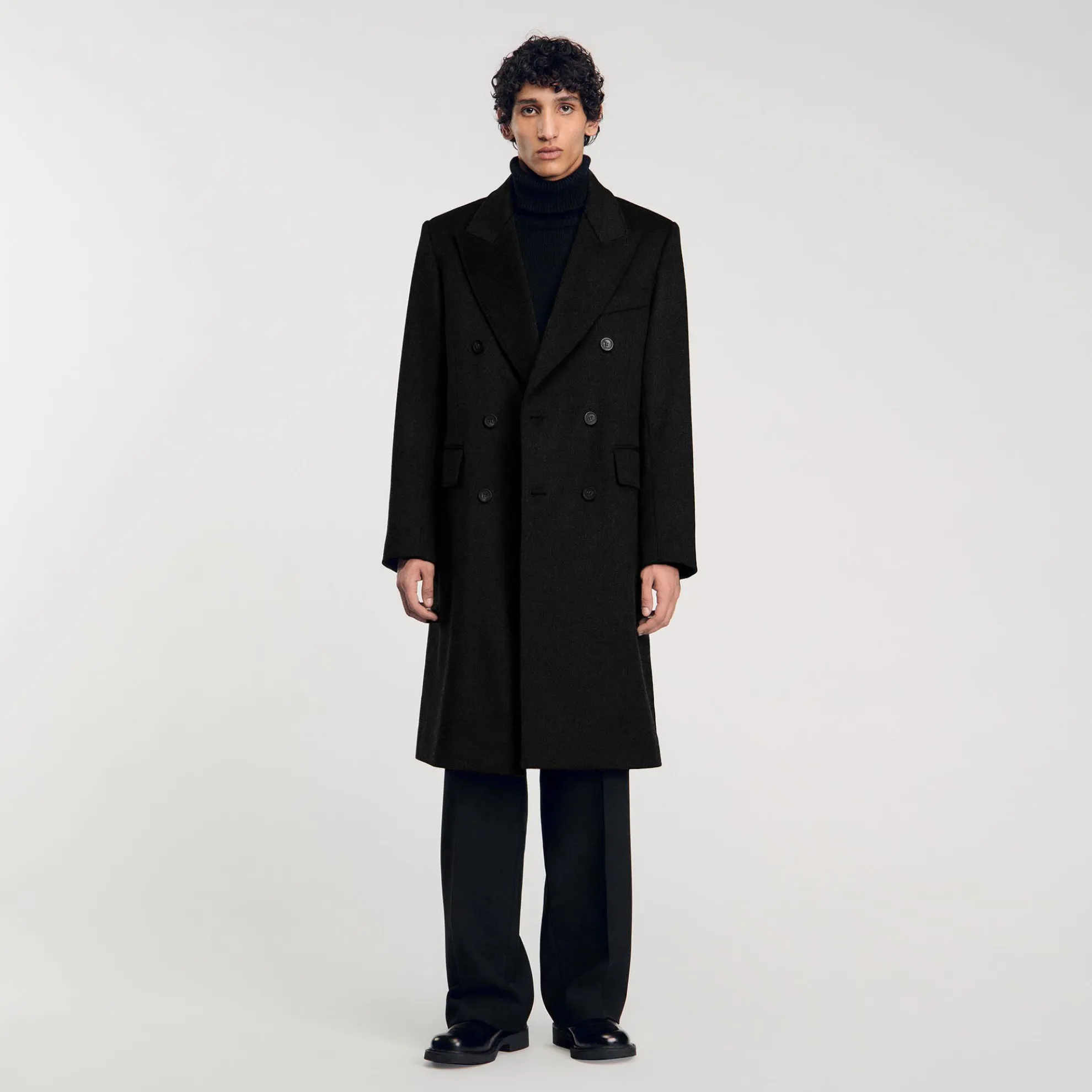 Driekwart jas met lange mouwen, dubbele knoopsluiting, klepzakken en paspelzak op de borst.