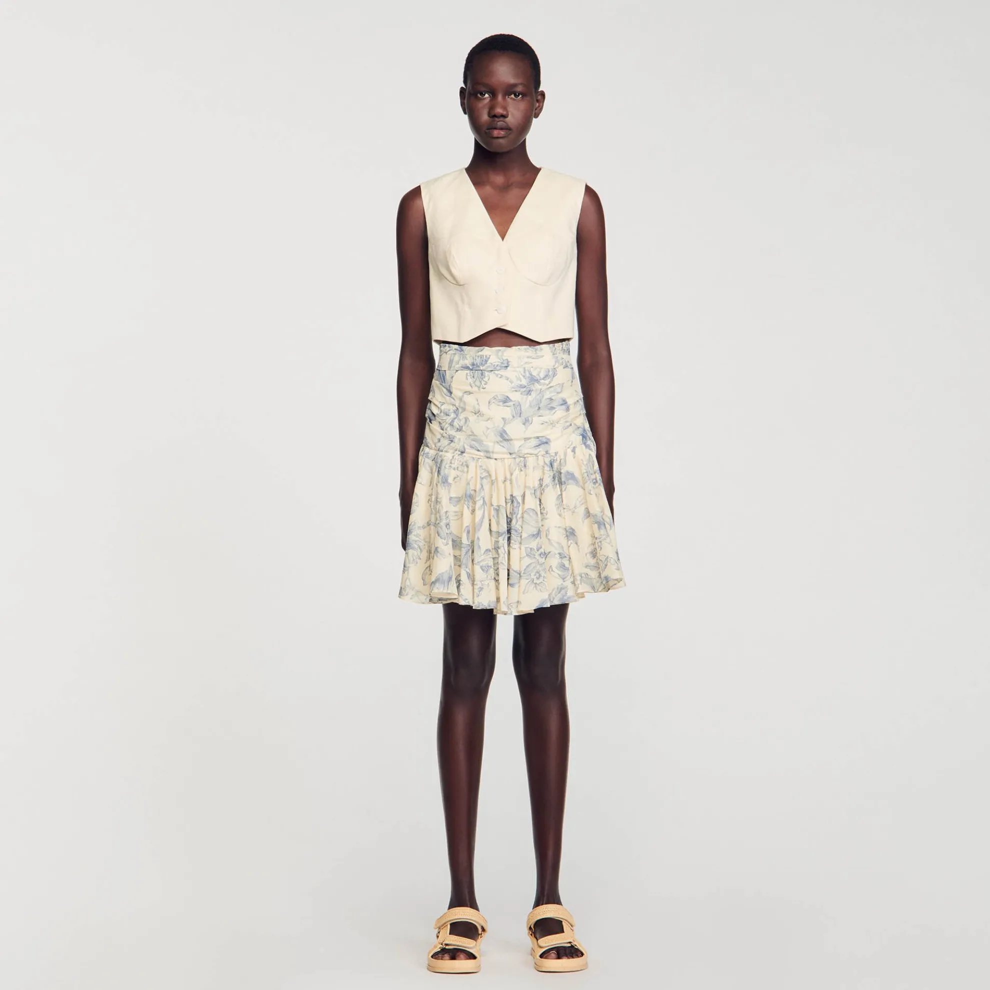 Korte gedrapeerde, geplooide rok met een all-over bloemenprint.