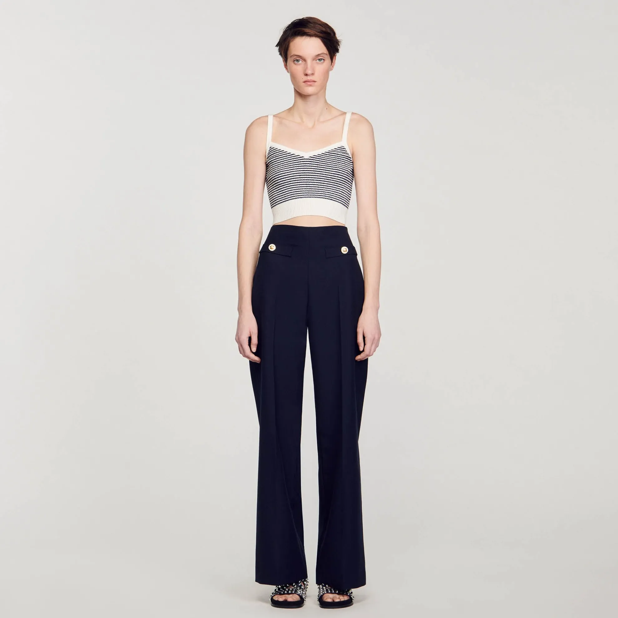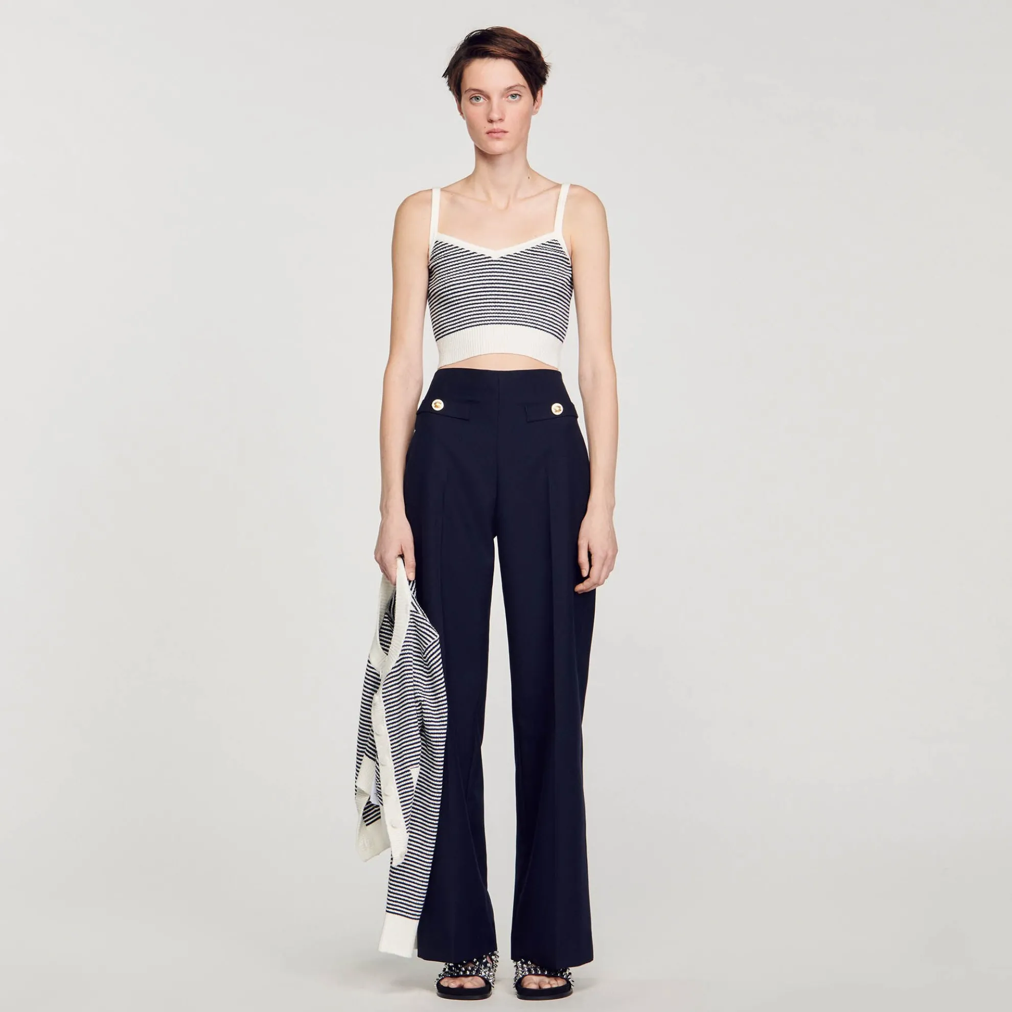 Gebreide korte brassière van gestreepte bouclé stof met dunne schouderbandjes en contrasterende geribde boorden.
