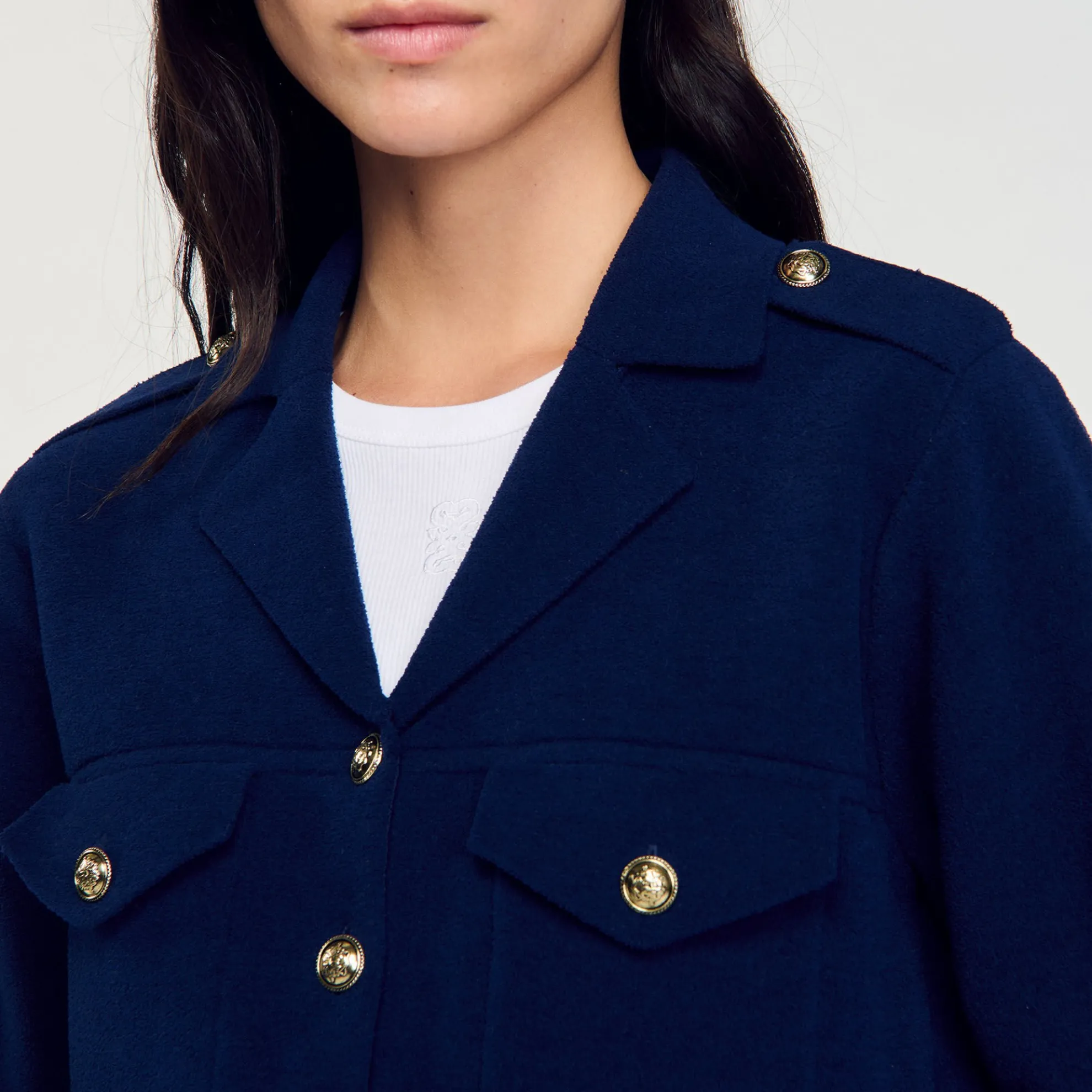 Cardicoat met een overhemdkraag, lange mouwen, knoopsluiting en opgestikte borstzakken met kleppen.