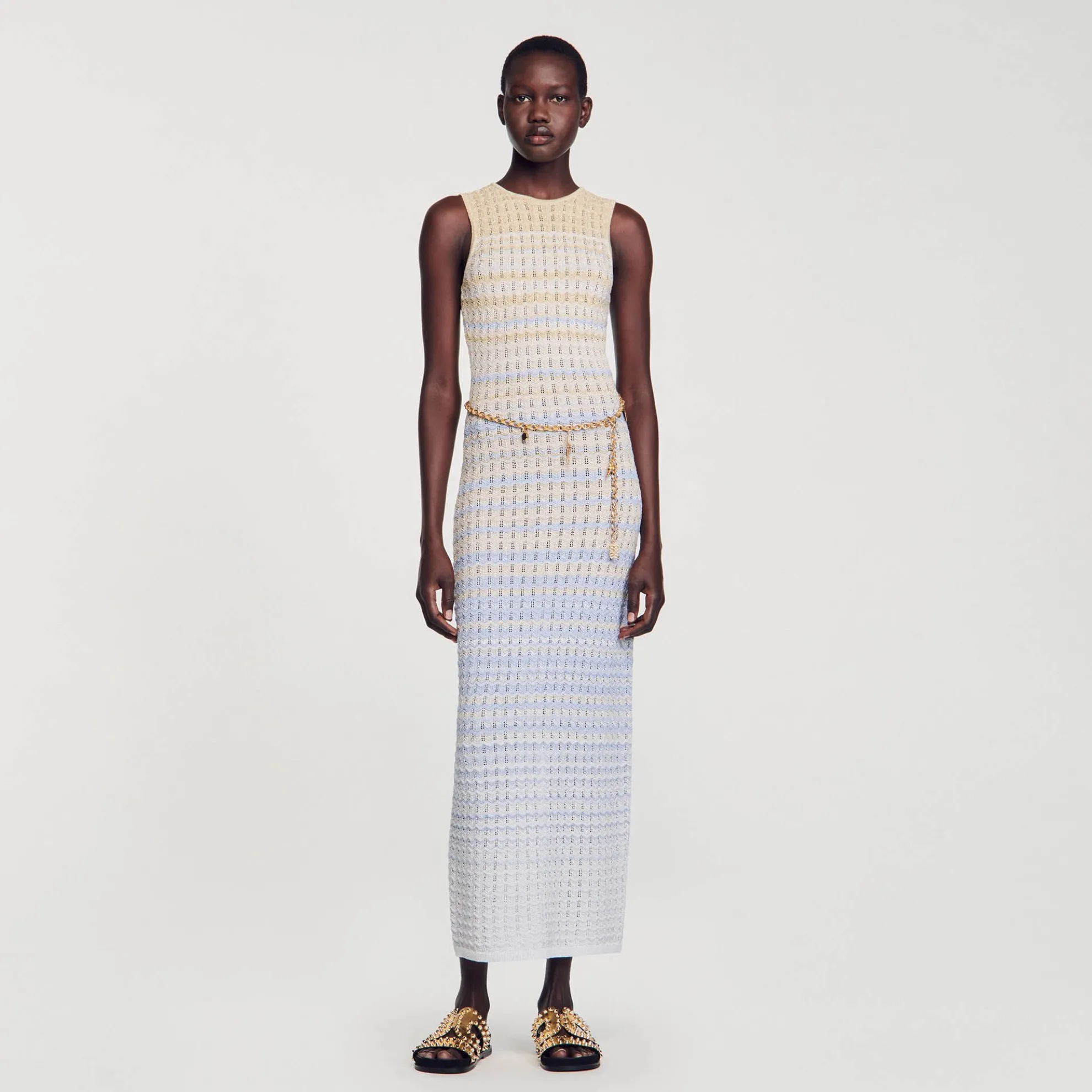 Pointillé gebreide lange jurk in kleurverloop zonder mouwen met een ronde hals.
