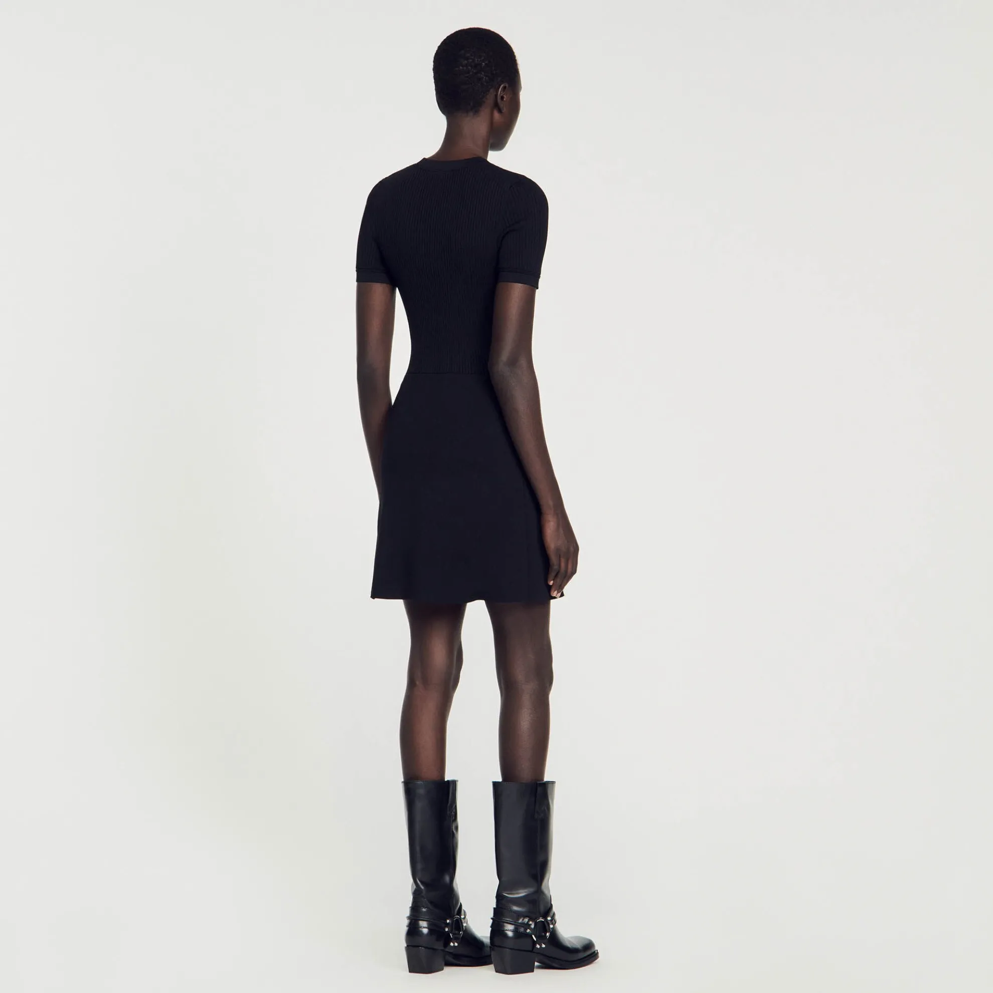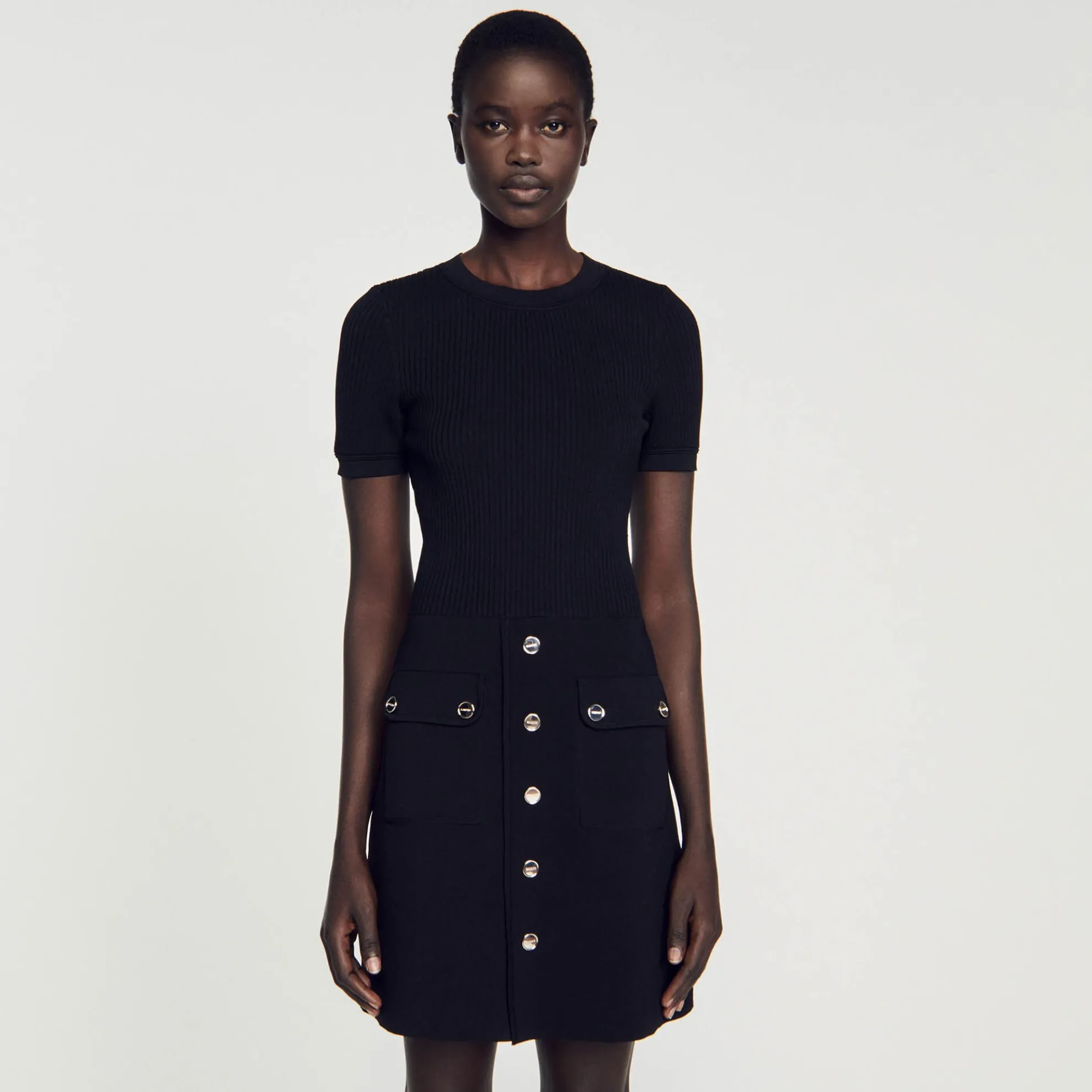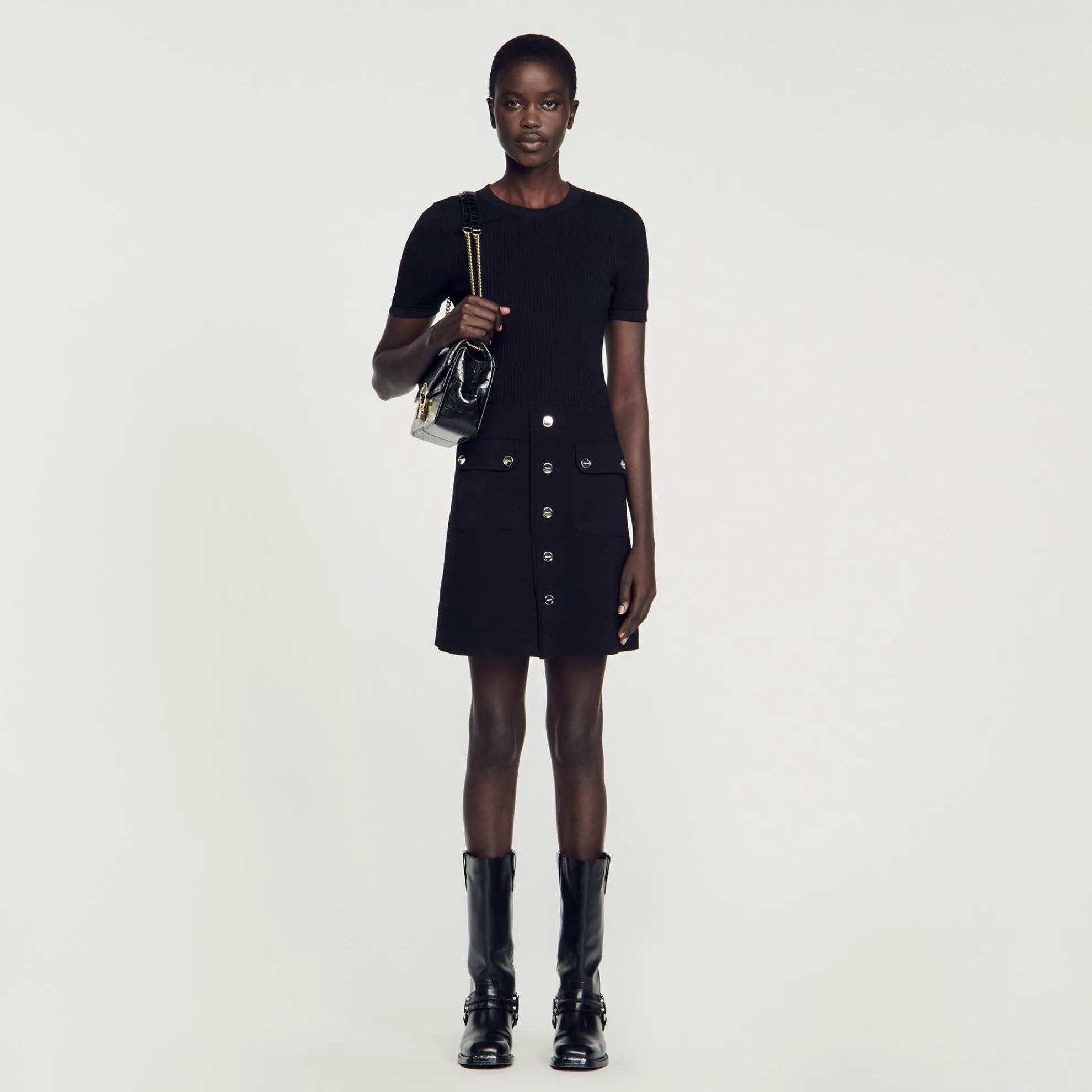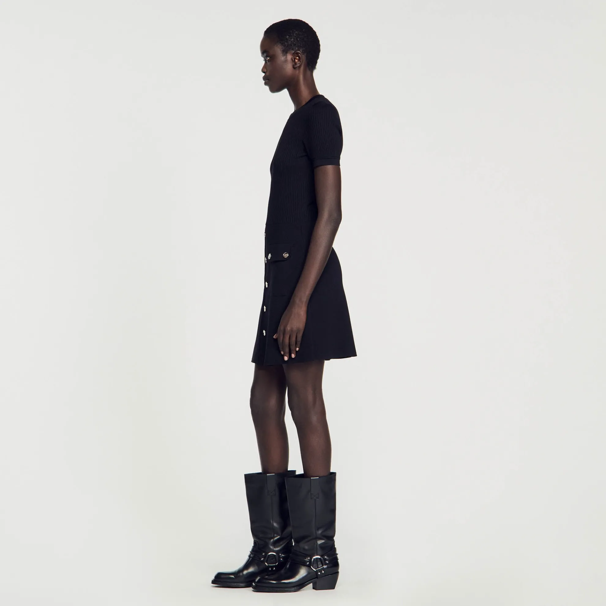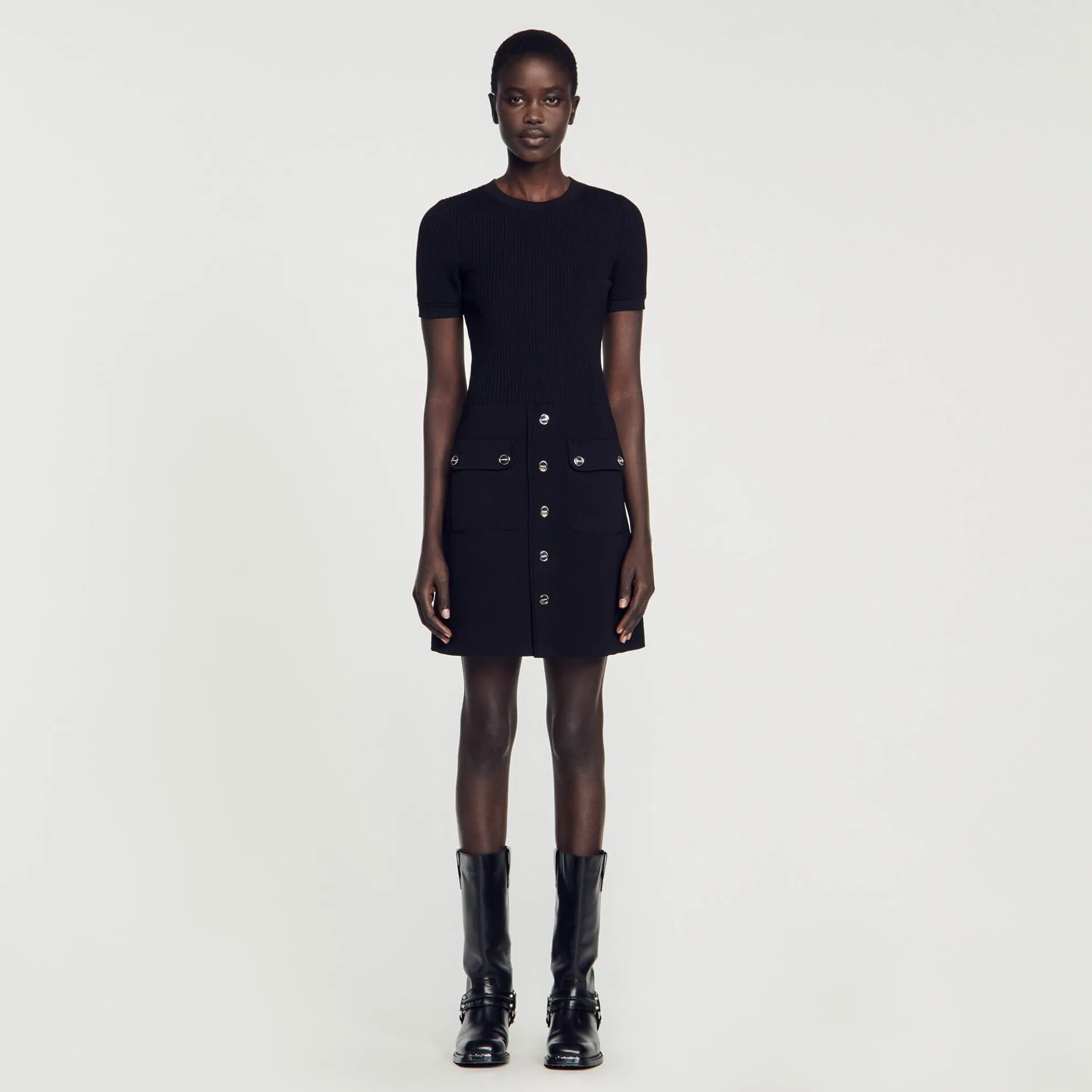 Mouwloze, gebreide korte jurk met uitlopende zoom en opgestikte klepzakken.