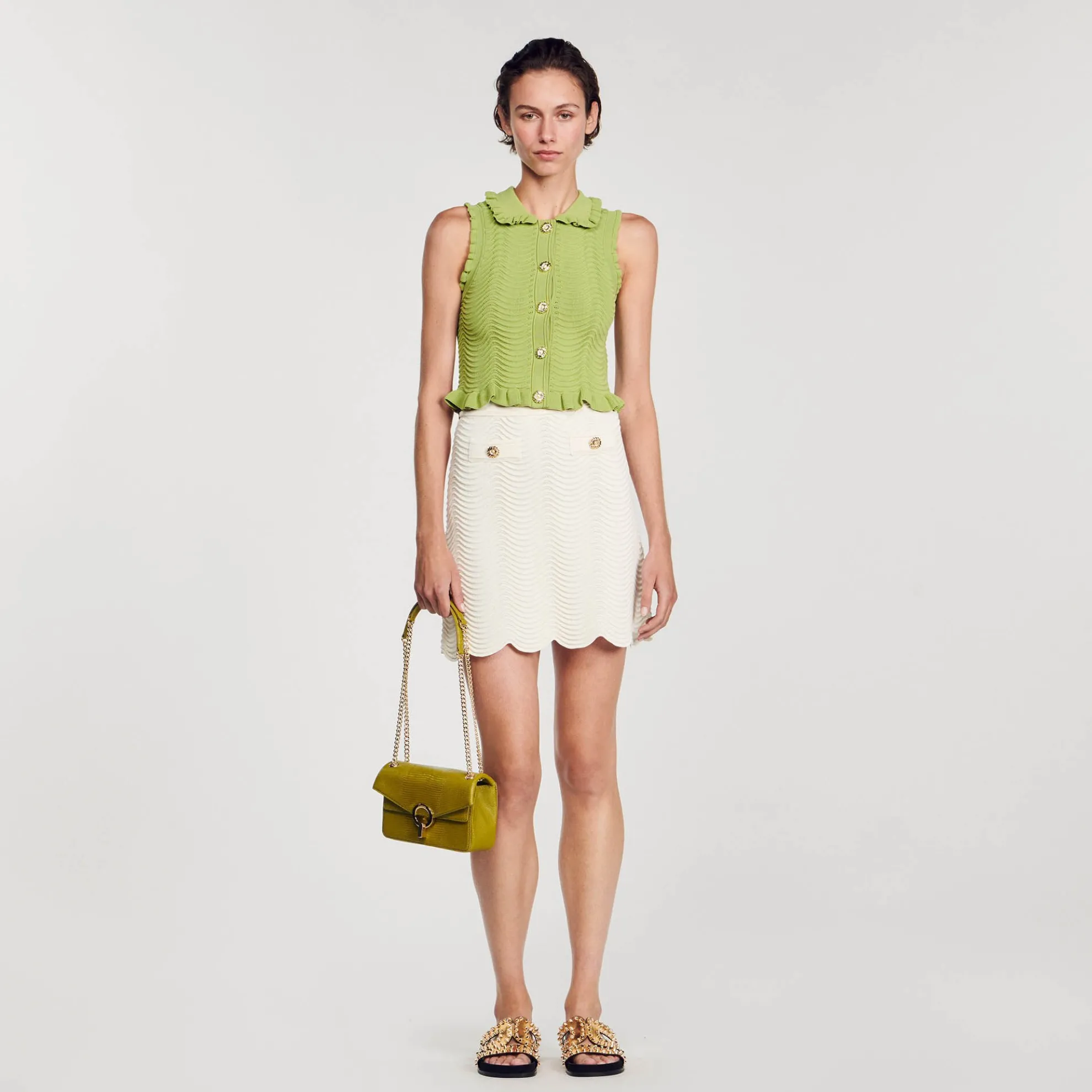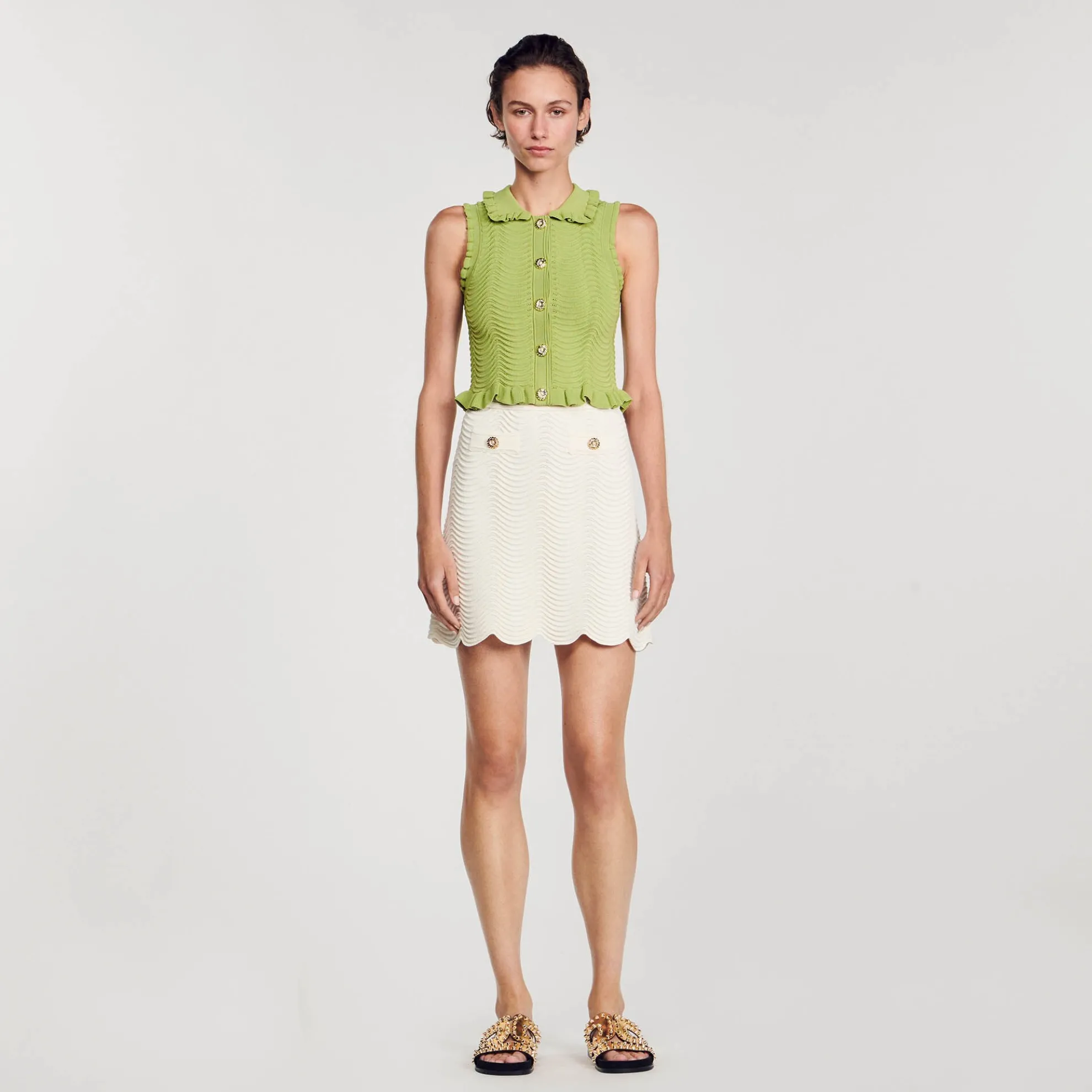 Mouwloze top van gestructuurd breiwerk met sierknoopsluiting, Claudine-kraag en volants aan de randen.