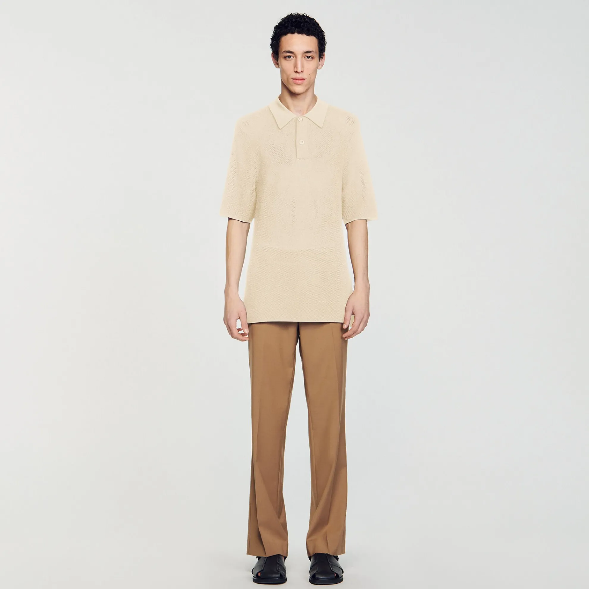 Lange polo van semi-transparant opengewerkt breisel met button-down polokraag en korte mouwen.