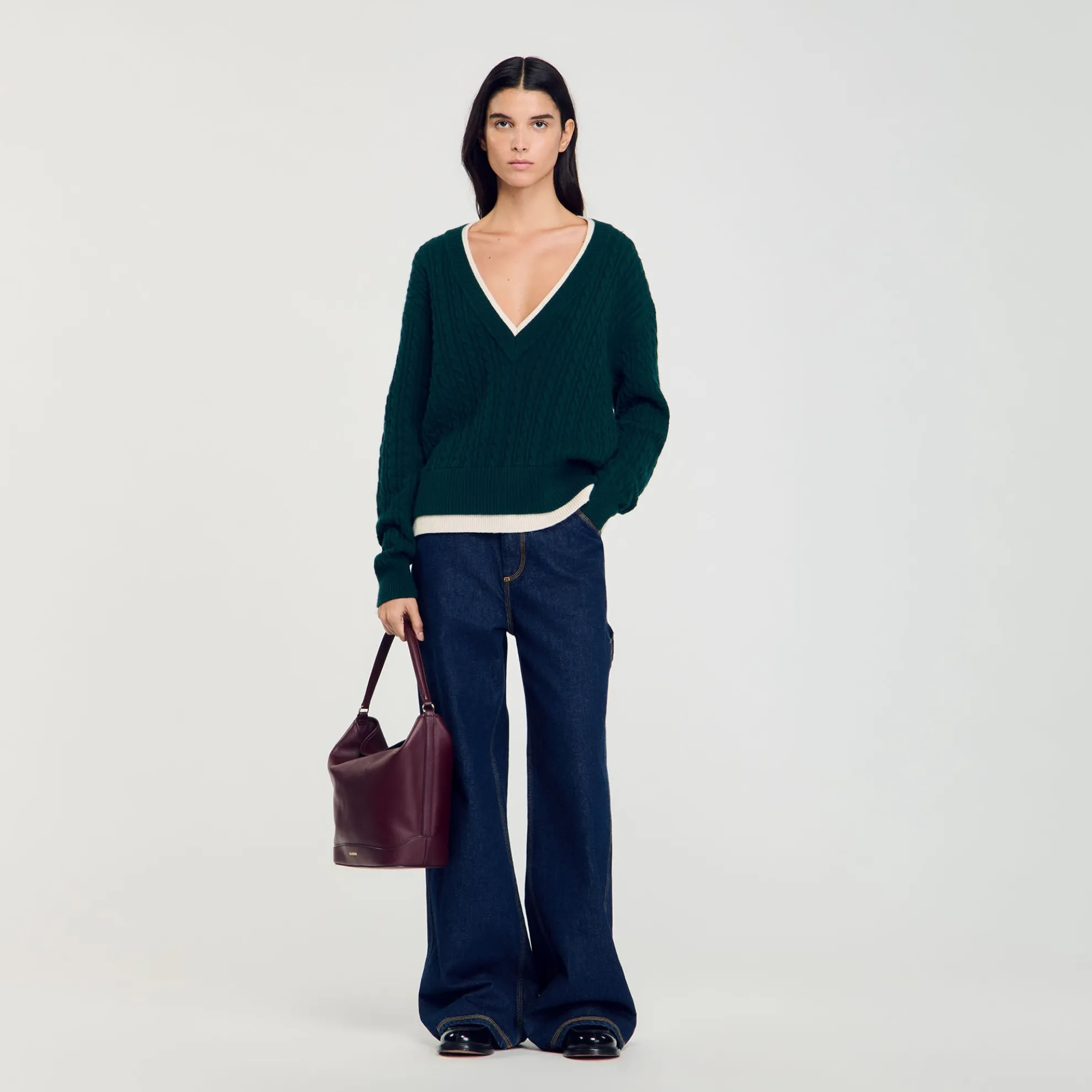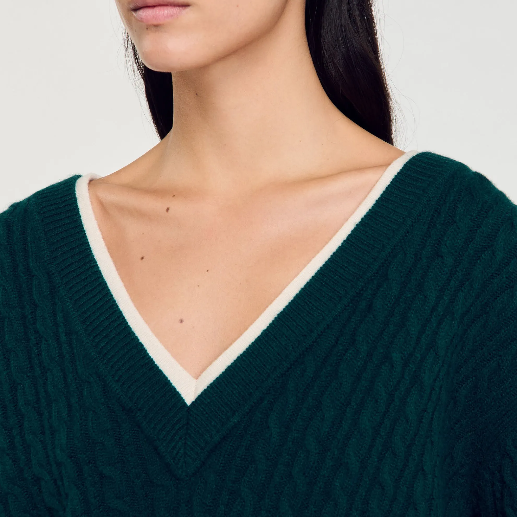Tweekleurige kabelgebreide trui met trompe l’œil van wol en kasjmier met lange mouwen en een V-hals.