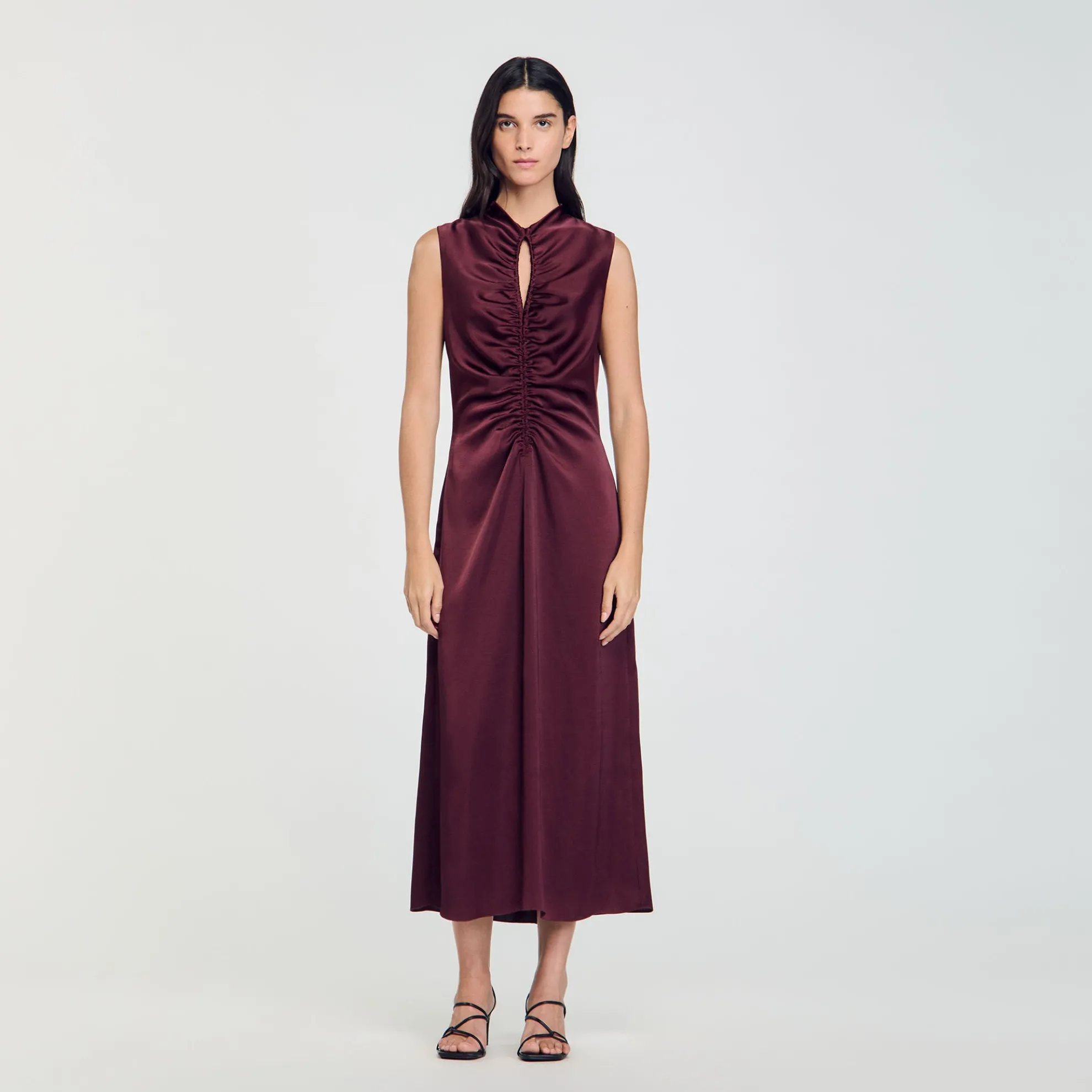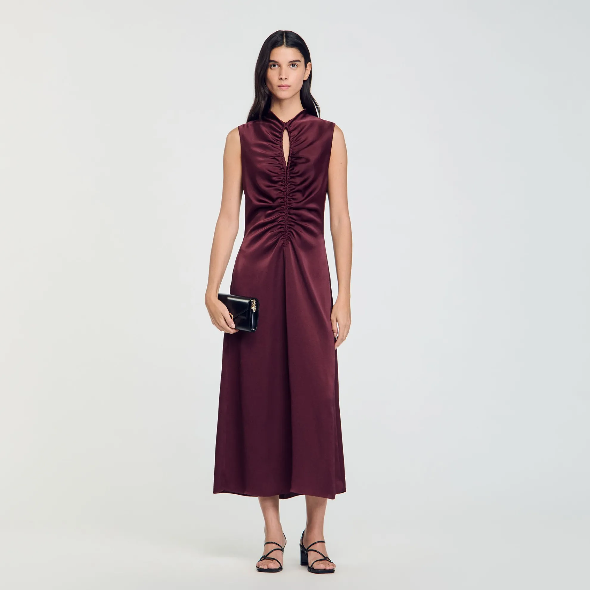 Mouwloze satijnen jurk met een ronde hals met druppelvormig decolleté en ruches aan de voorkant.