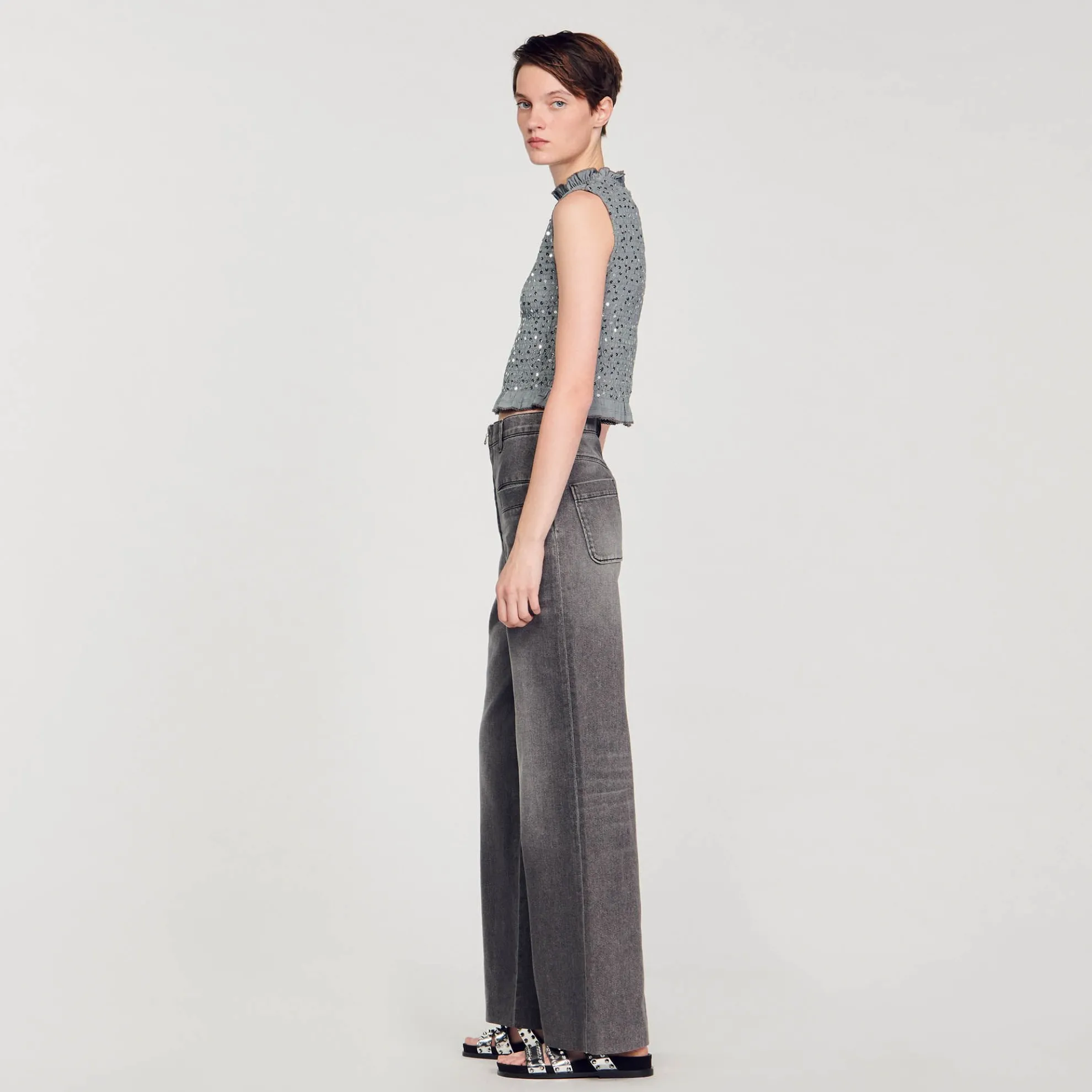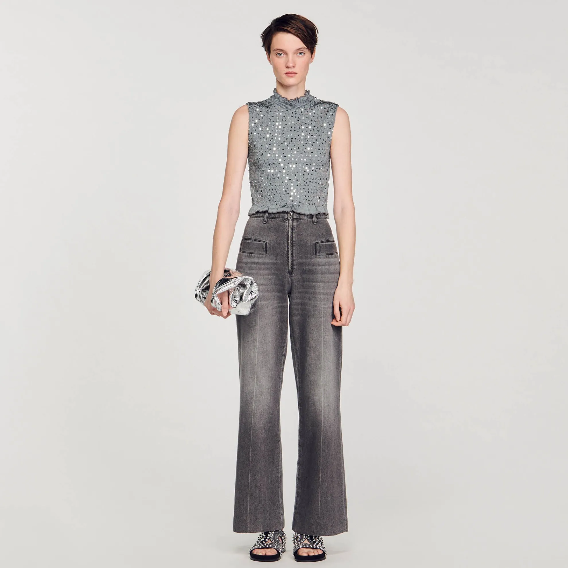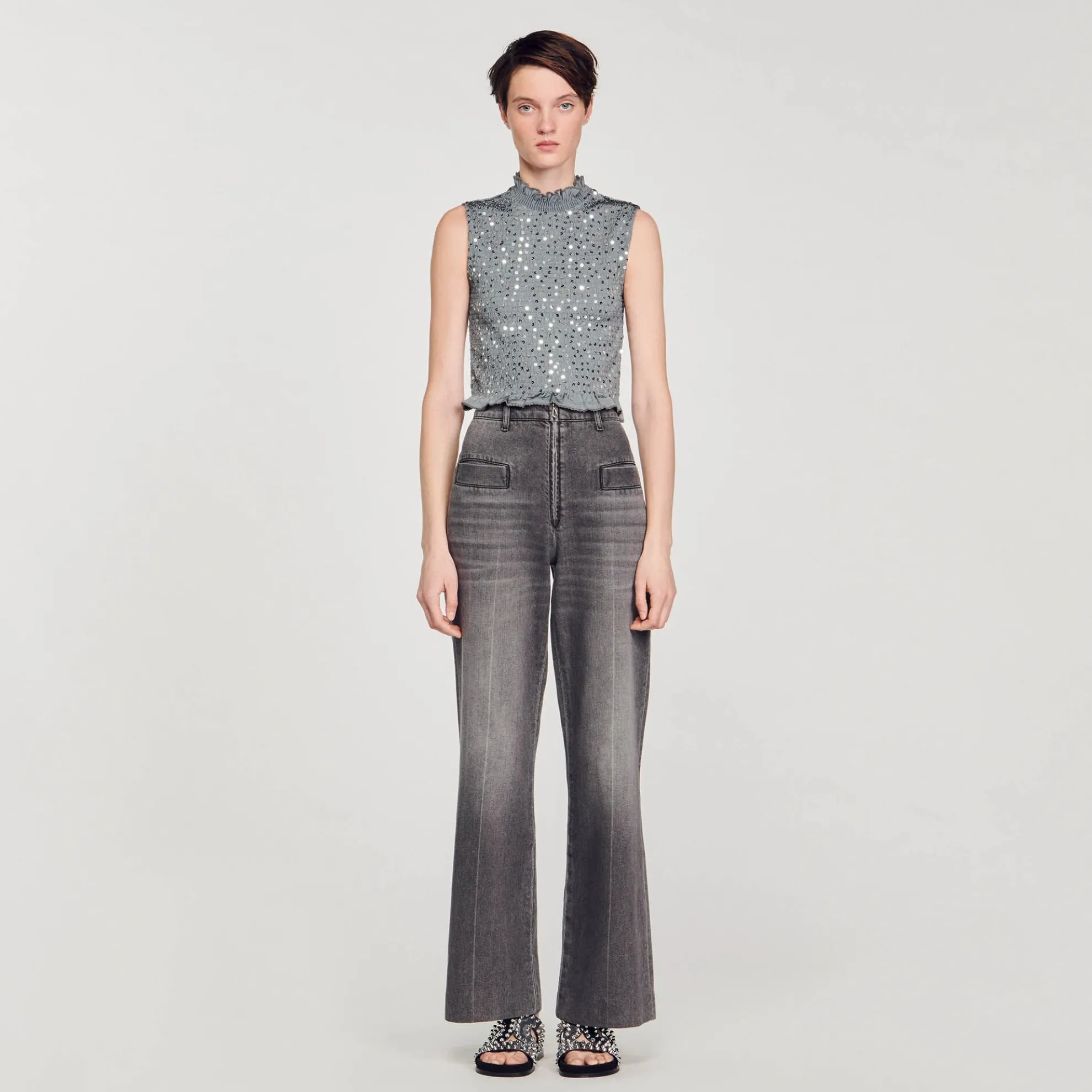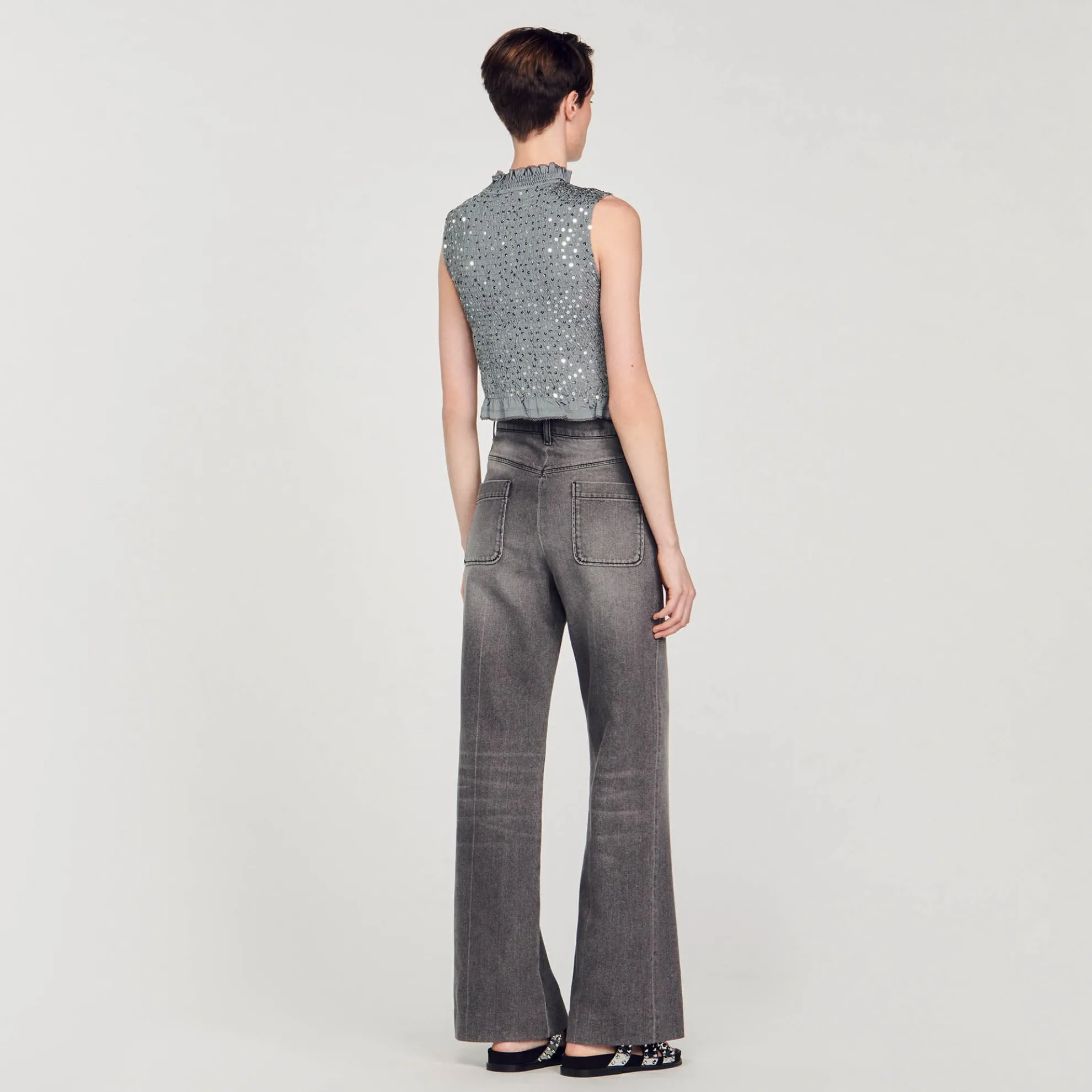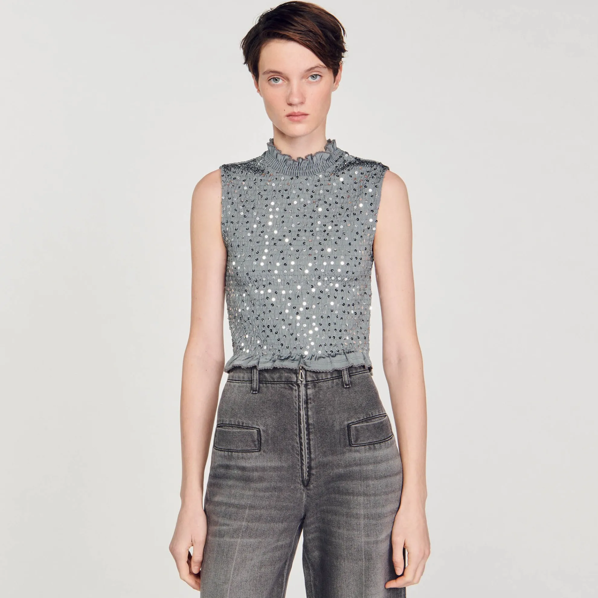 Korte mouwloze top, gesmokt en geborduurd met pailletten, met een opstaande hals en volants aan de onderkant.