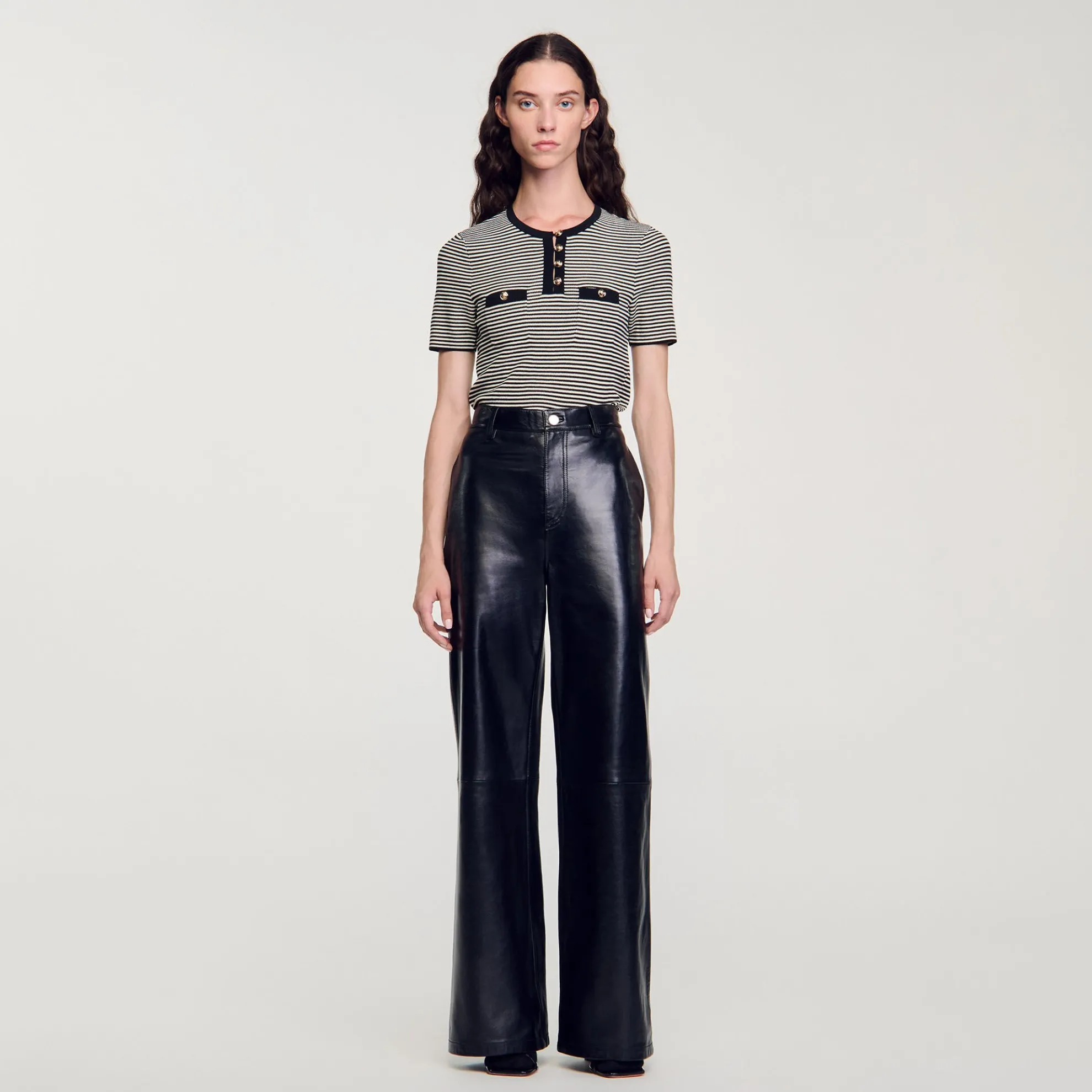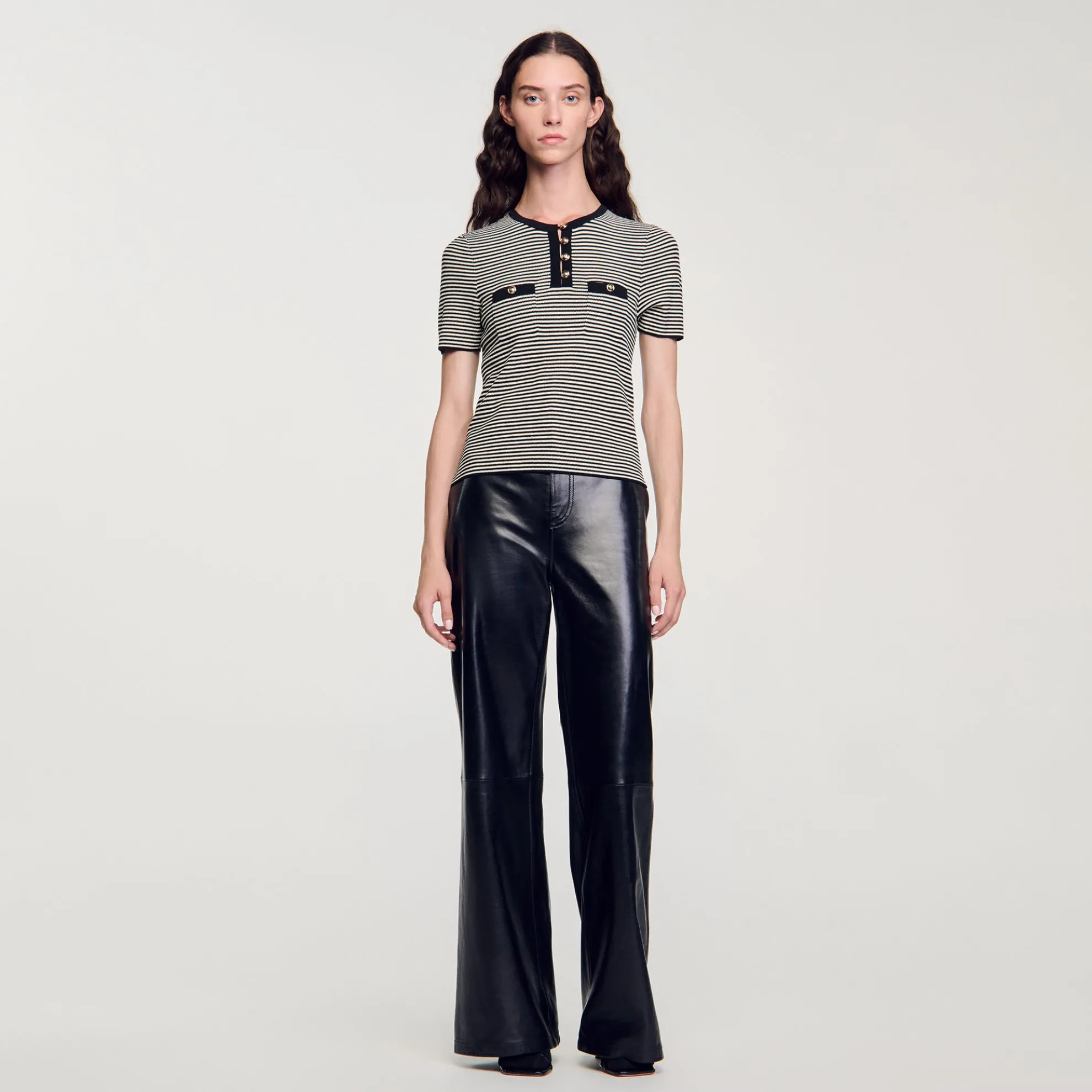 Gestreepte gebreide trui met ronde hals, korte mouwen, knoopsluiting en opgestikte zakken op de borst.