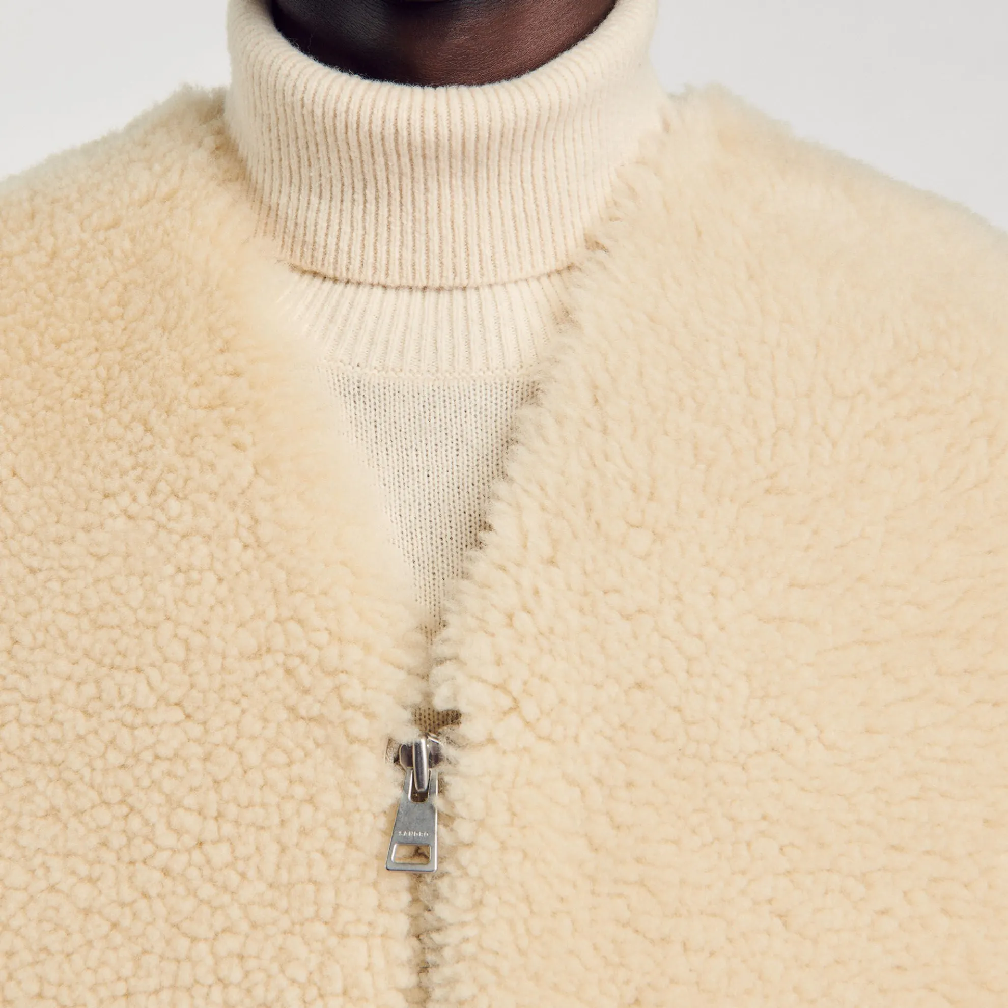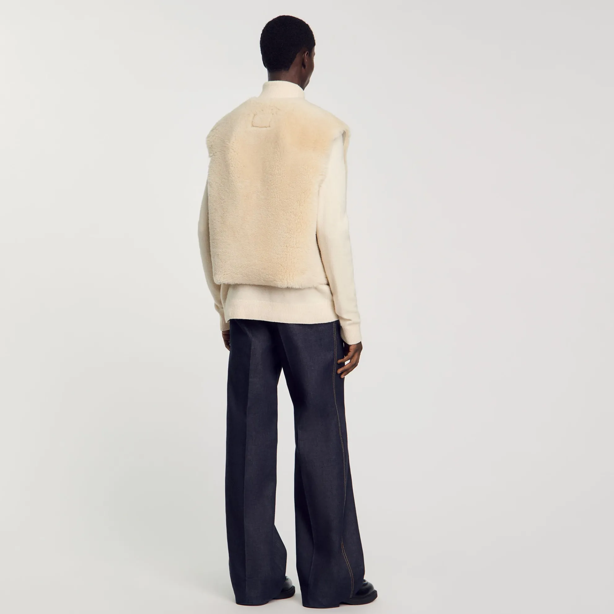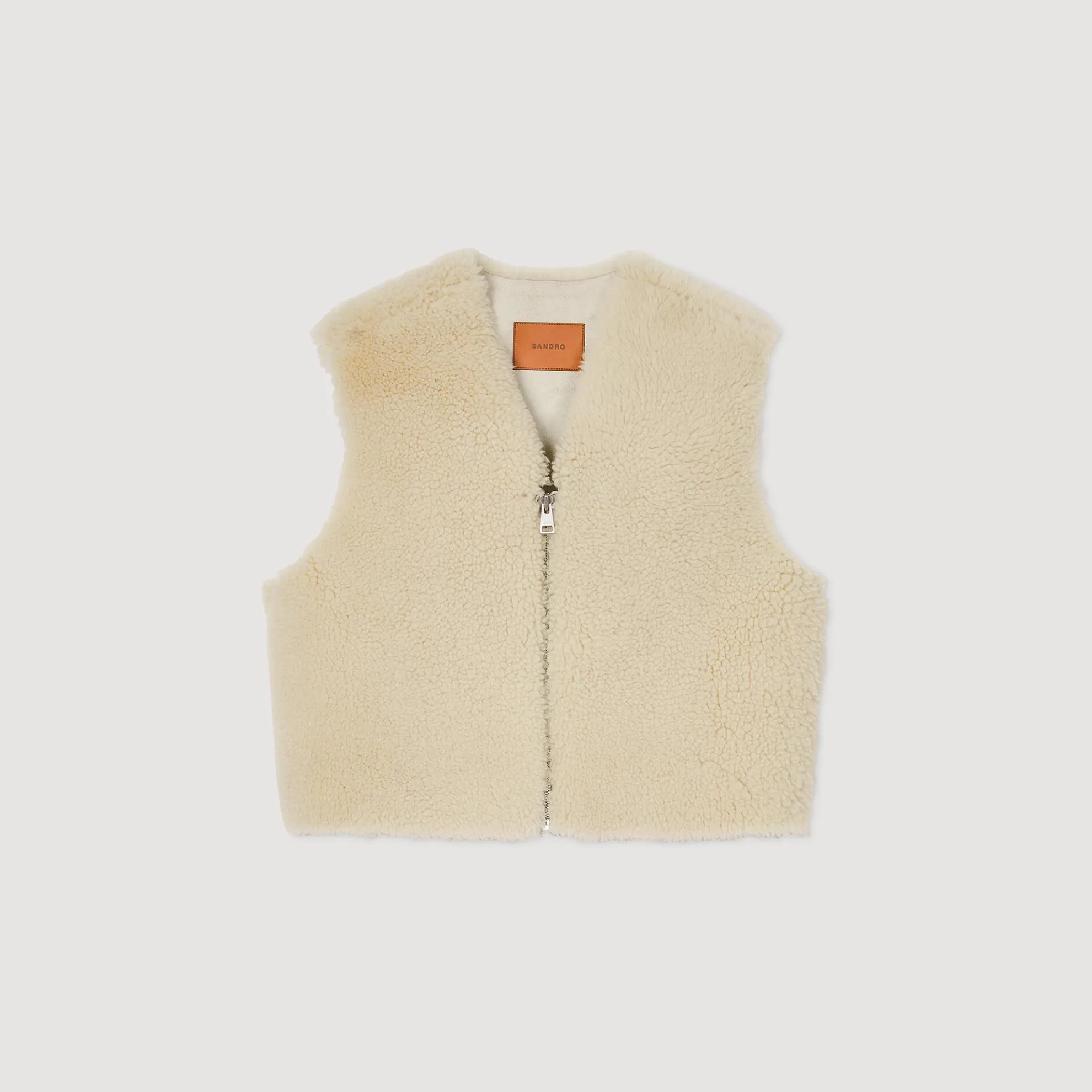 Mouwloos gilet van omgekeerd schapenvacht met ritssluiting aan de voorkant.