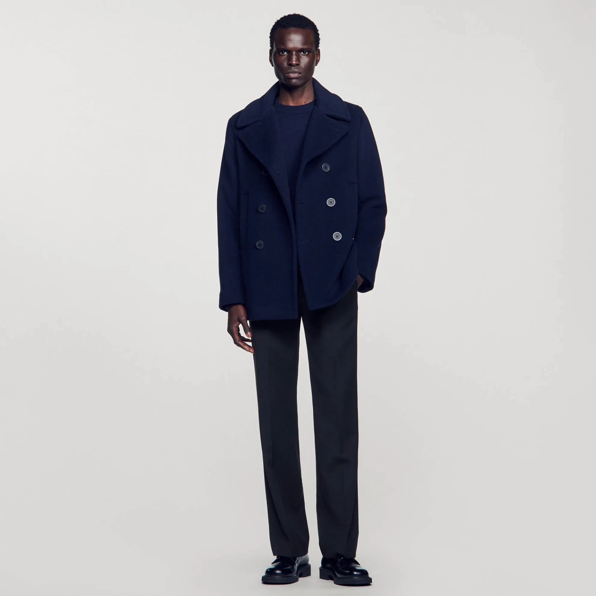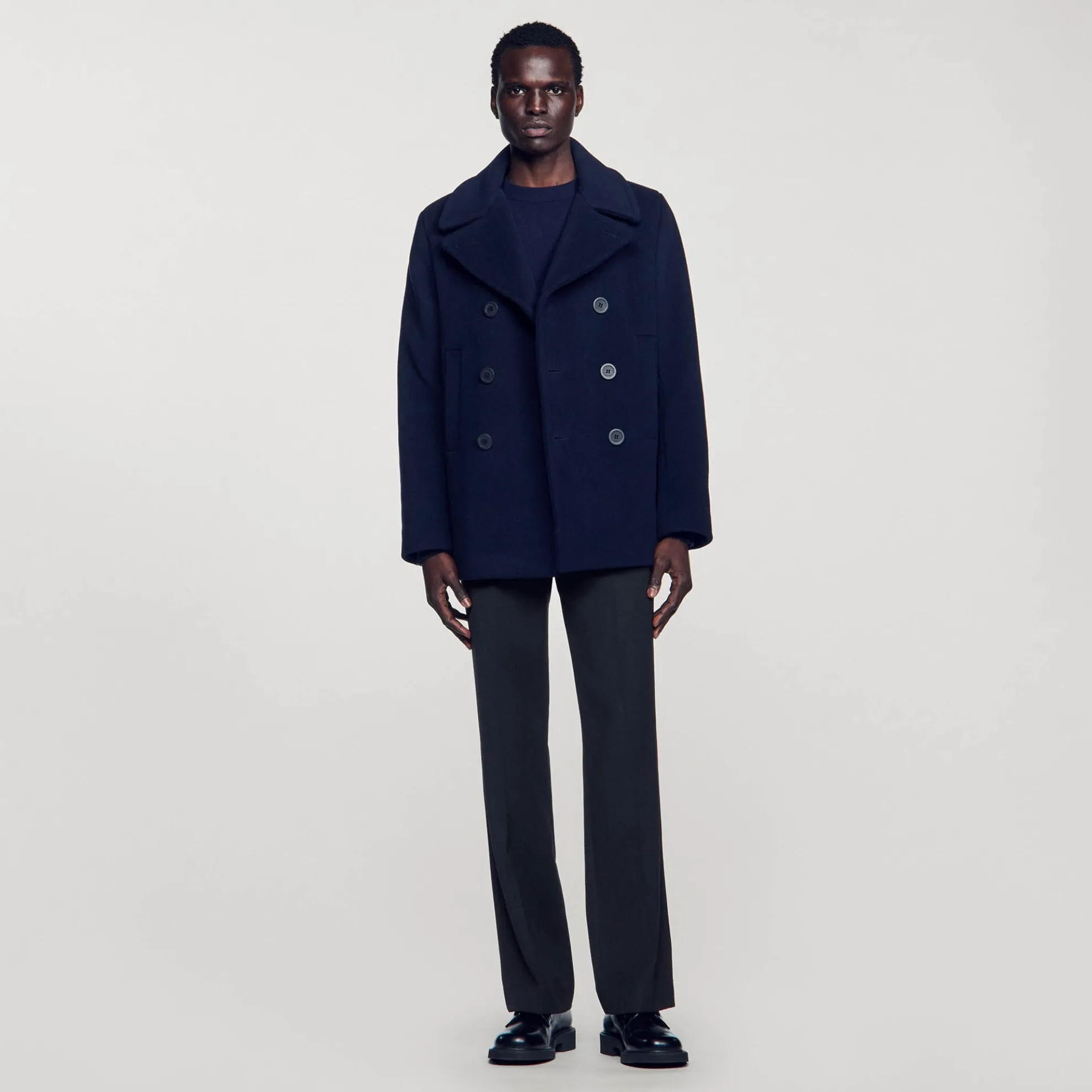 Rechte jas van wolmix in kaban stijl met een reverskraag, lange mouwen en een dubbele rij knopen.