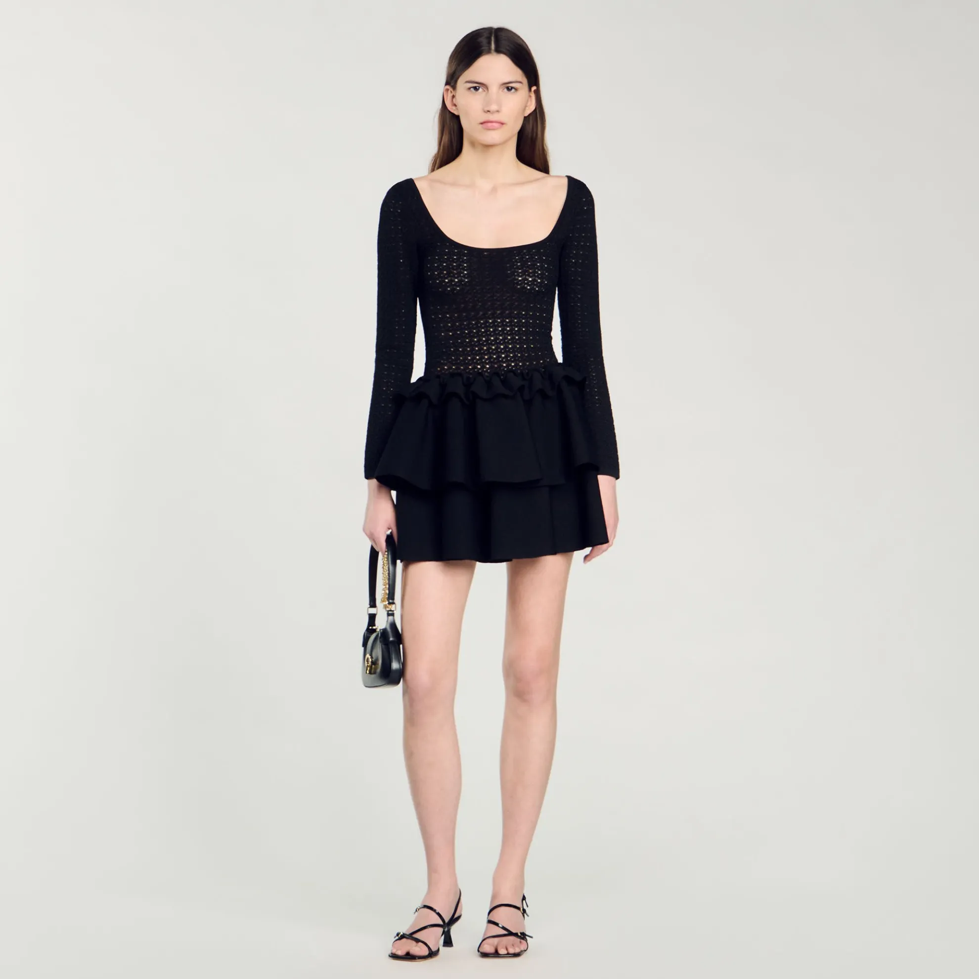 Jurk met trompe l’œil-effect met een gebreide top met ronde kraag en lange mouwen en een wijde rok met ruches.