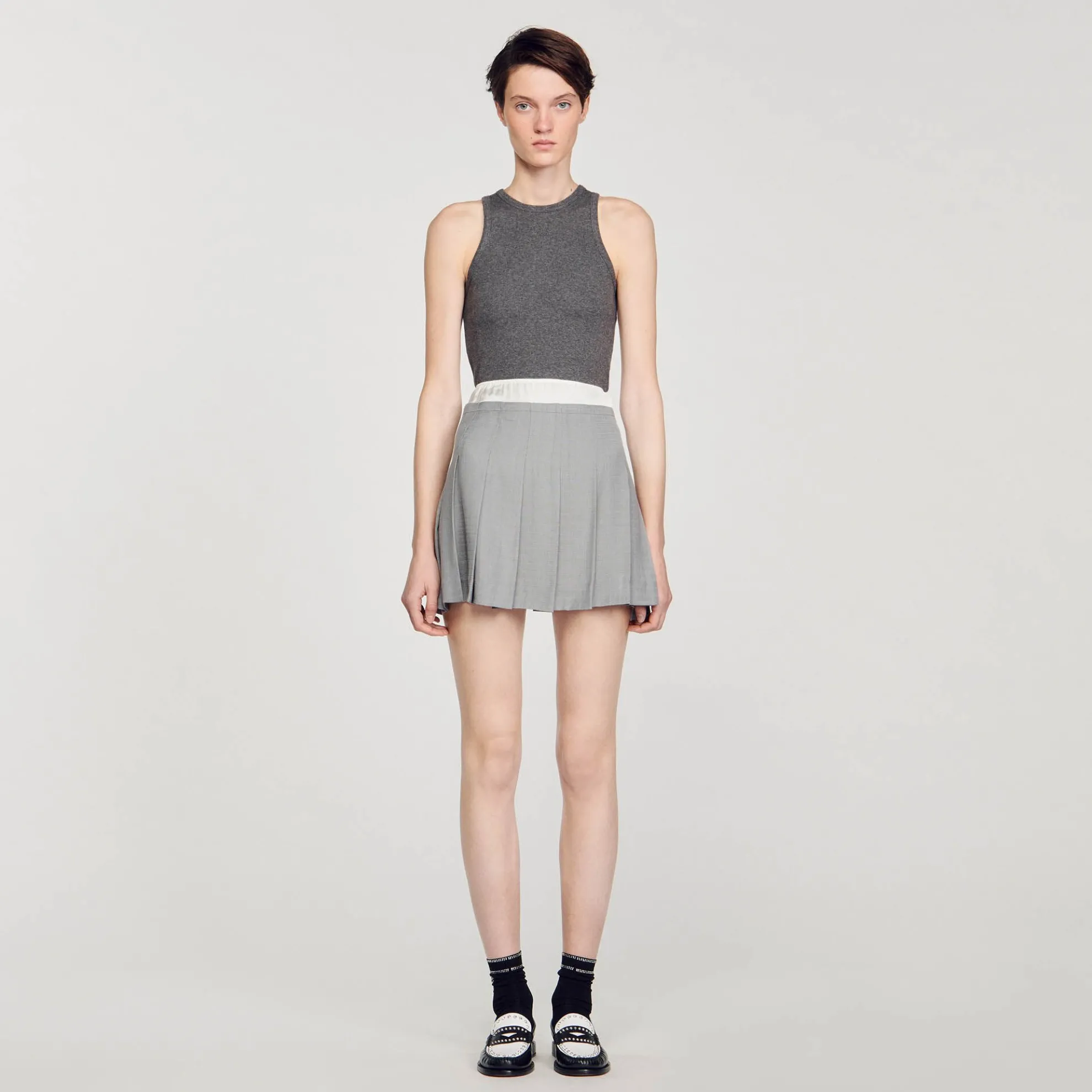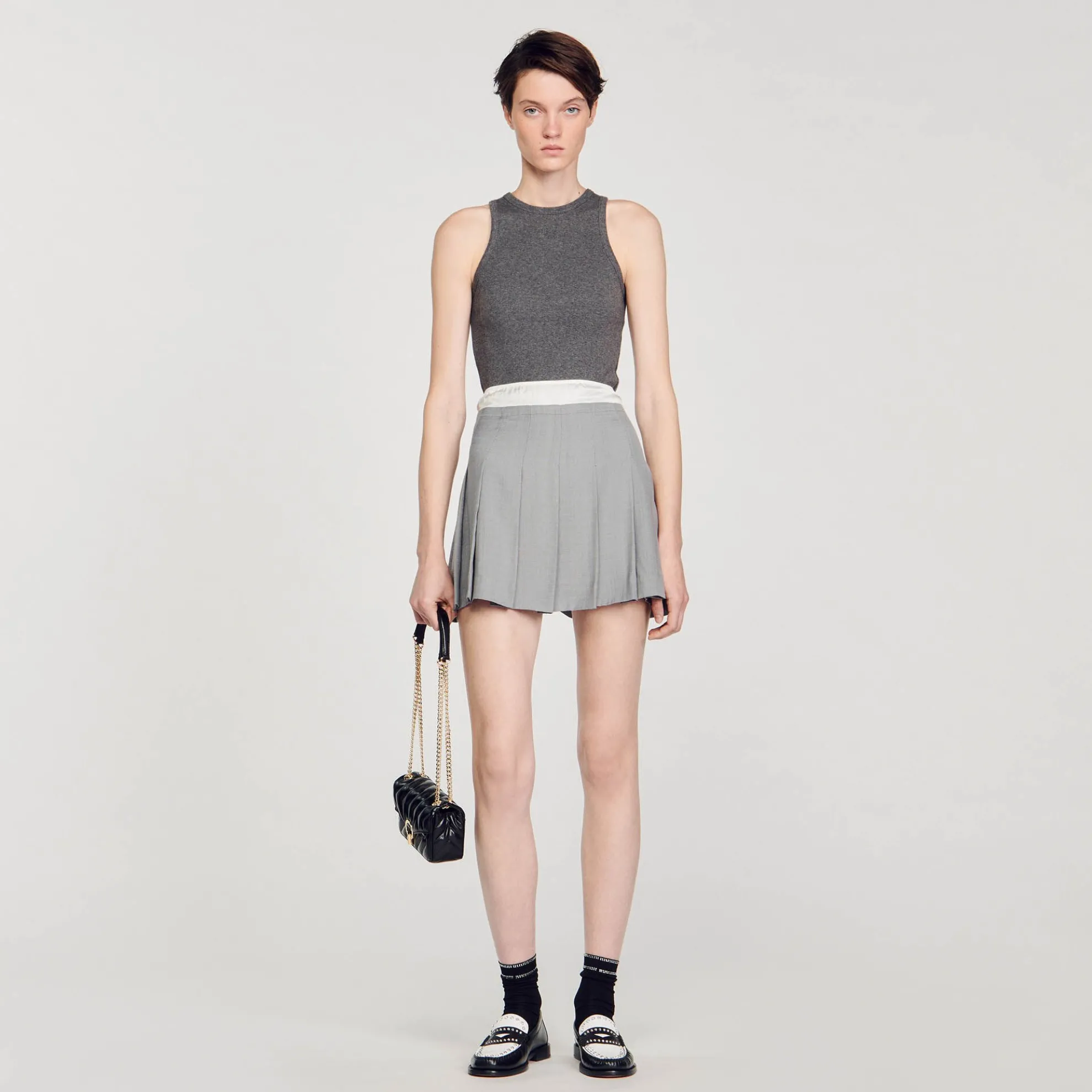 Korte rok met plooien met trompe-l’oeil-effect en contrasterende satijnen elastische riem.