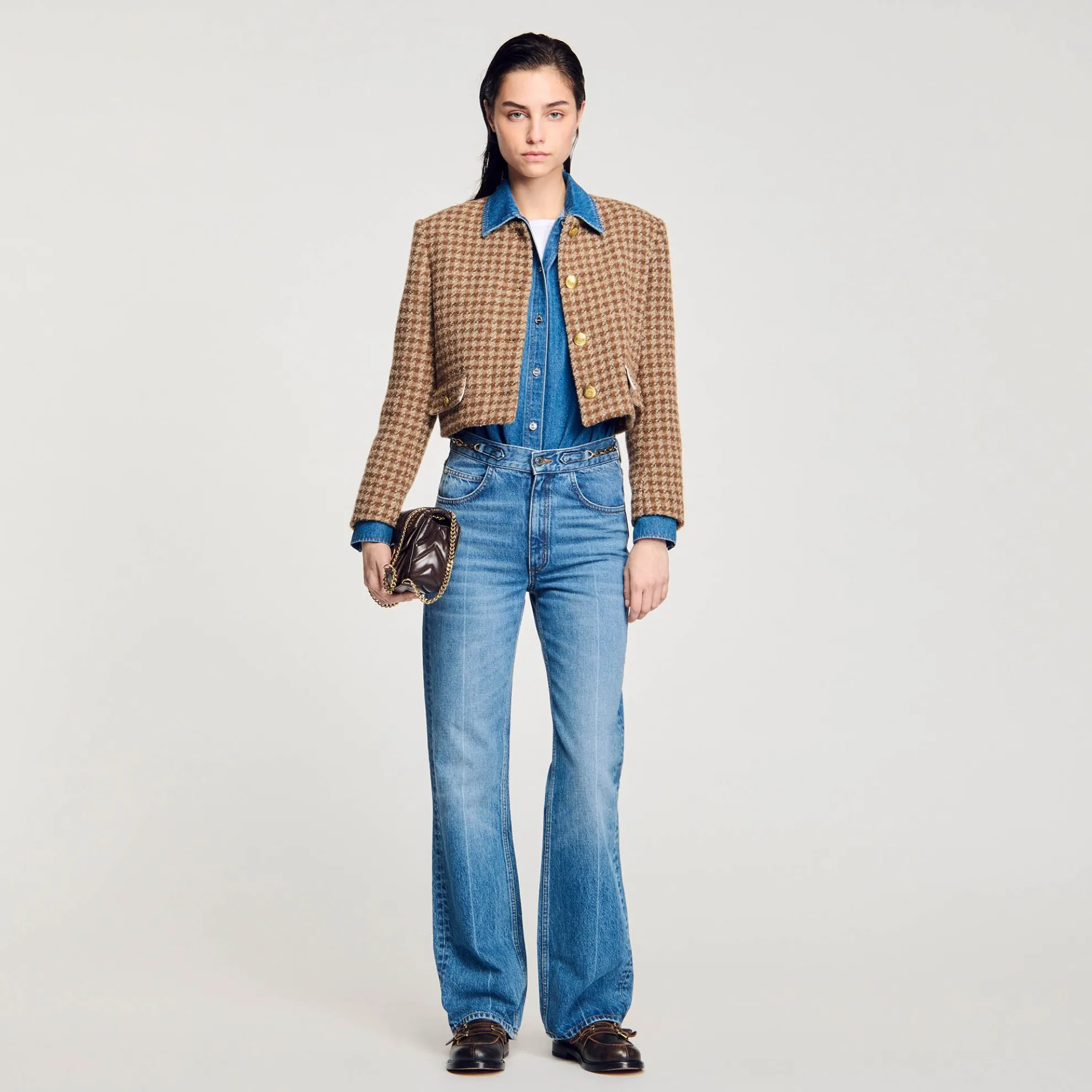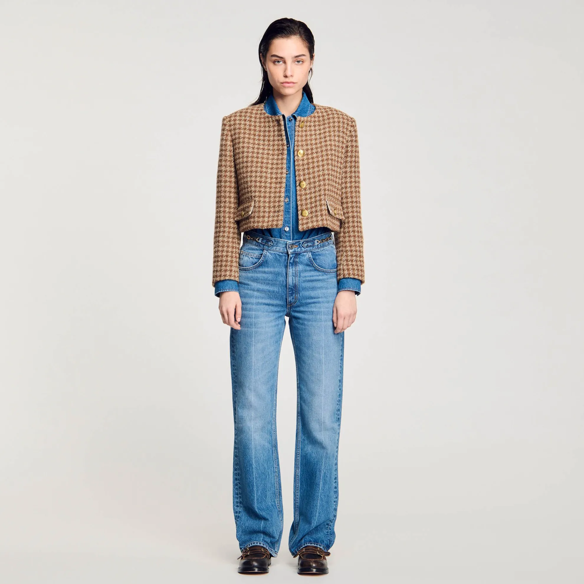 Kort, gestructureerd geruit jasje met sierknoopsluiting, lange mouwen en klepzakken aan de zijkanten.