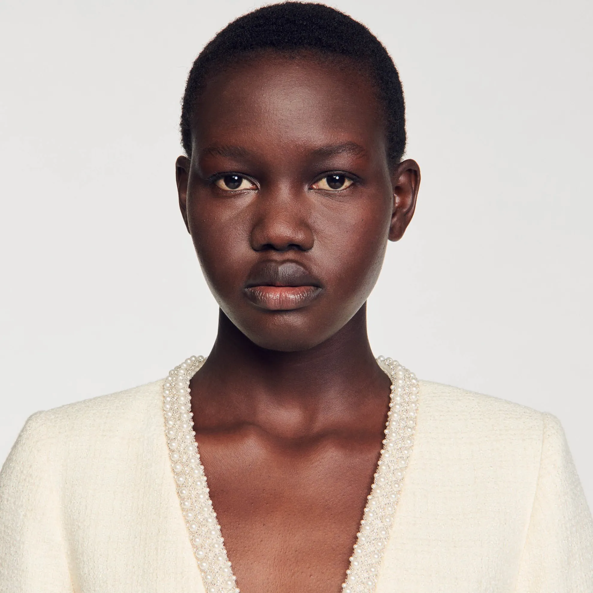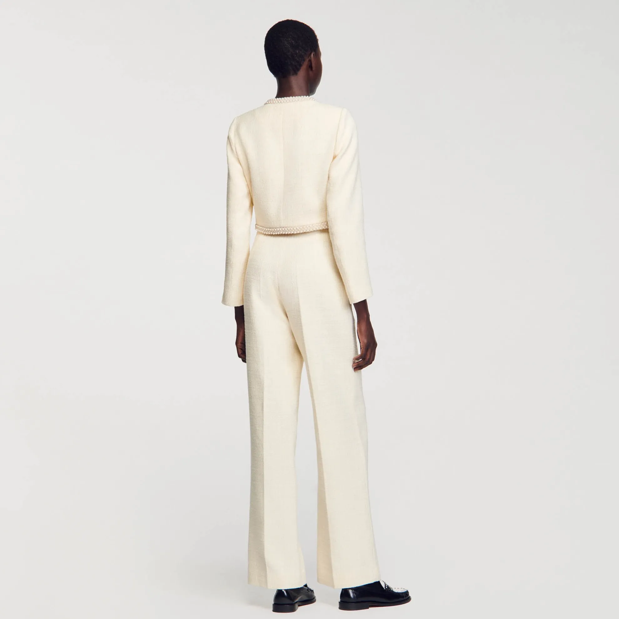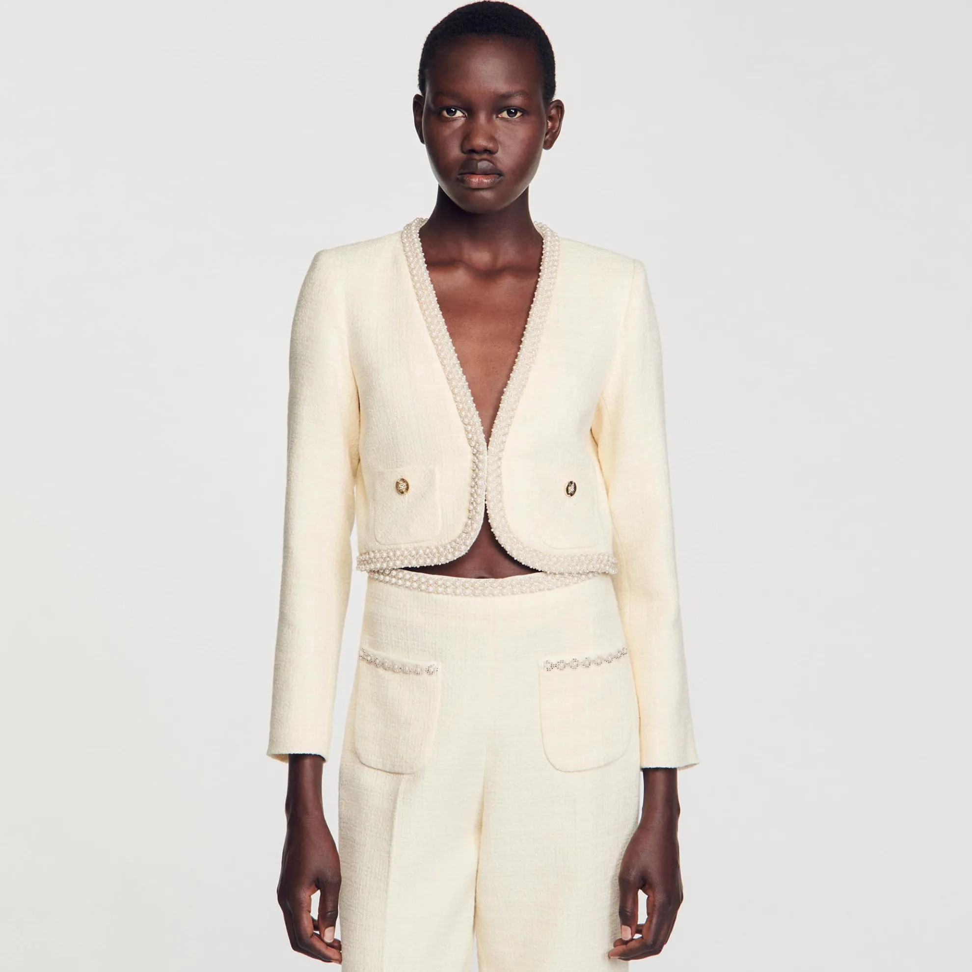 Kort tweed jasje met lange mouwen, opgestikte zakken en galons met parels.