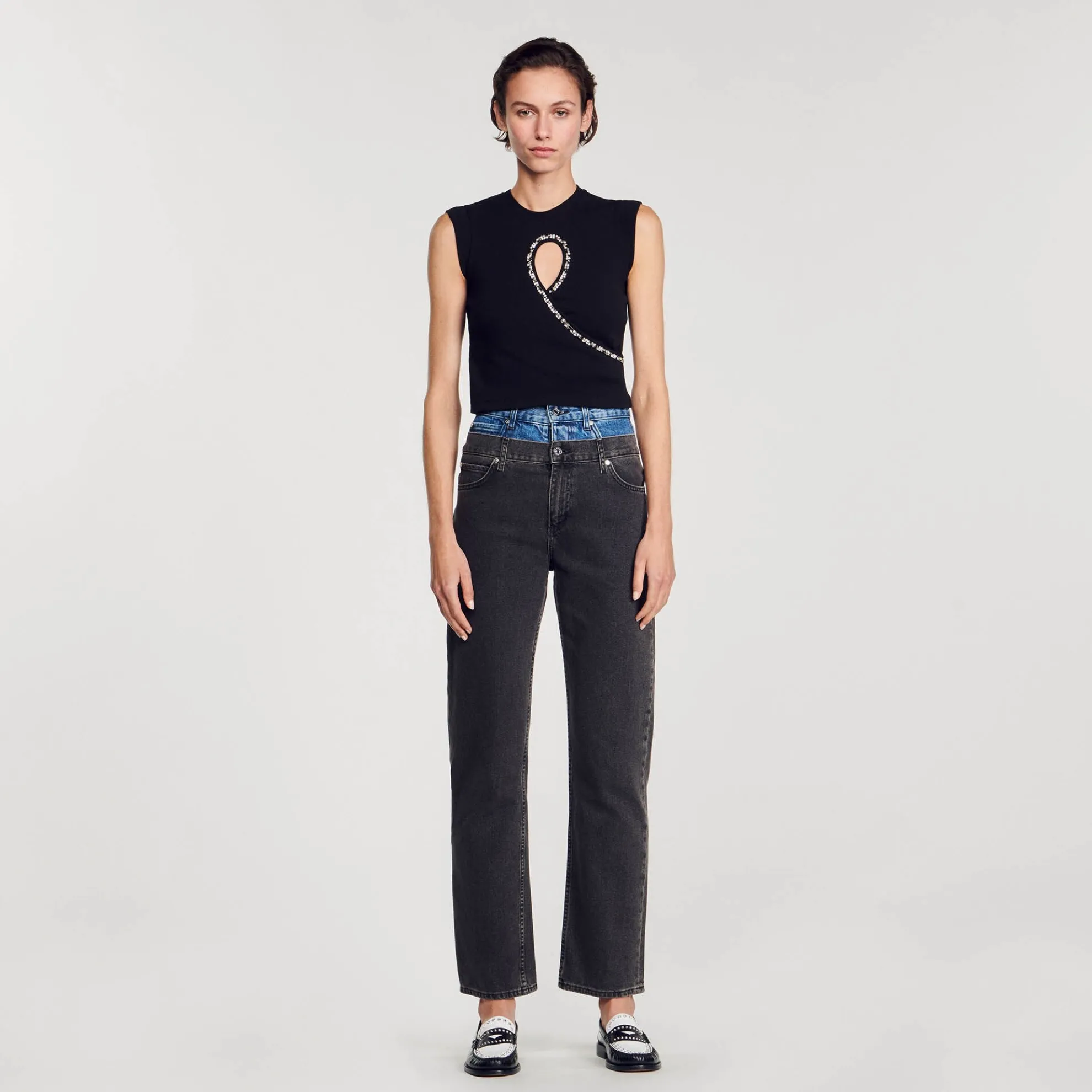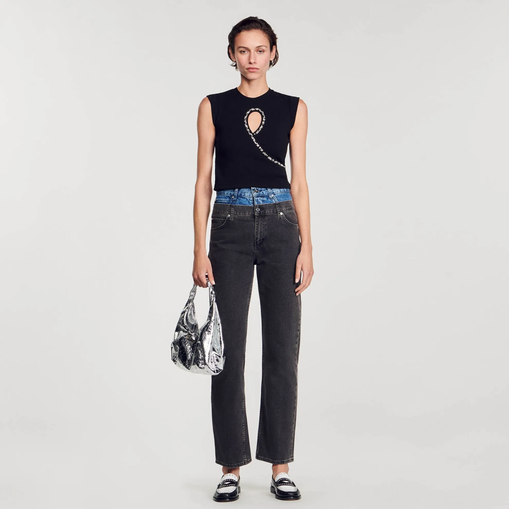 Mouwloos spencer vest met ronde hals en een met stras versierde opengewerkte druppelvormige uitsnijding.