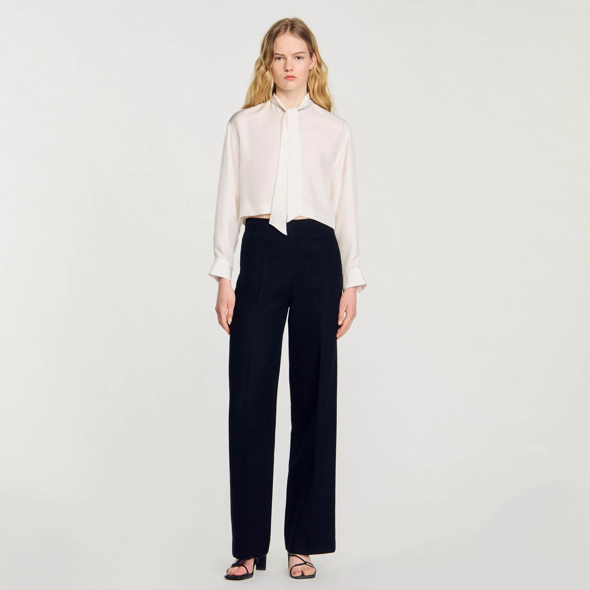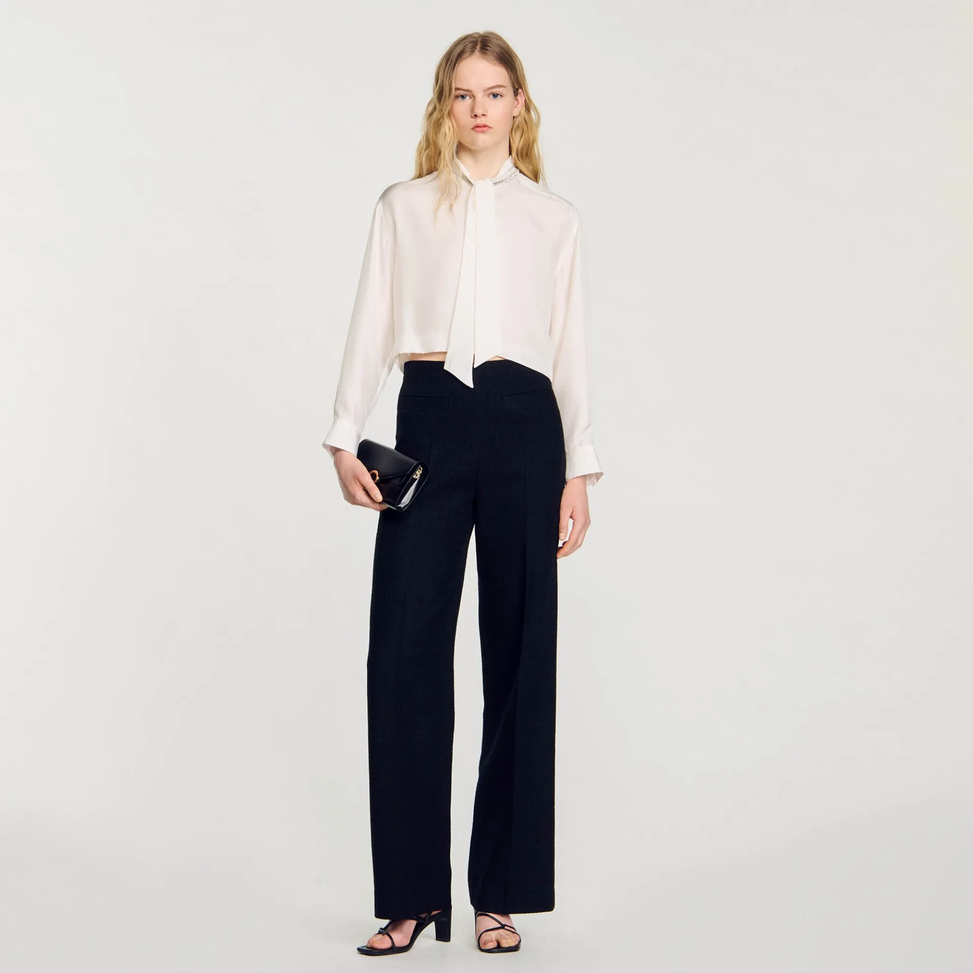 Kort overhemd van zijdetwill met strikkraag versierd met steentjes, lange mouwen en sierstiksels.