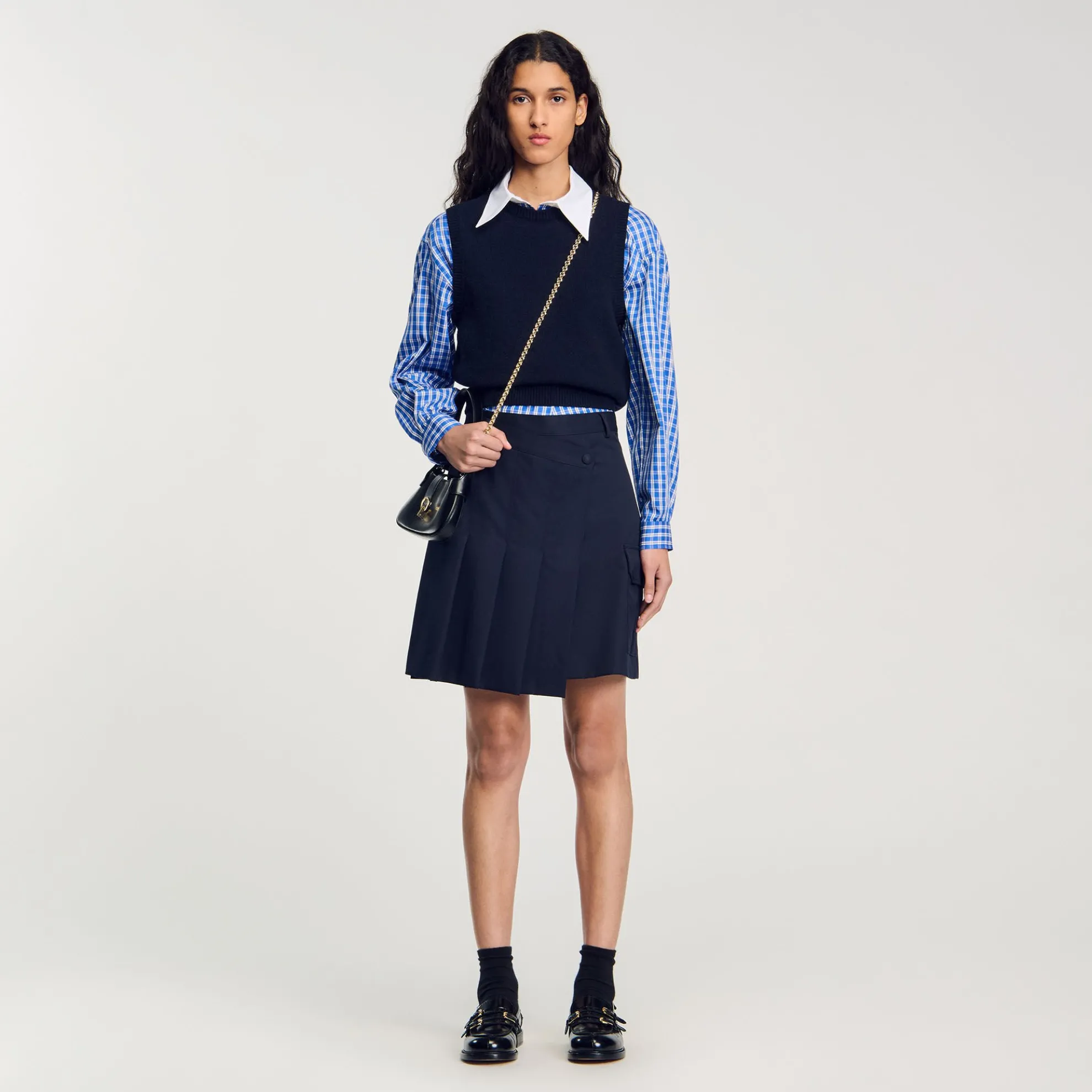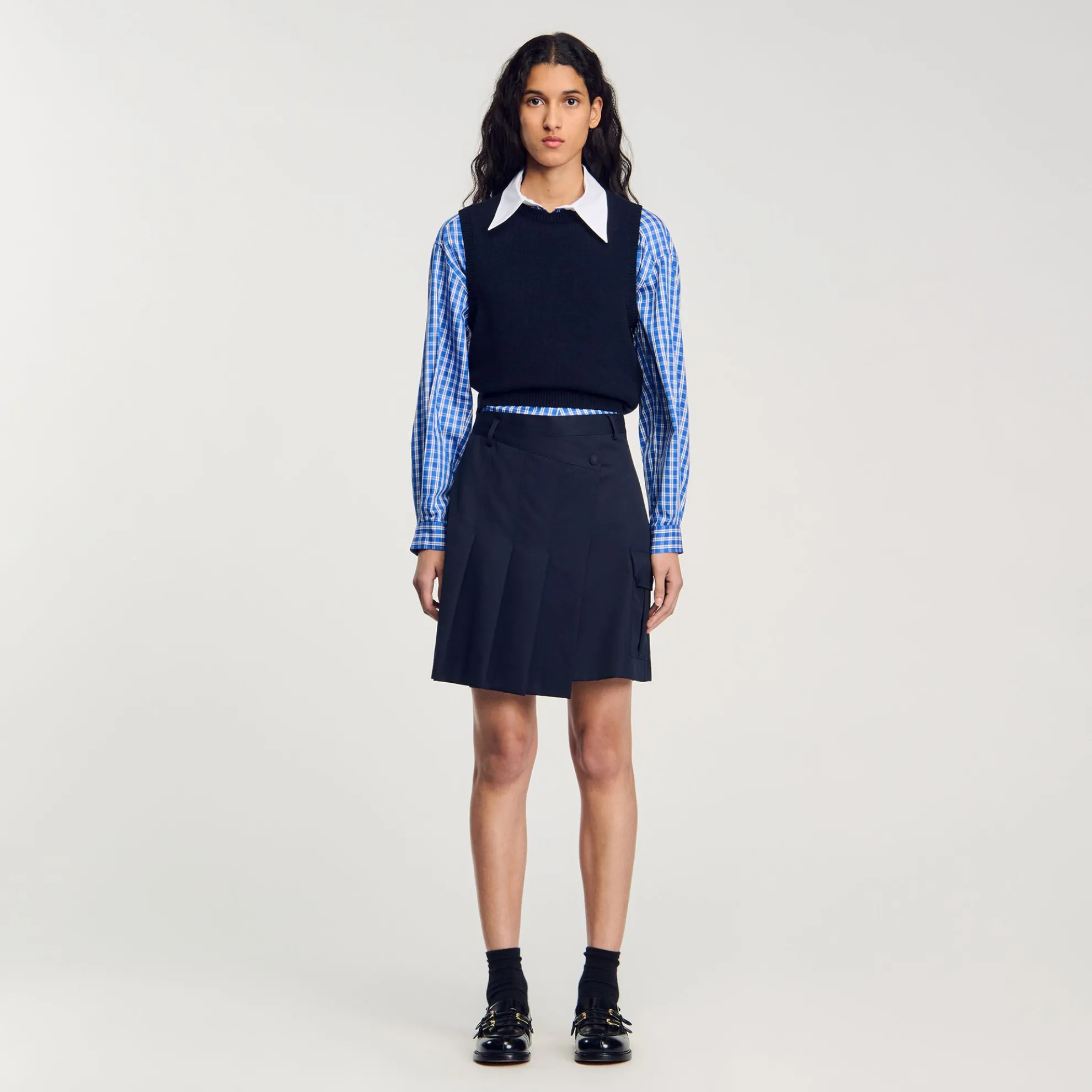 Korte geplooide rok met asymmetrische strook aan de voorkant, riemlussen, een drukknoop en een cargozak met flap aan de zijkant.