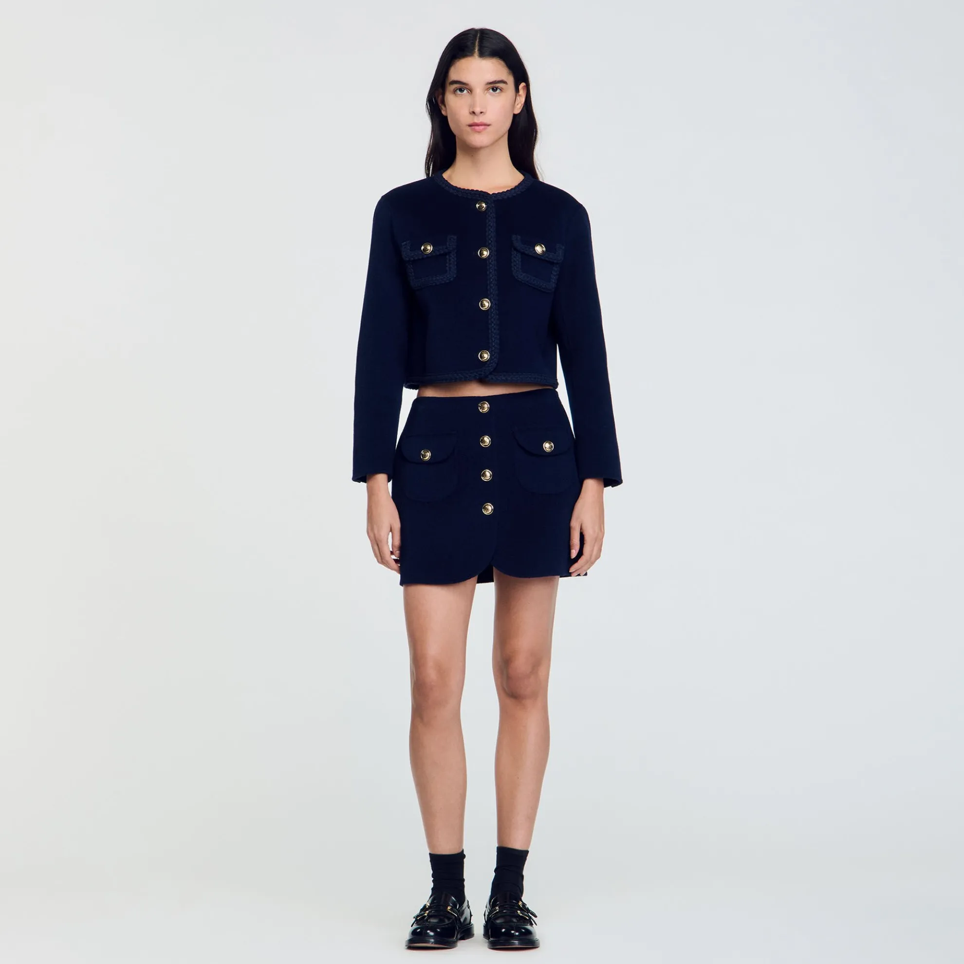 Korte dubbelzijdige rok van wol met vergulde drukknopen aan de voorkant, klepzakken en afgeronde randen.