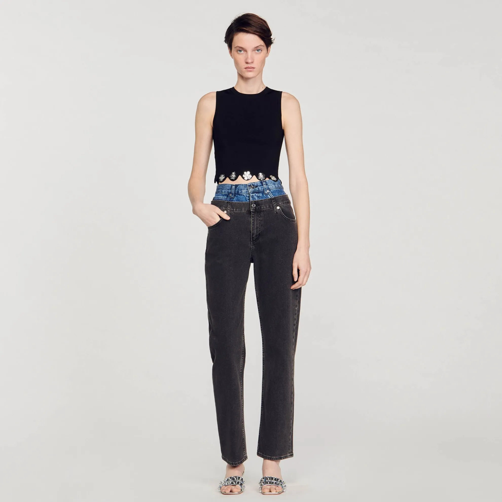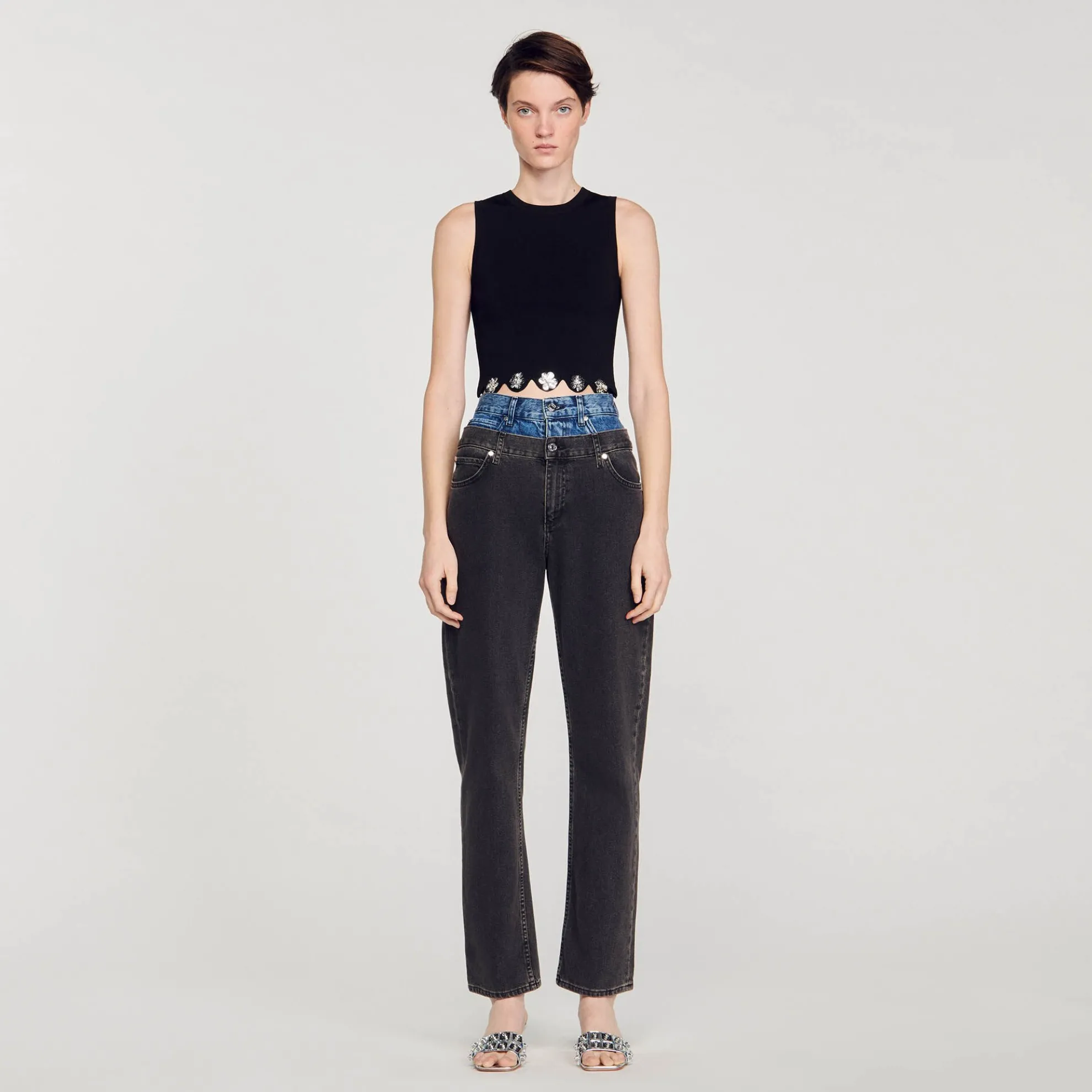 Korte mouwloze gebreide top met ronde hals en geschulpte zoom versierd met pailletten bloemen.