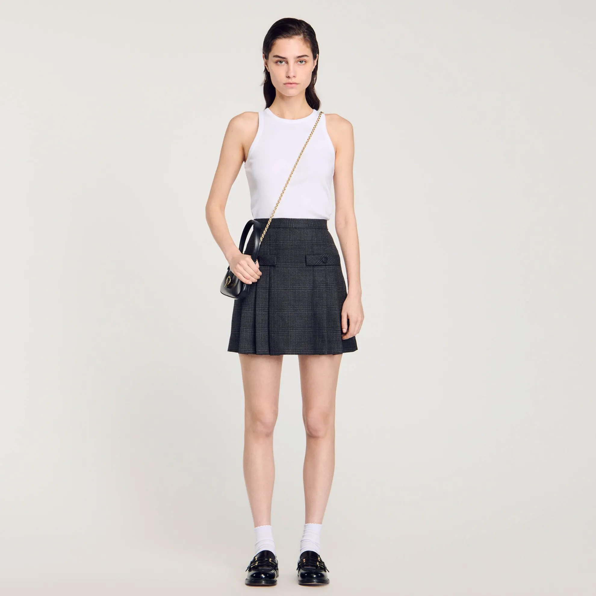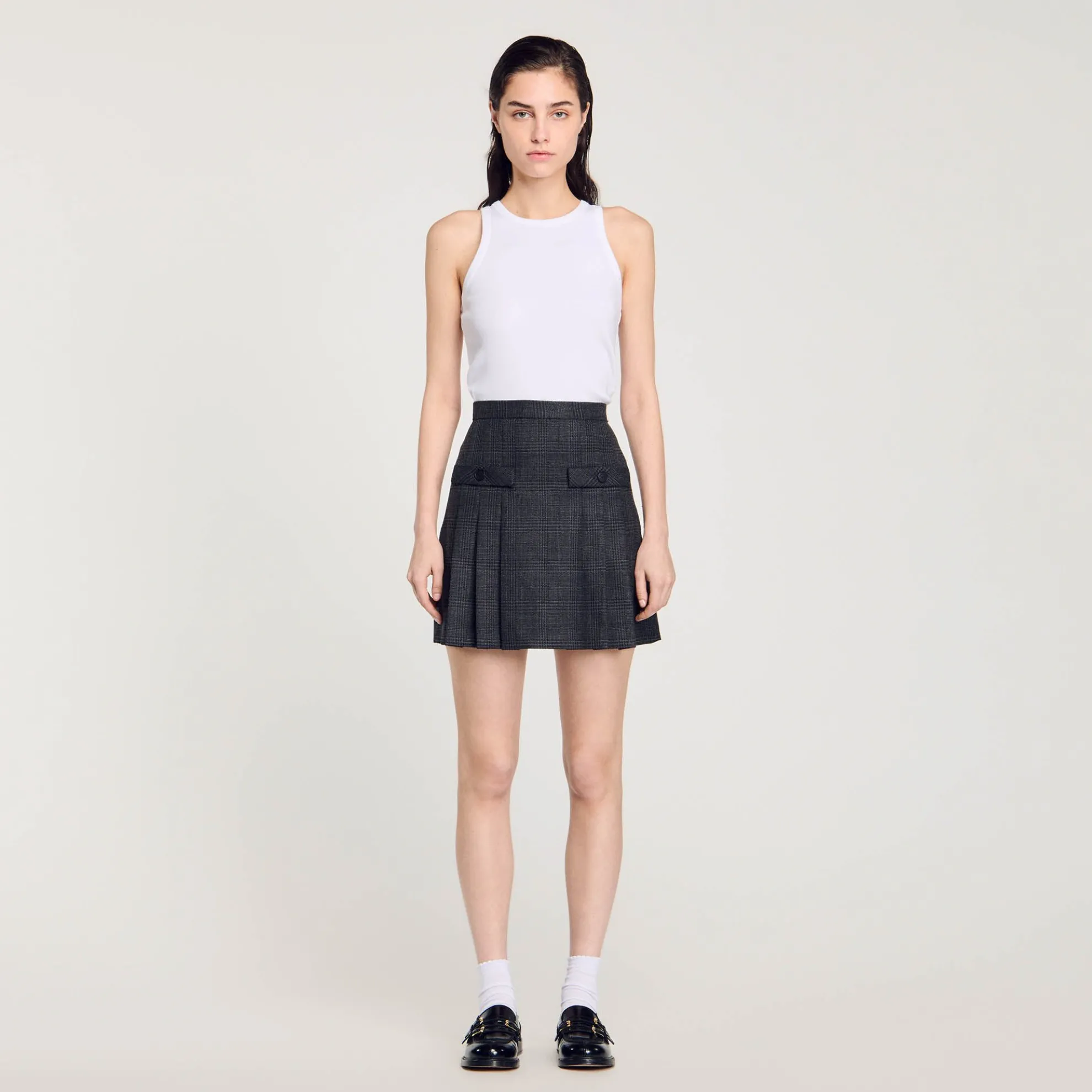 Korte geplooide ruitjesrok met paspelzakken met knopen.