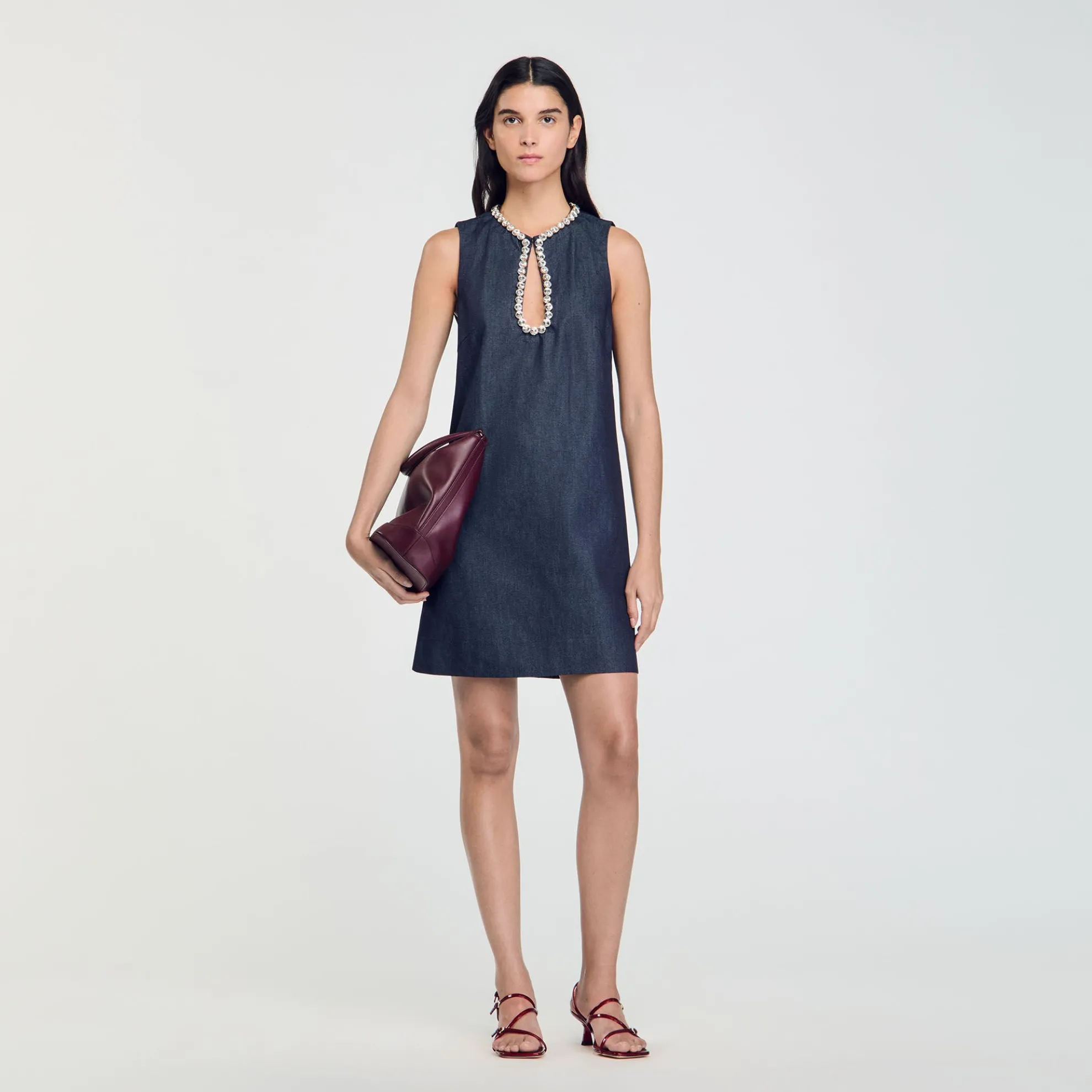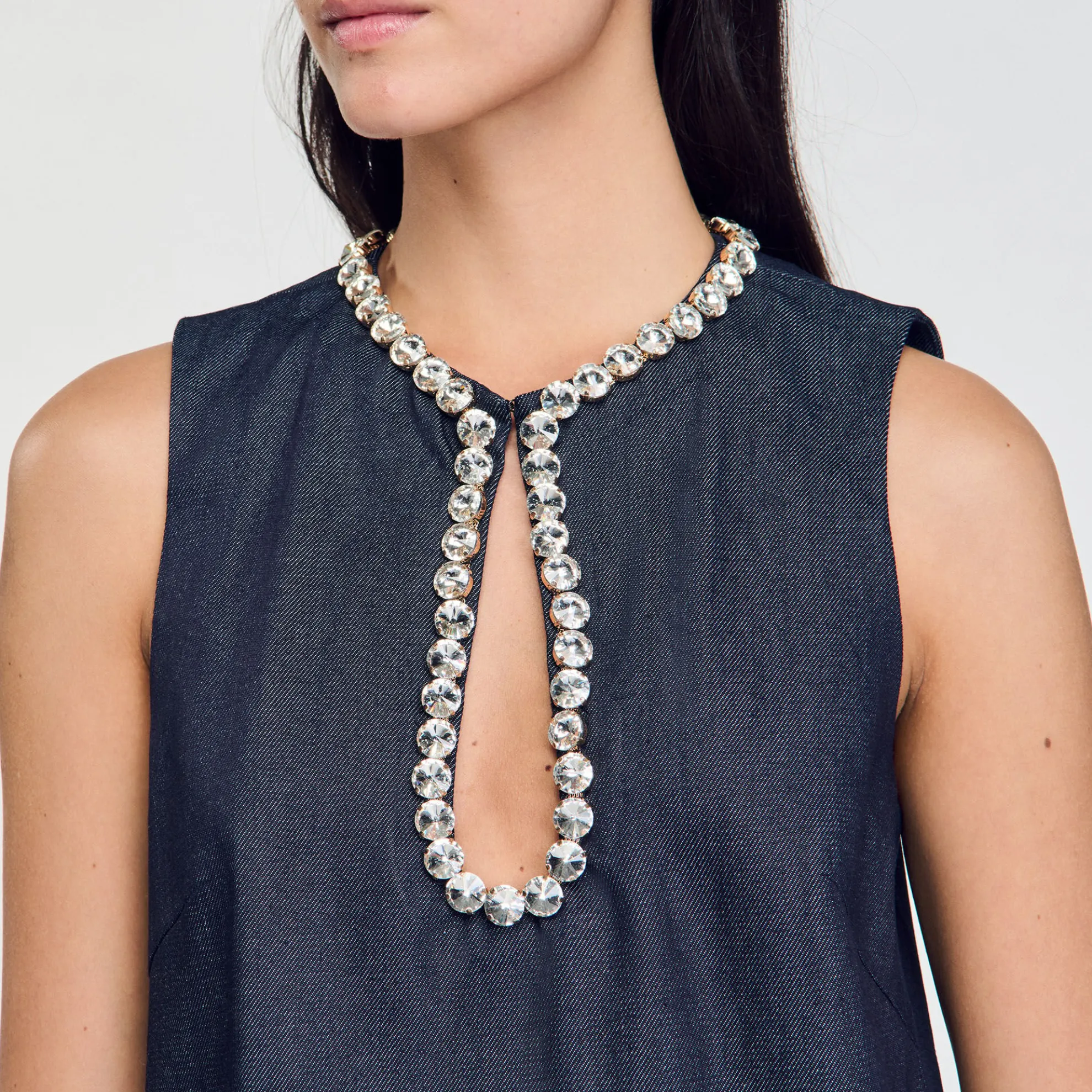 Mouwloze korte spijkerjurk met druppelvormige hals met stras.
