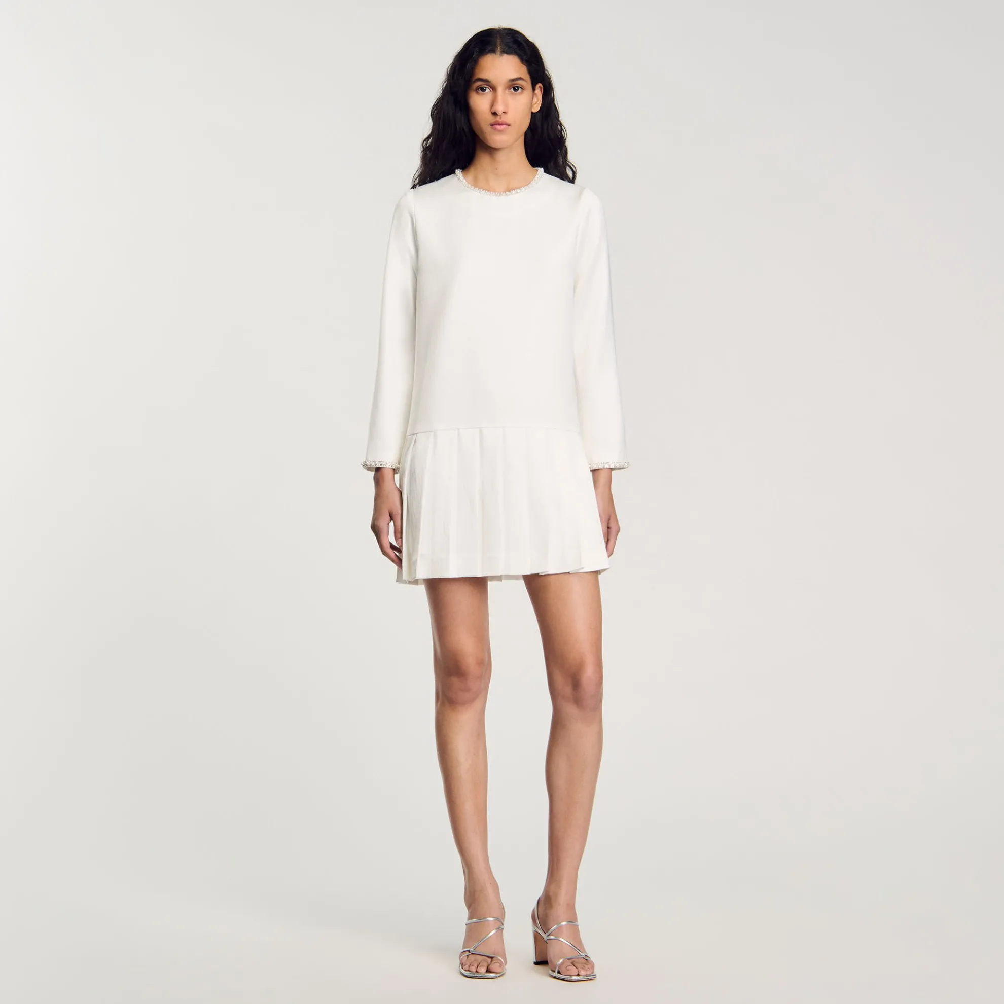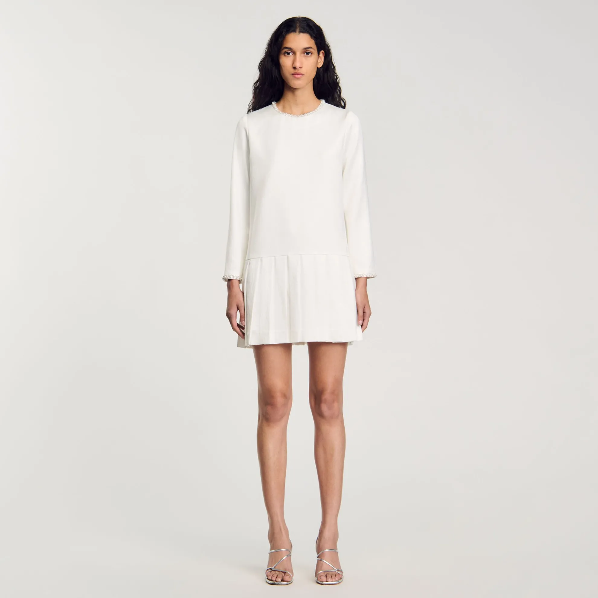Korte, satijnen jurk met een ronde halslijn versierd met parels, lange mouwen en een geplooid rokgedeelte.