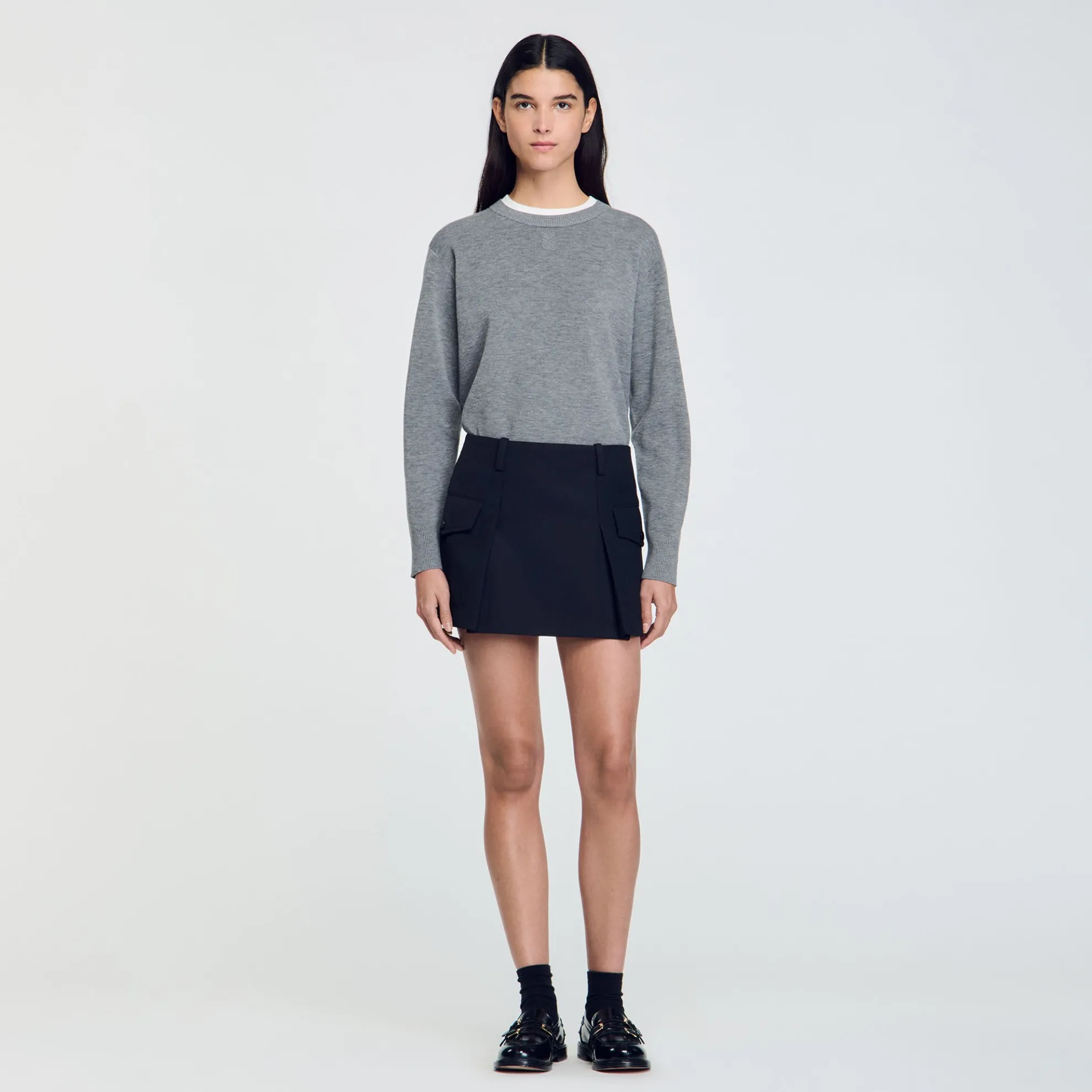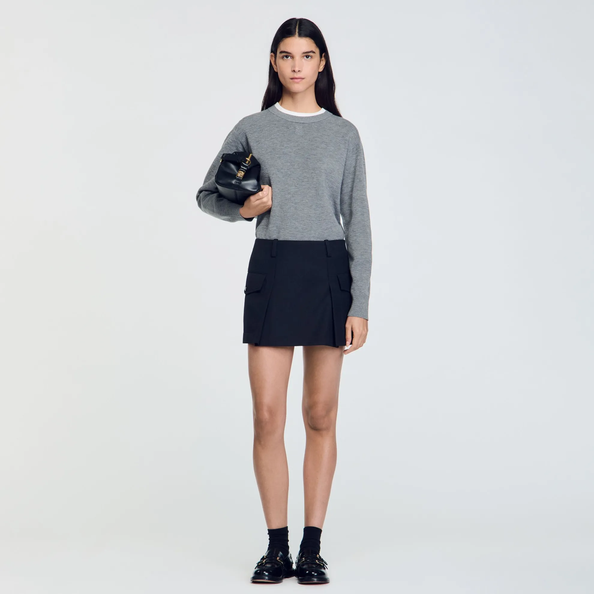 Korte rok met klepzakken aan de zijkanten en riemlussen in de taille.