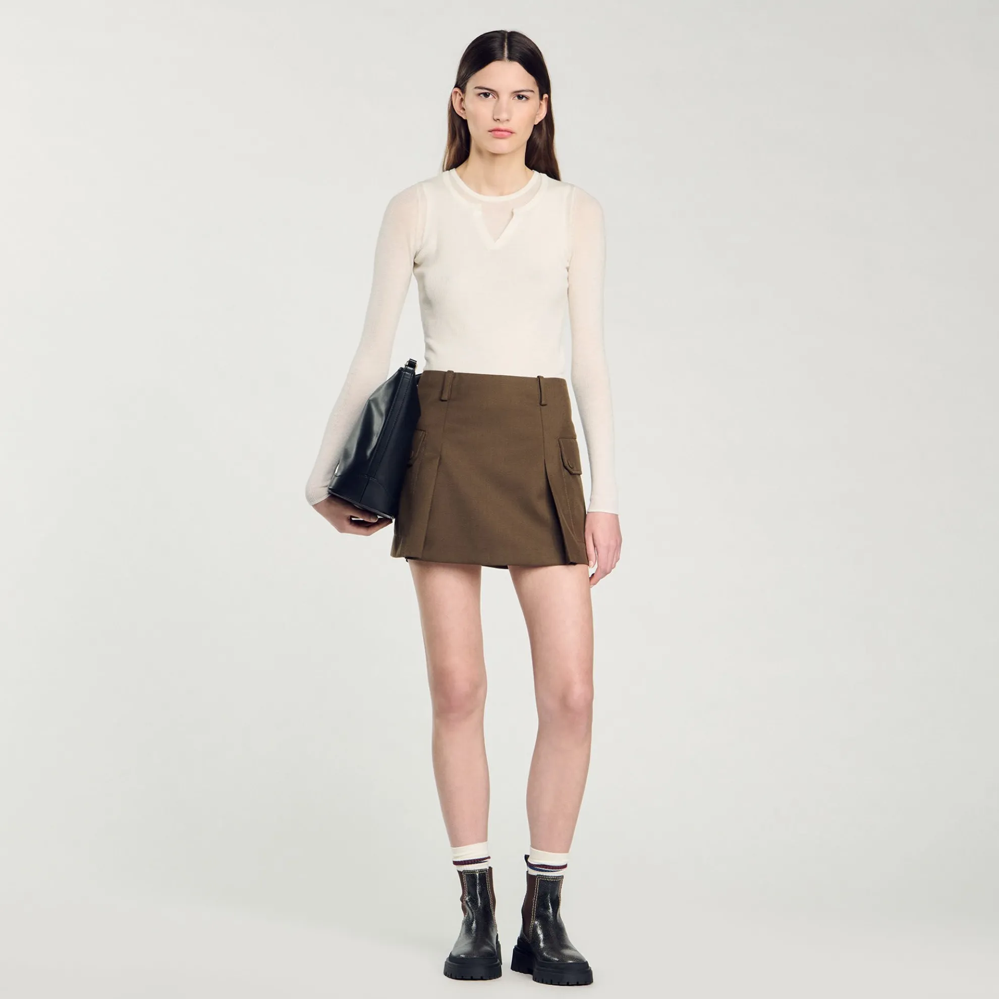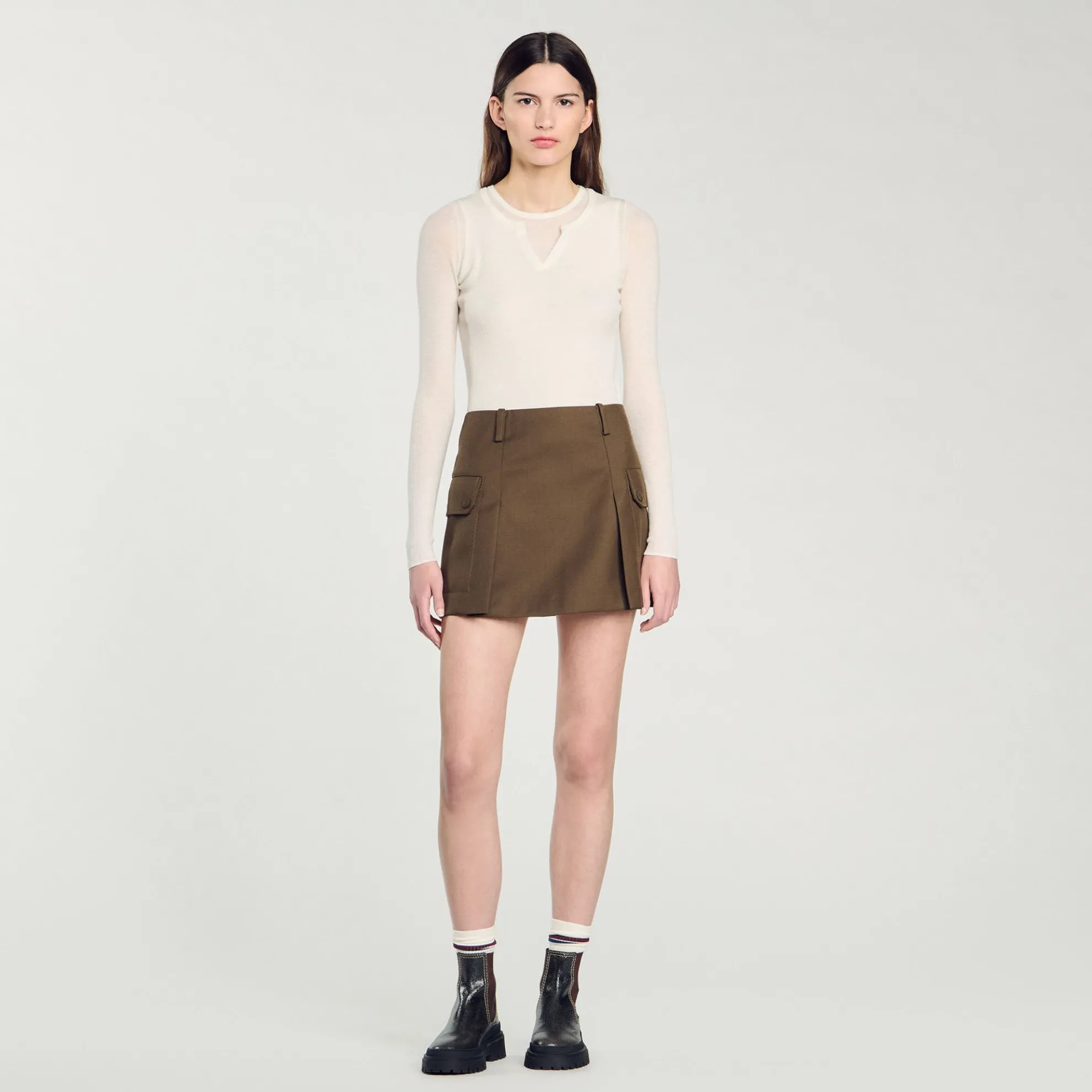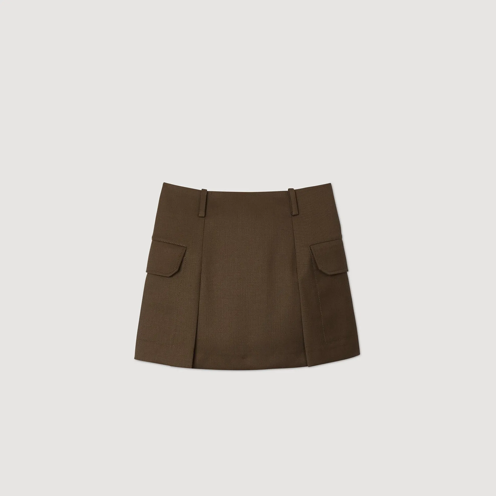 Korte rok met stolpplooien, grote klepzakken aan de zijkanten en riemlussen.