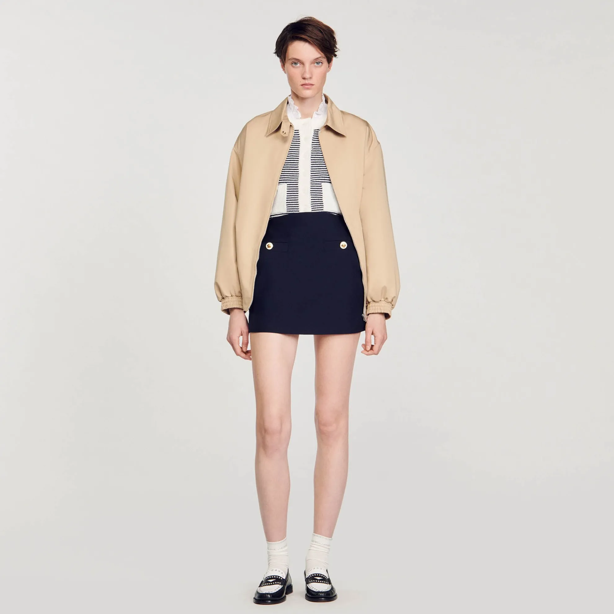 Korte rok van wollen keperstof met kleine zijsplitten en valse paspelzakken aan de voorkant met sierknopen.