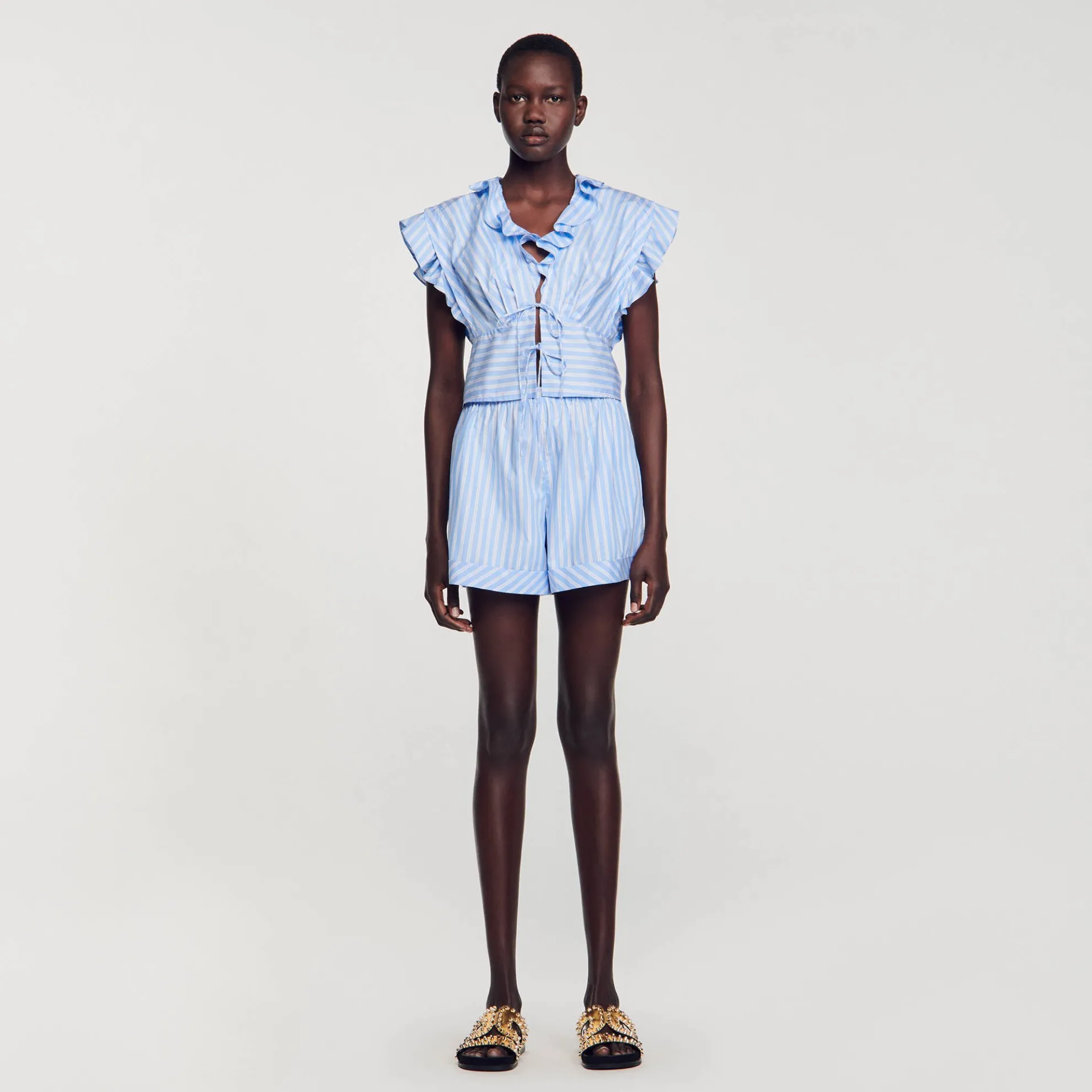 Gestreepte korte top in popeline katoen met V-hals, korte mouwen met ruches en striksluiting.