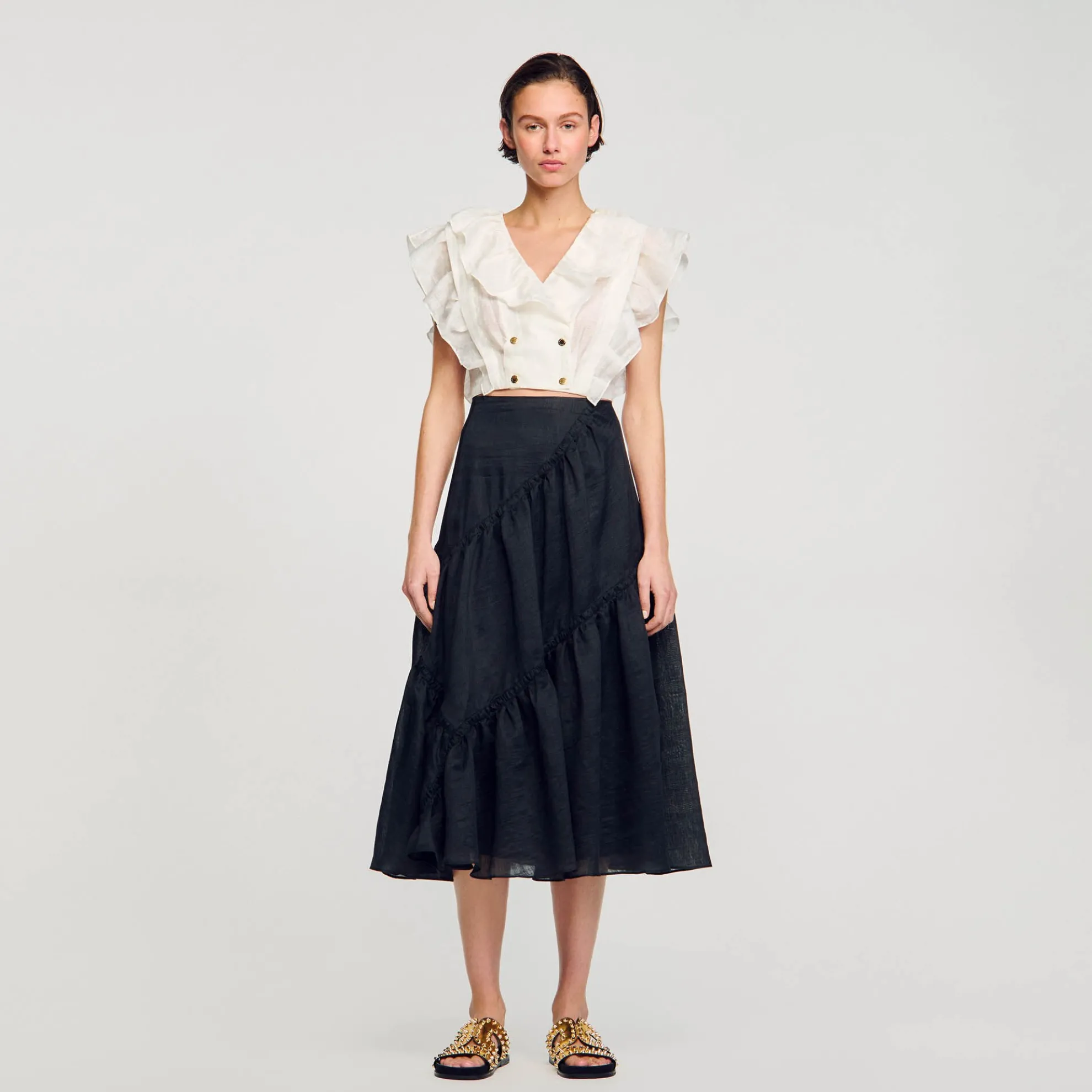 Korte, mouwloze top met brede volants, een gekruiste V-hals en drukknopen.