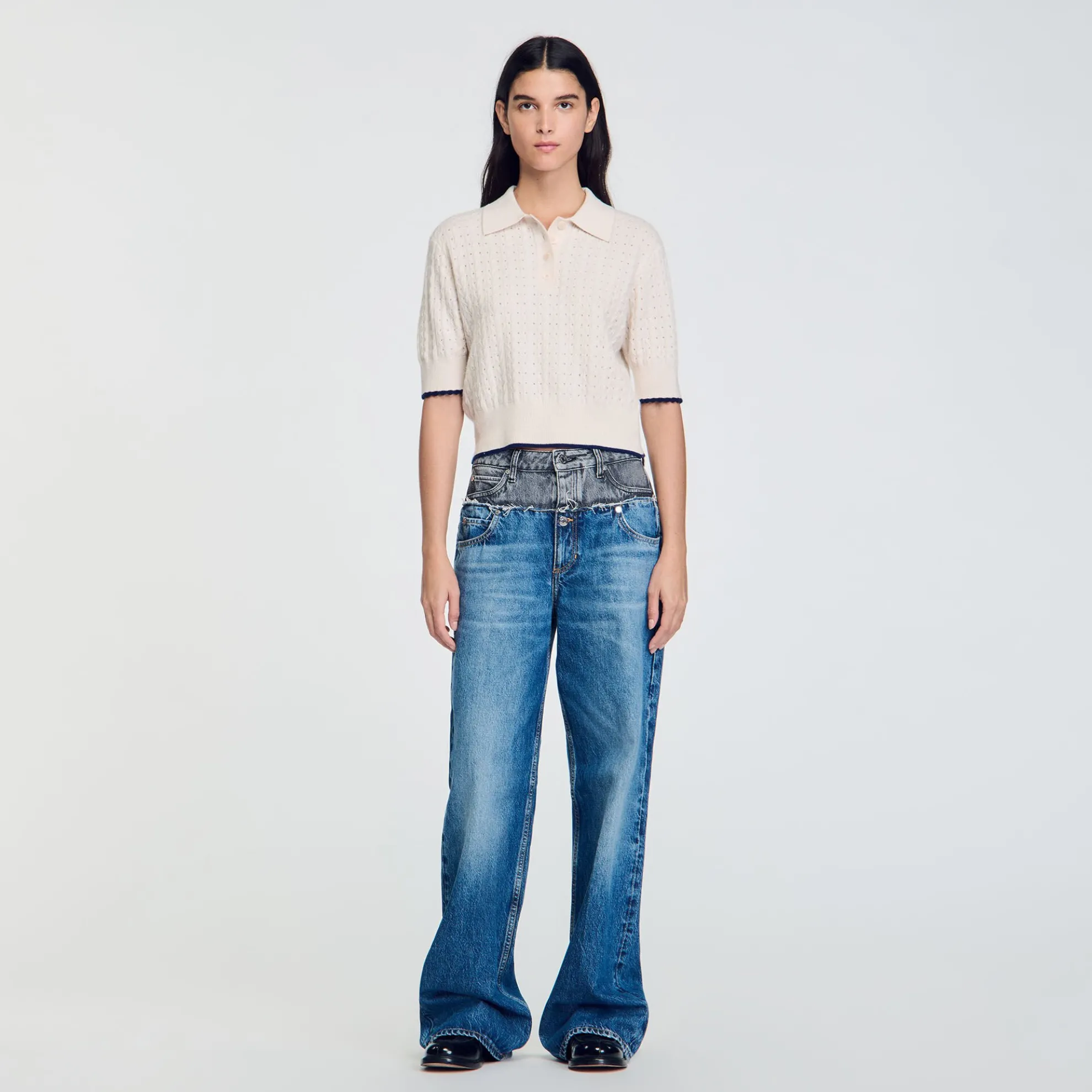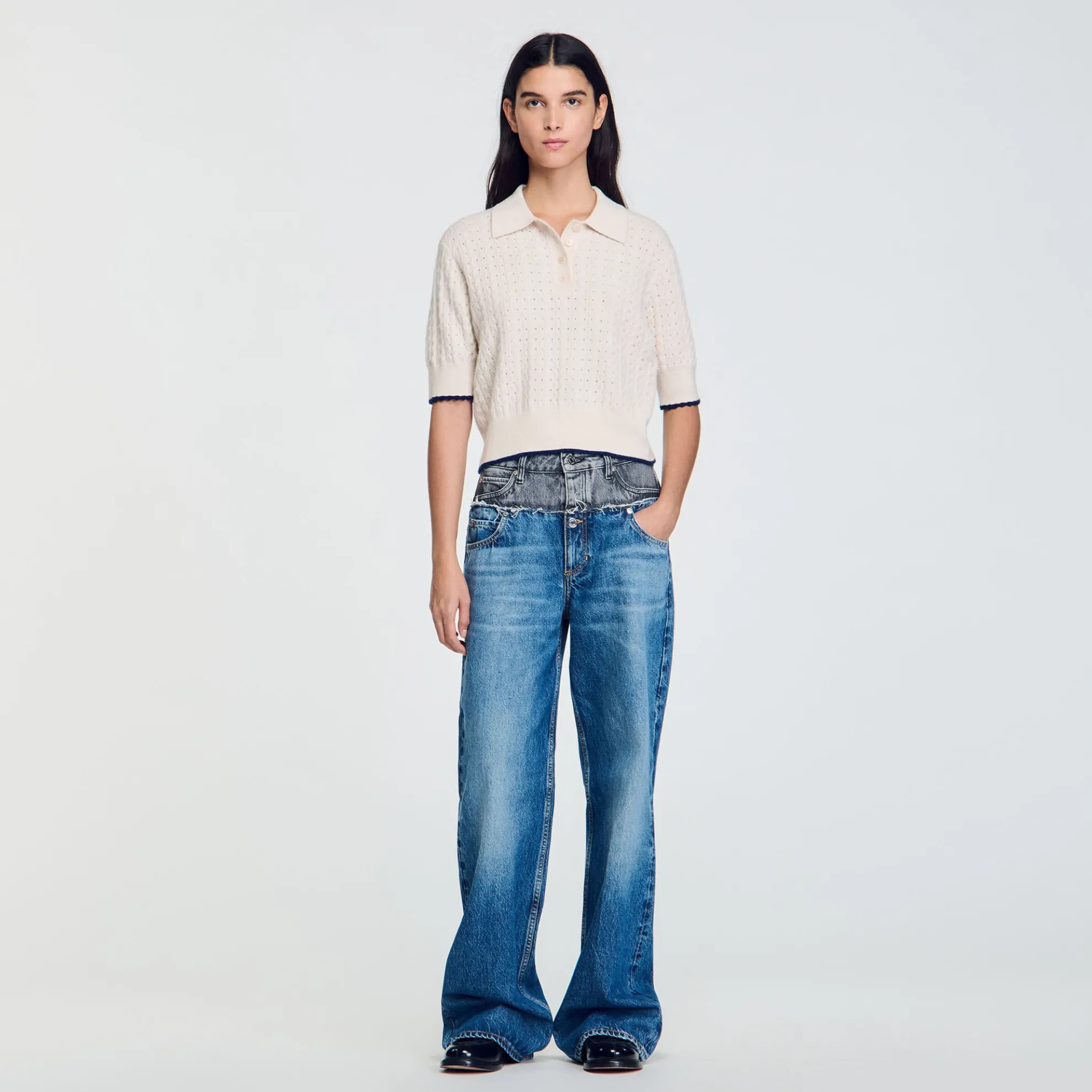 Korte trui met pointellesteek van wol en kasjmier, voorzien van een polokraag, korte mouwen en een contrasterende bies.