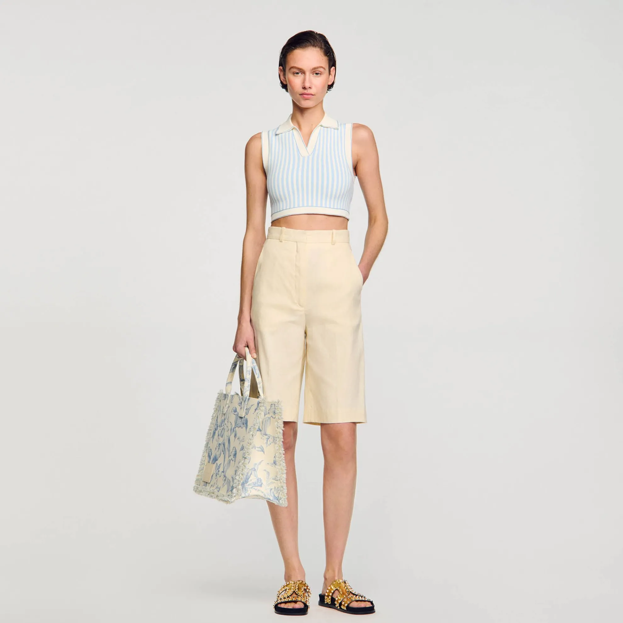 Korte mouwloze trui met strepen, open polokraag en contrasterende randen.