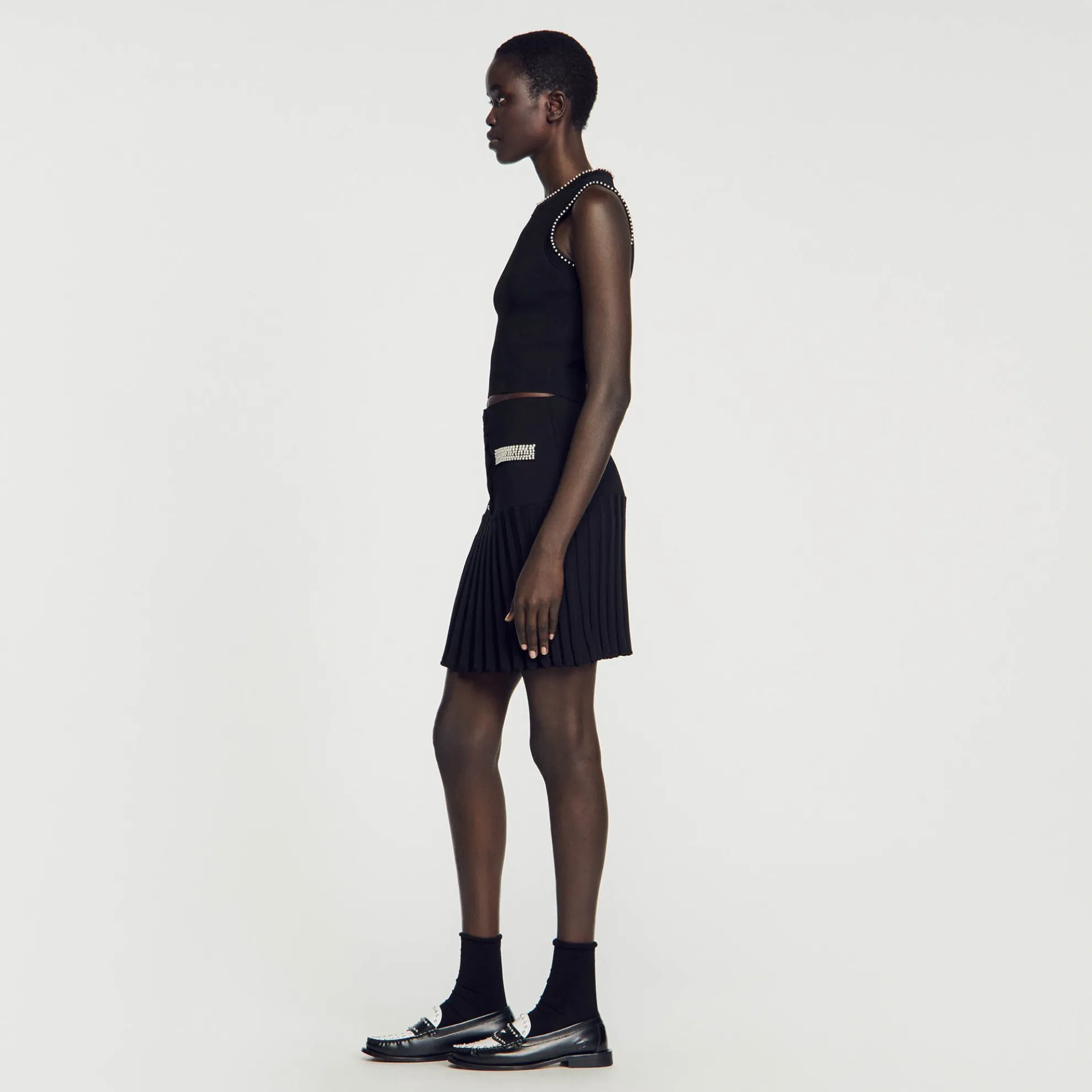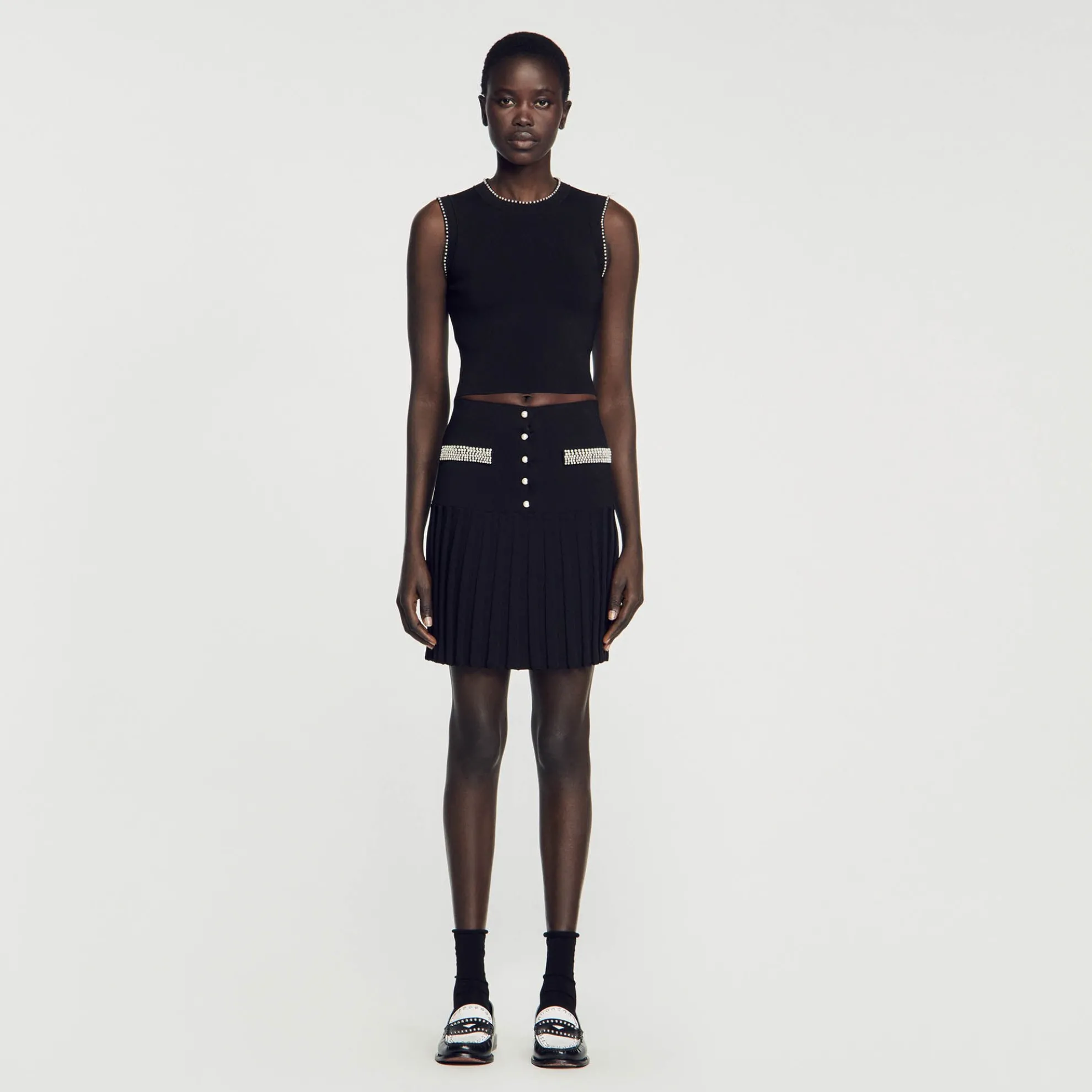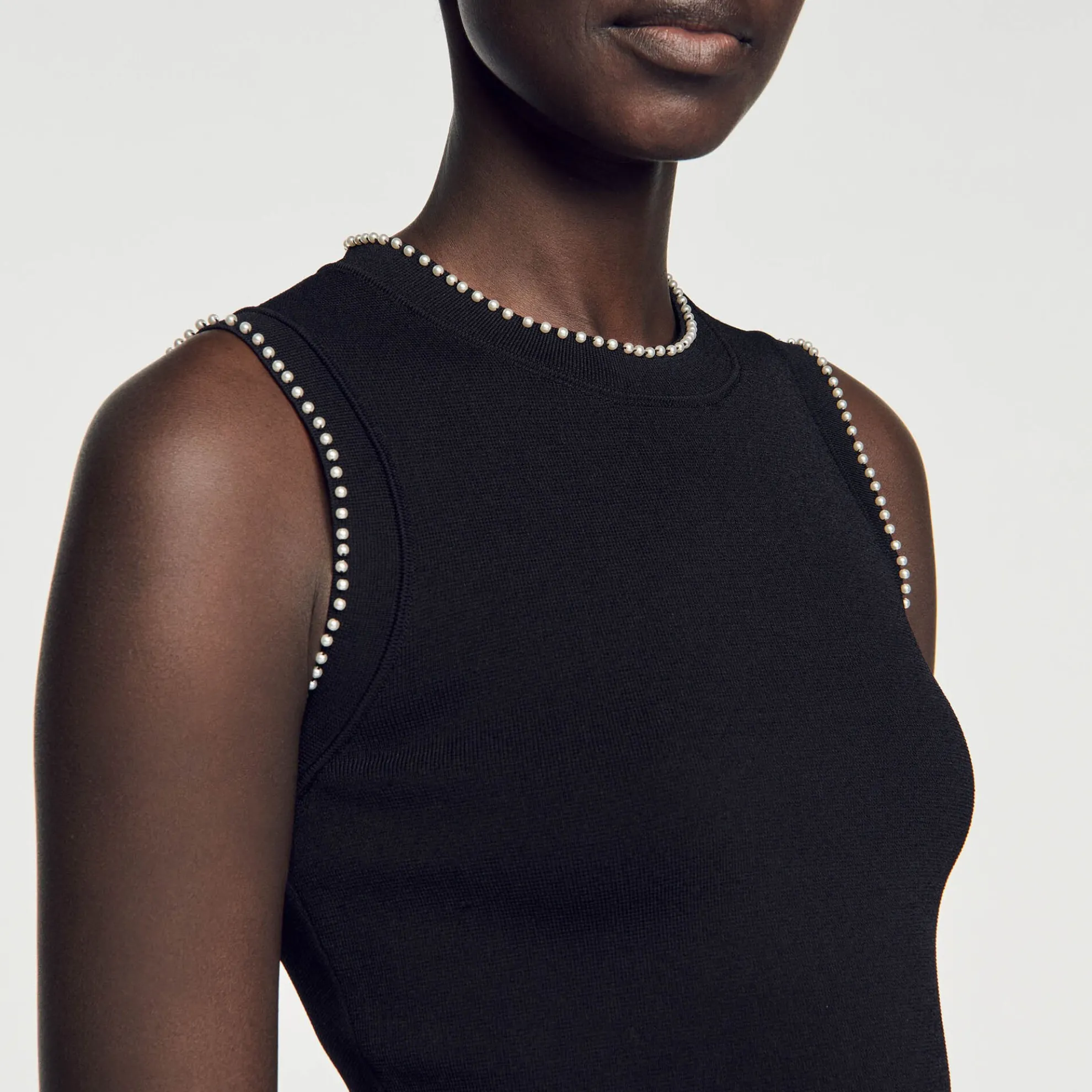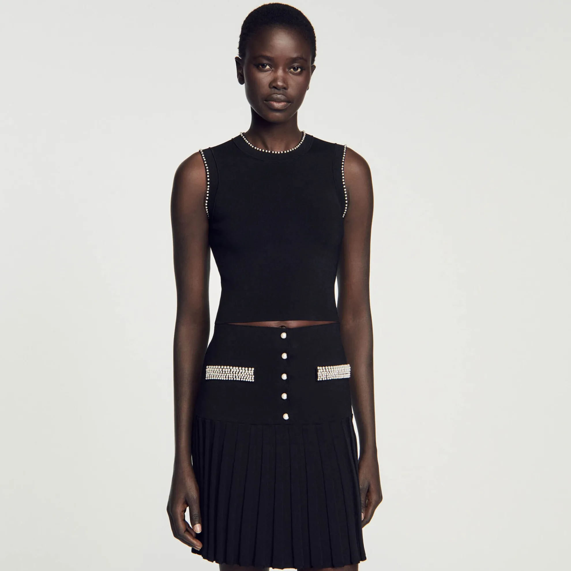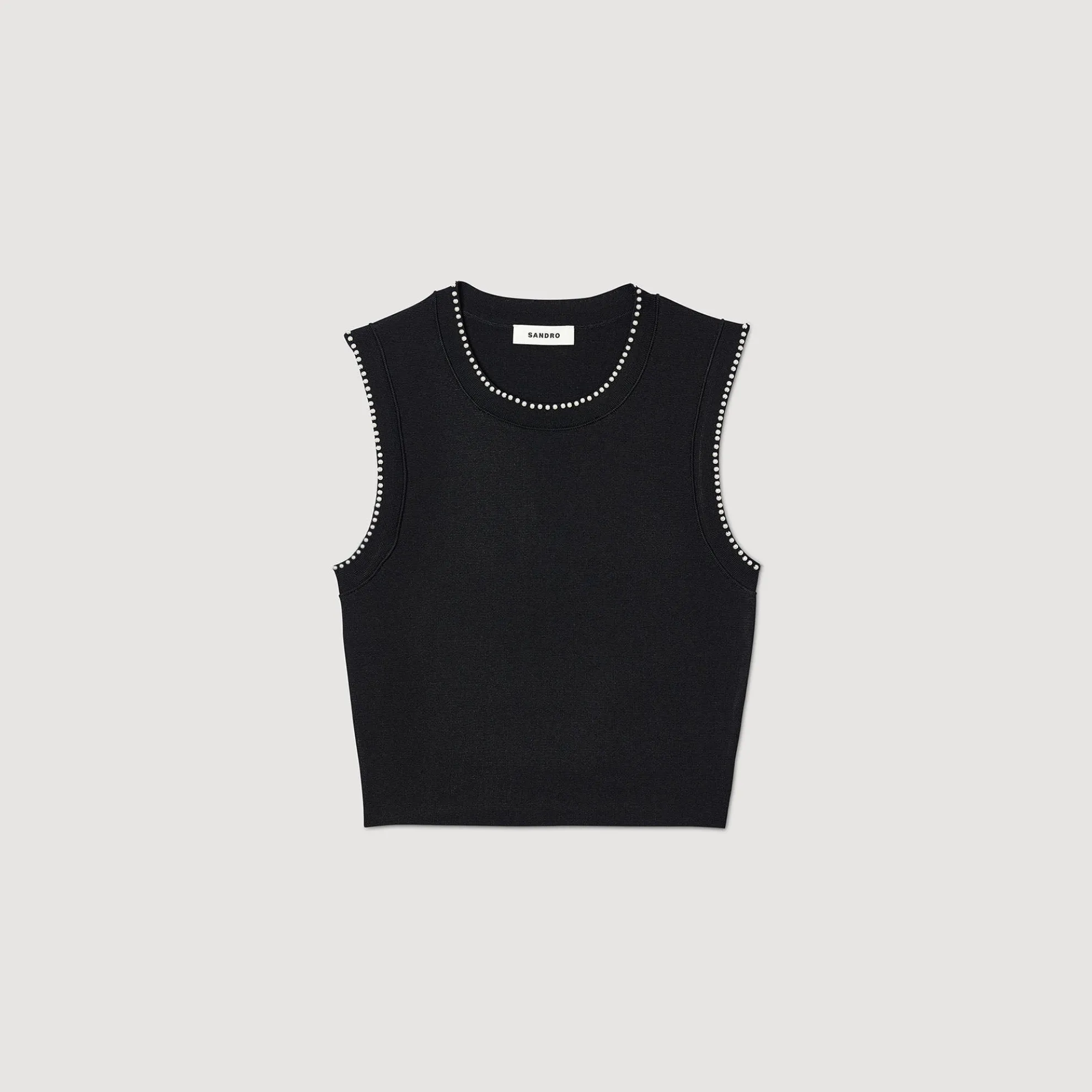 Korte mouwloze trui met ronde hals en korte mouwen versierd met parels.