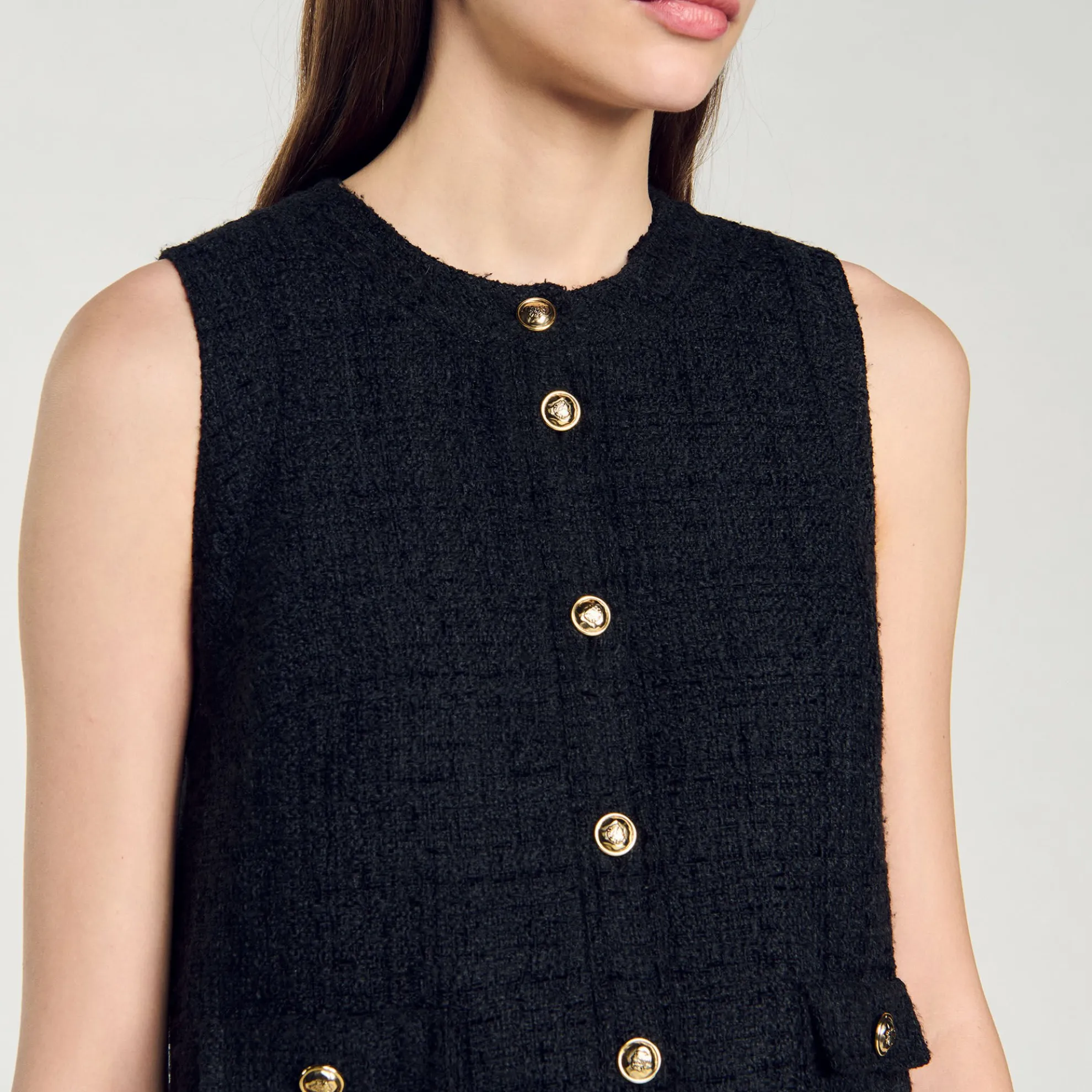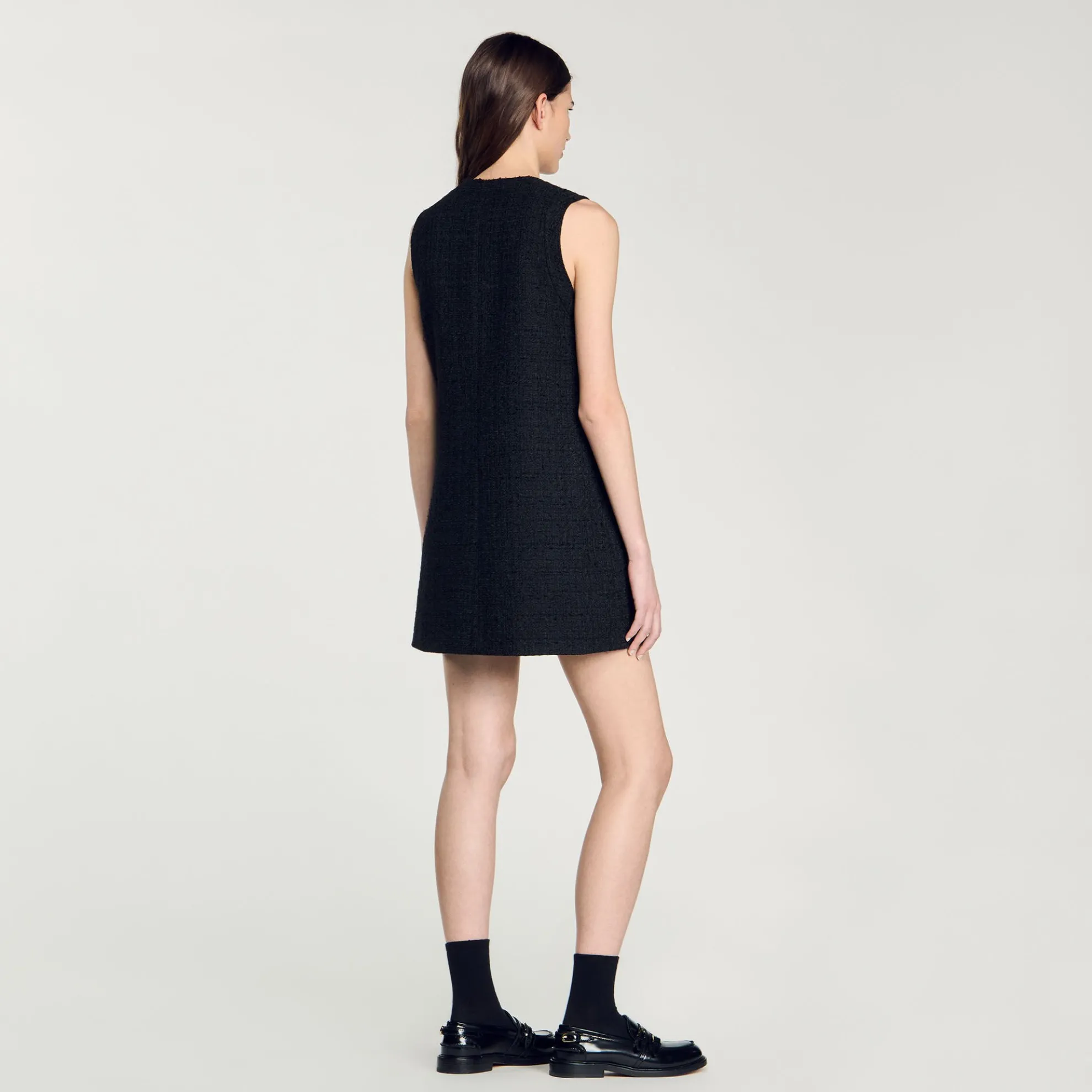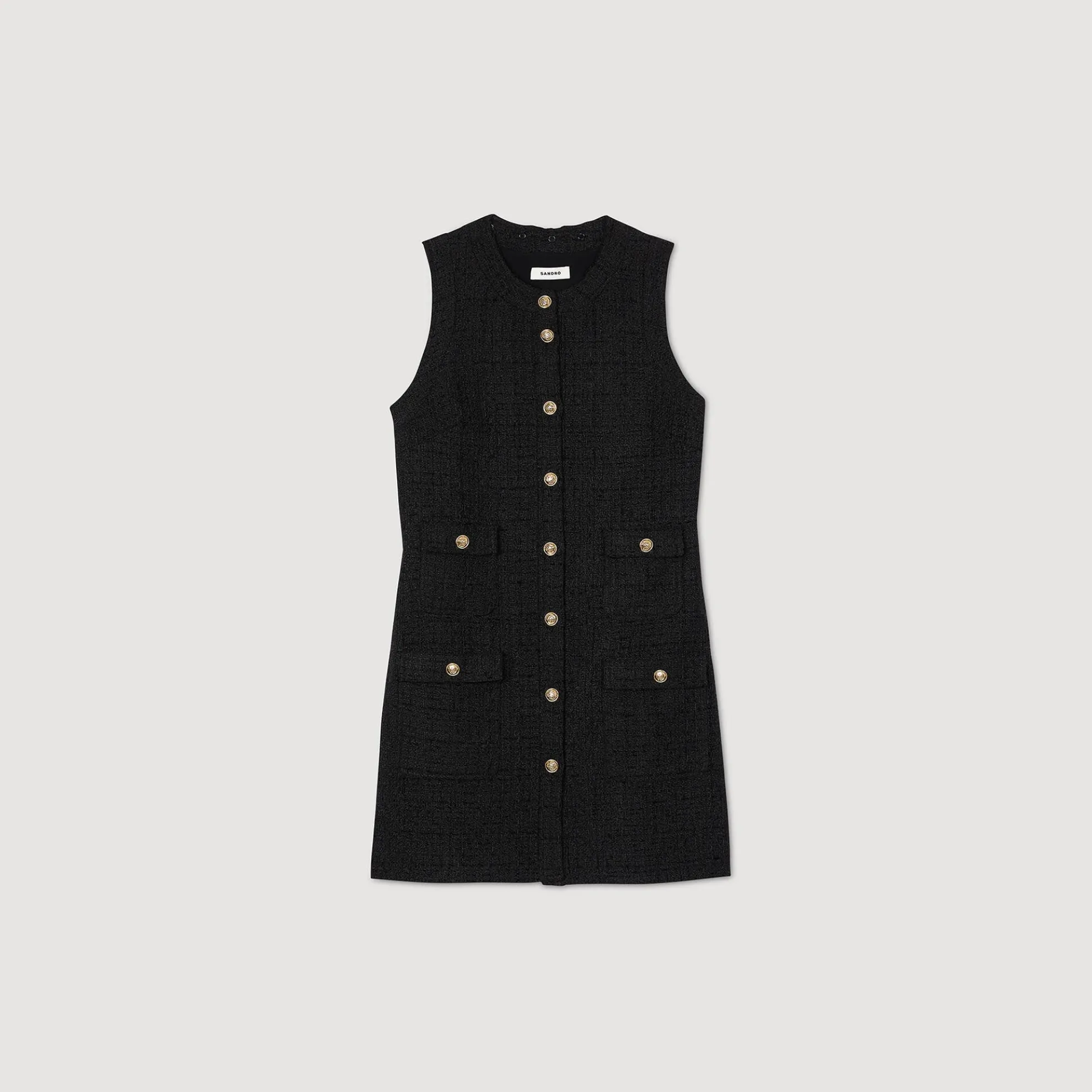 Korte mouwloze jurk van tweed met een ronde hals, een knoopsluiting en opgestikte zakken met flap.