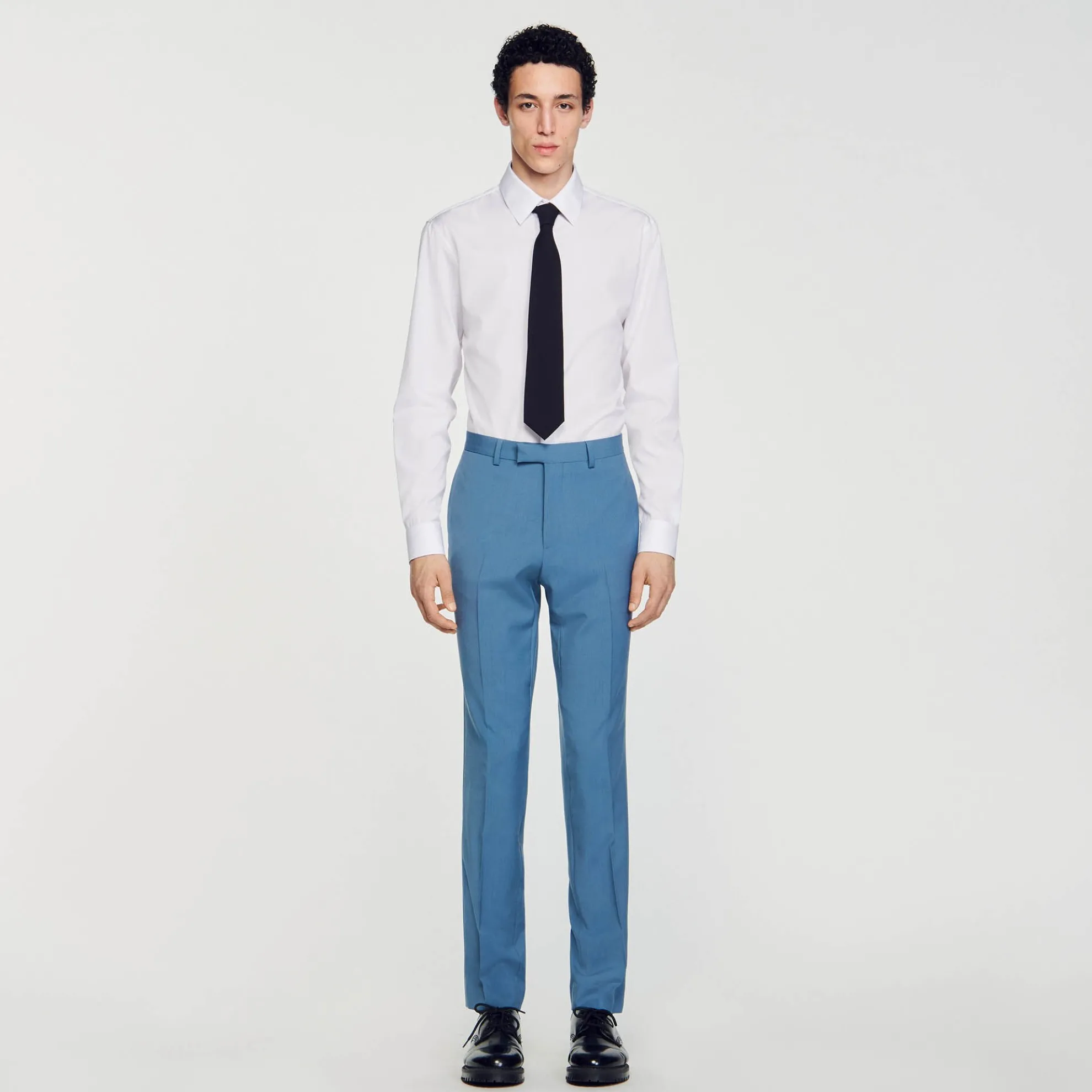 Rechte wollen kostuumbroek met twee voorzakken en twee achterzakken.