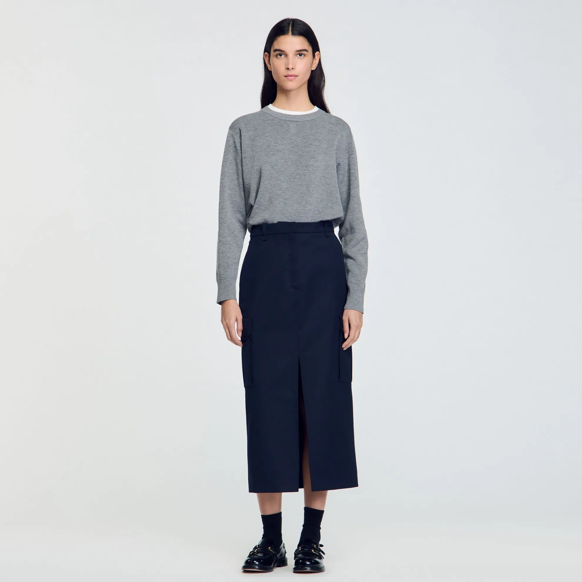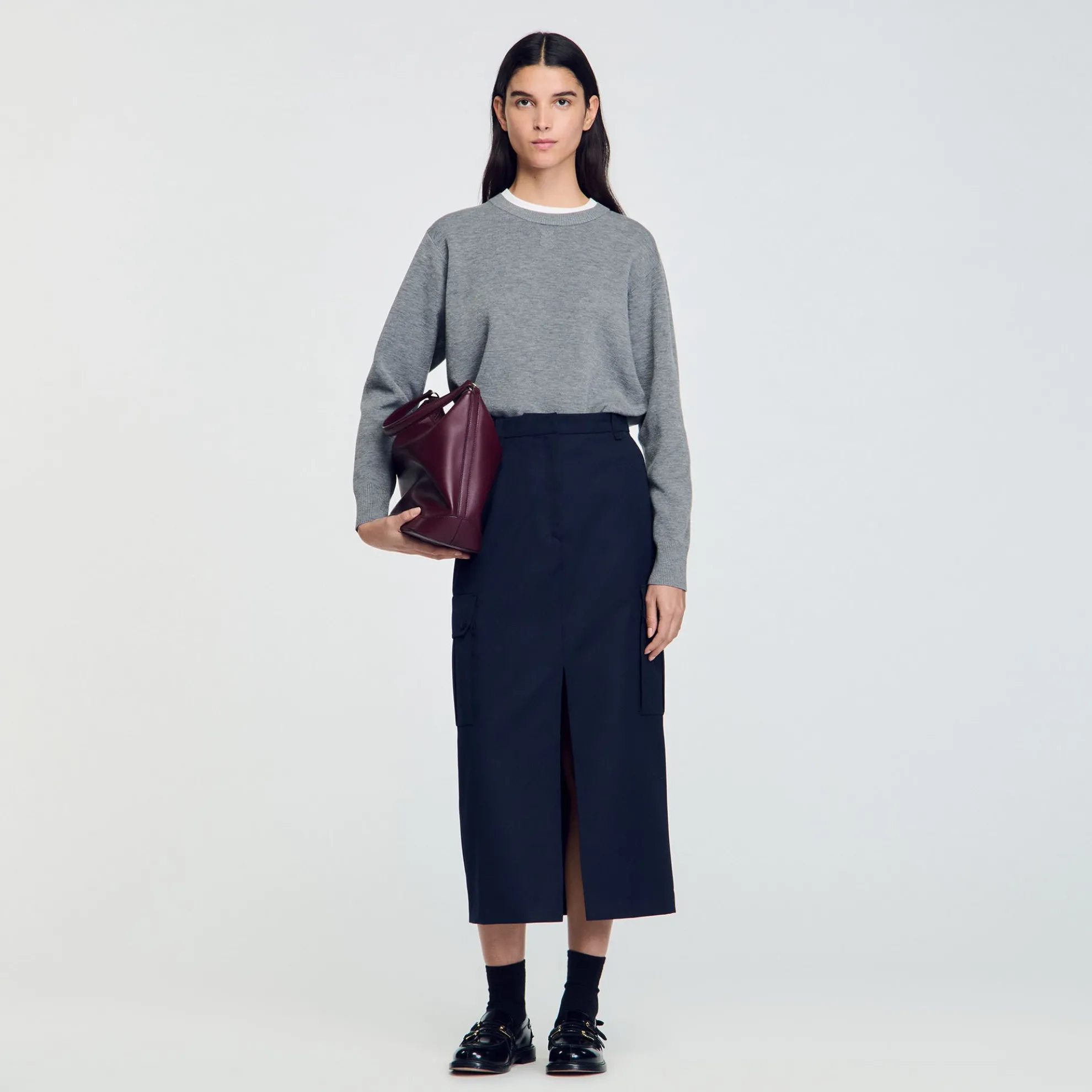 Lange rok in cargostijl met grote zijzakken met drukknopen en split aan de voorkant.