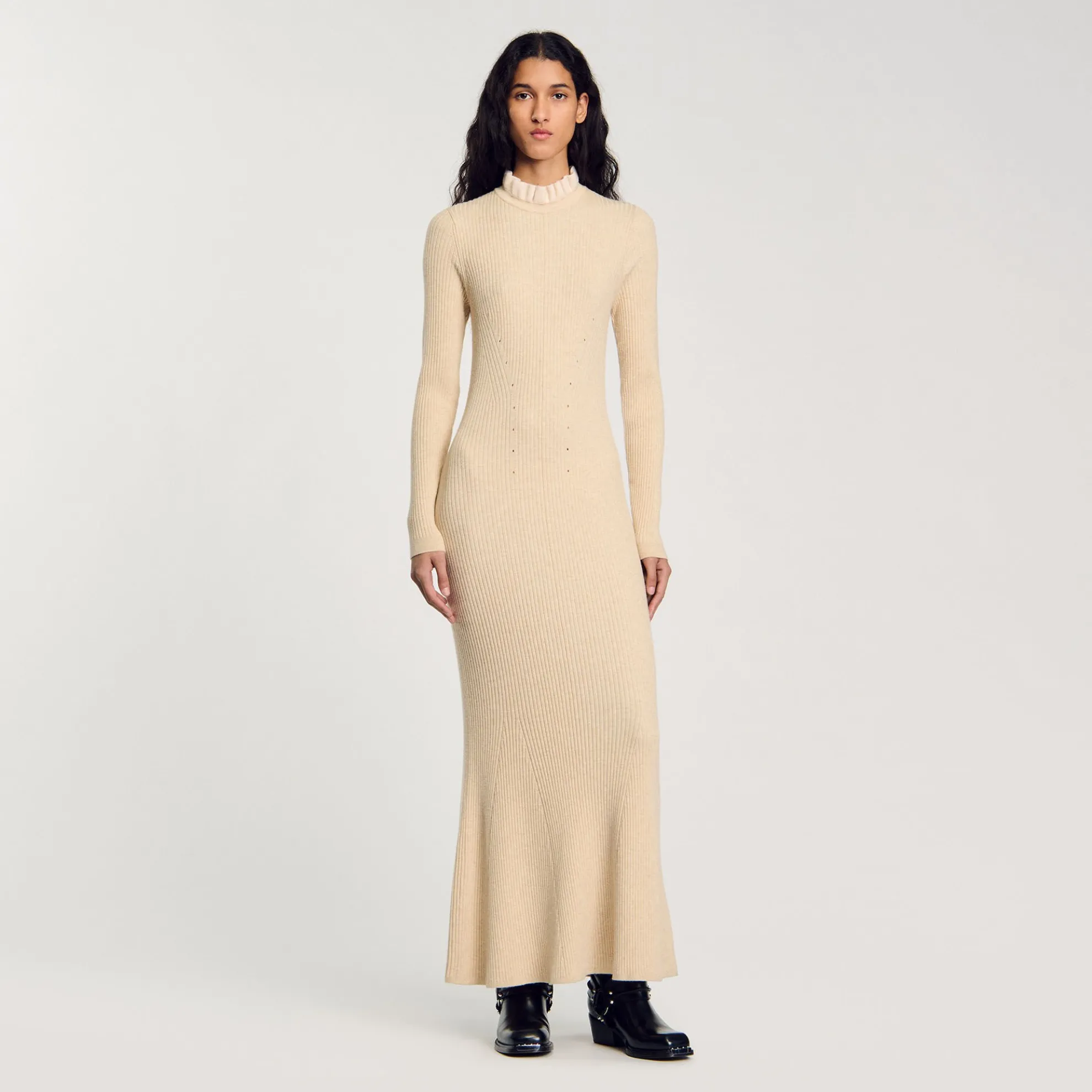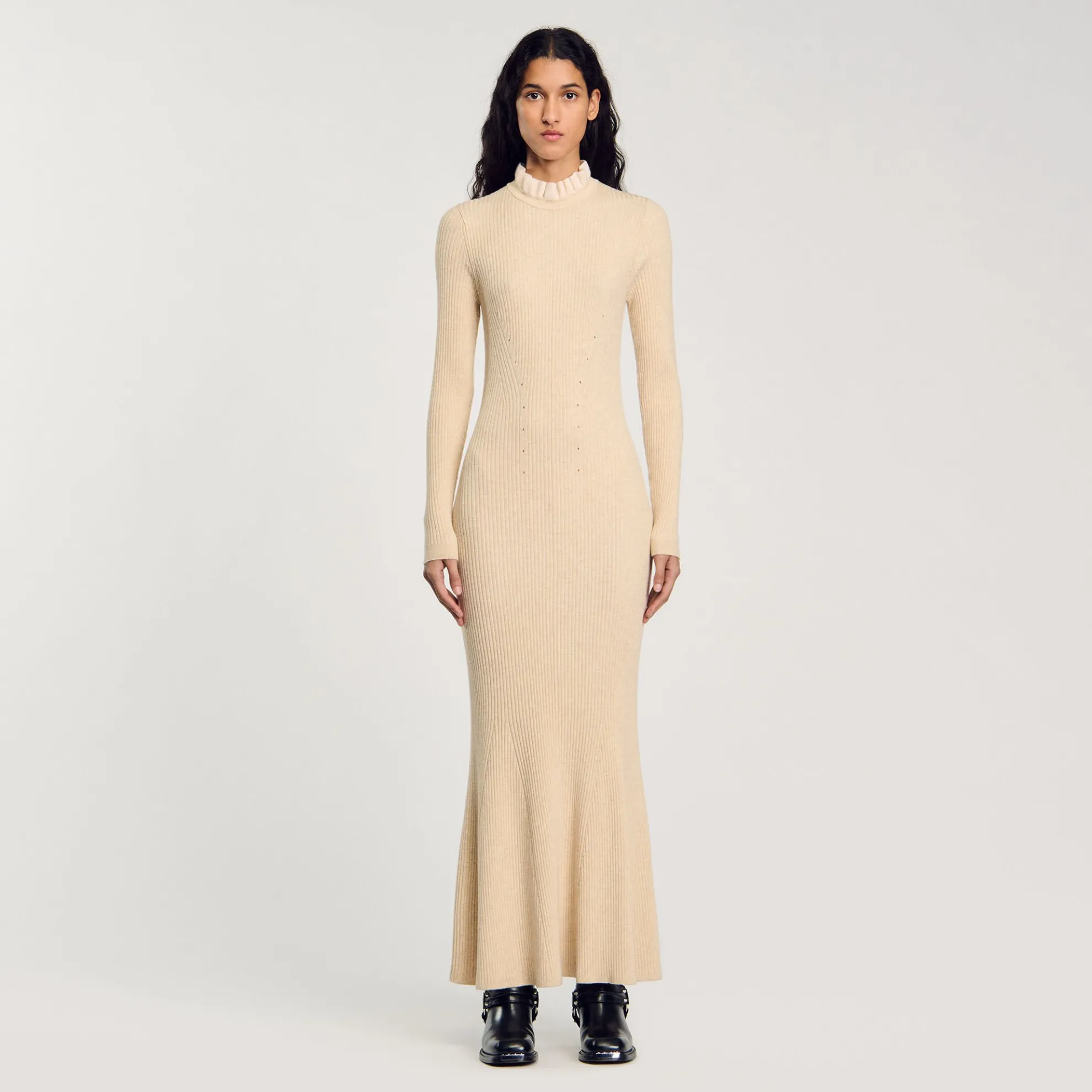 Lange jurk van ribtricot met een contrasterende kraag met ruches, lange mouwen, en een uitlopende rok.
