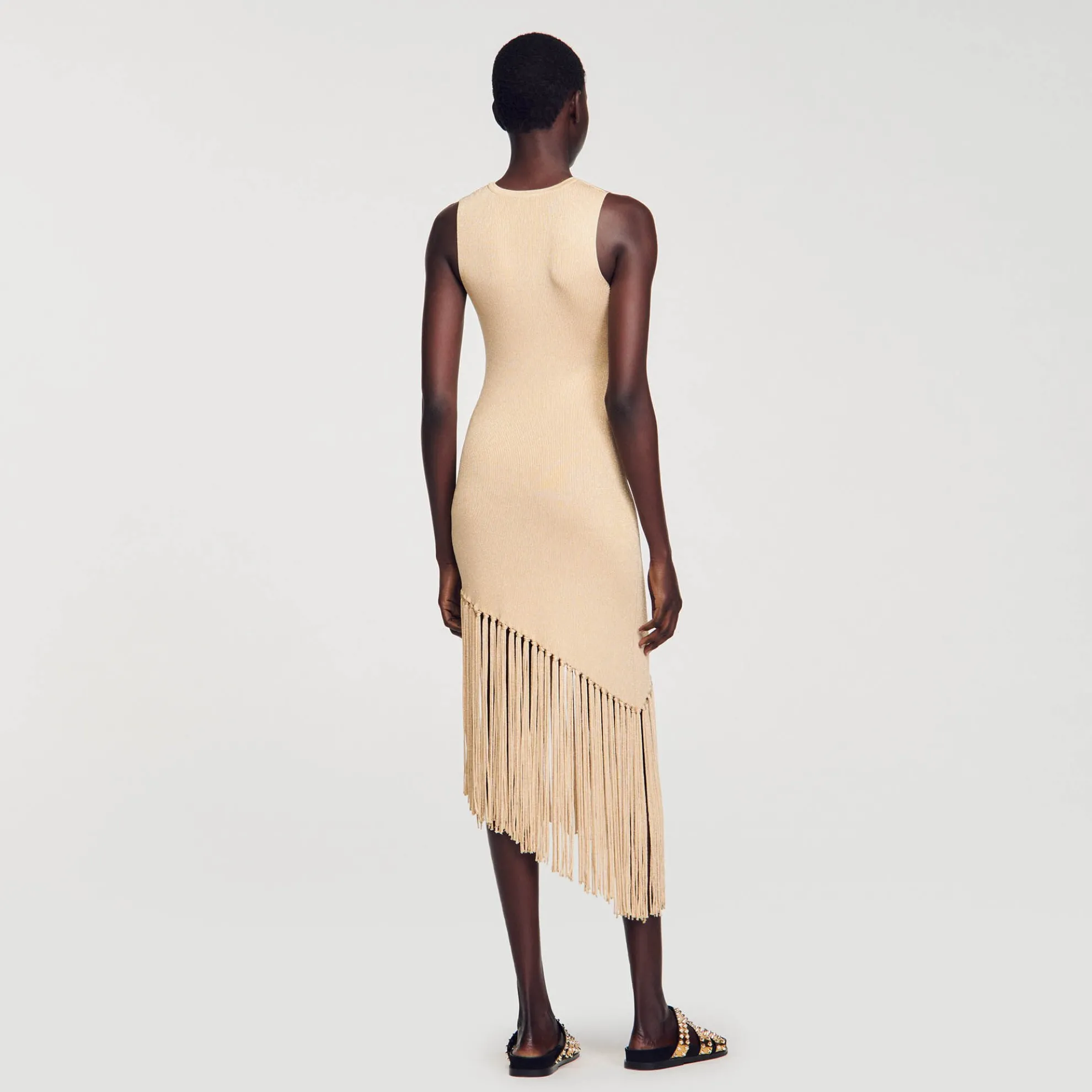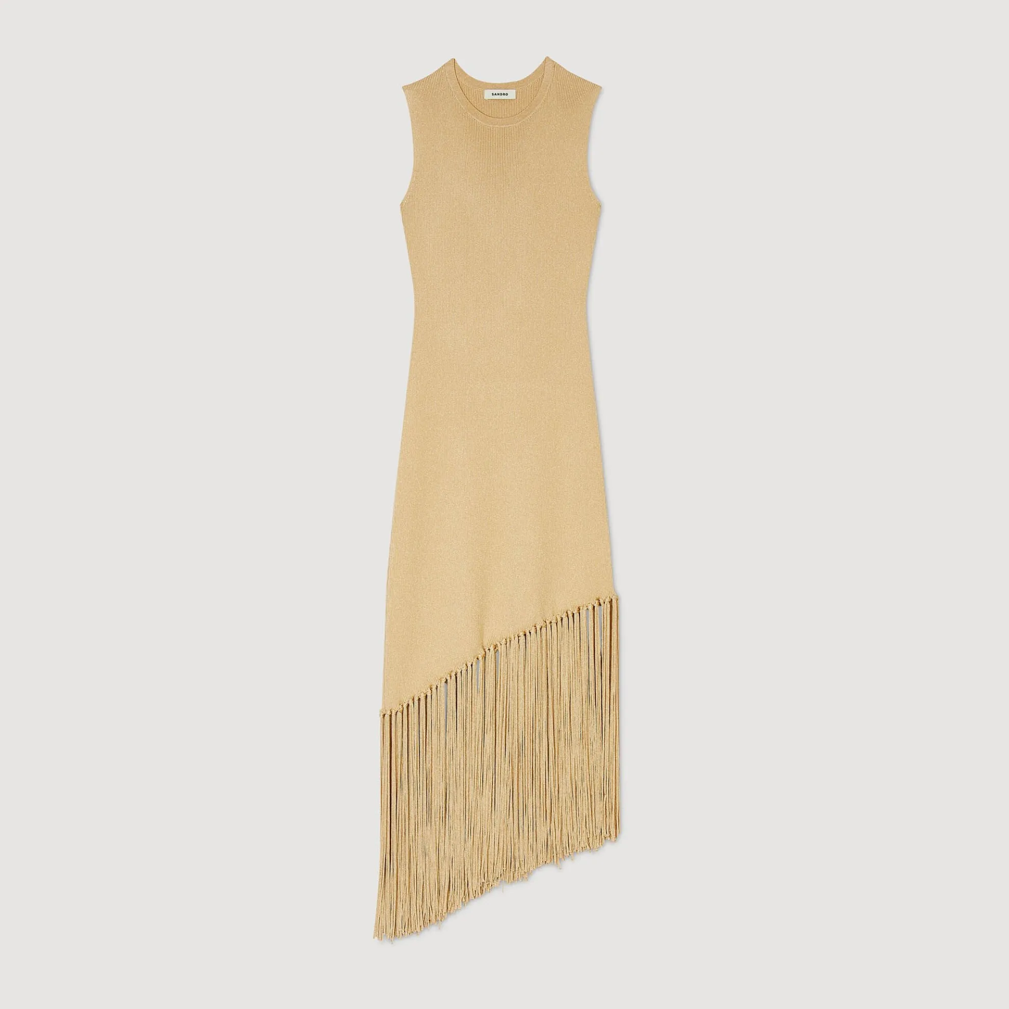Mouwloze ribgebreide lange jurk met een ronde hals en asymmetrische franjes aan de onderkant.