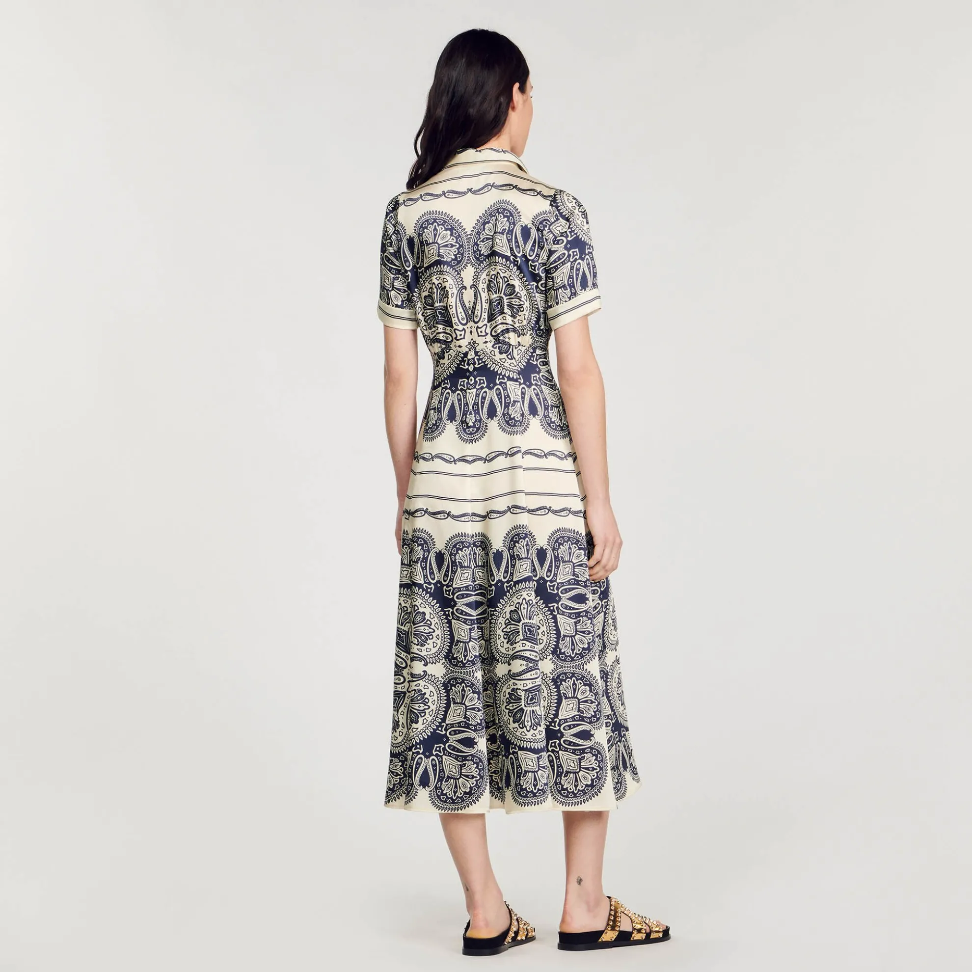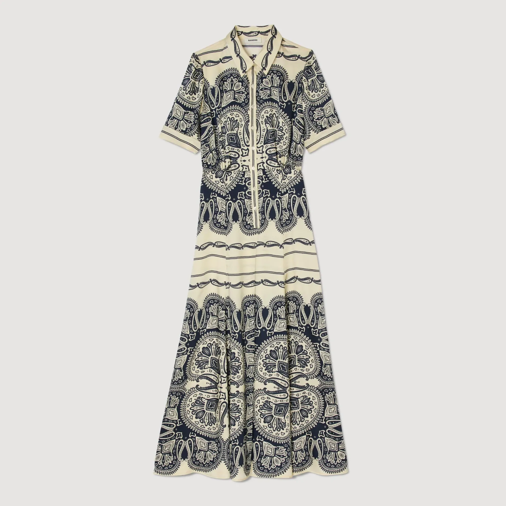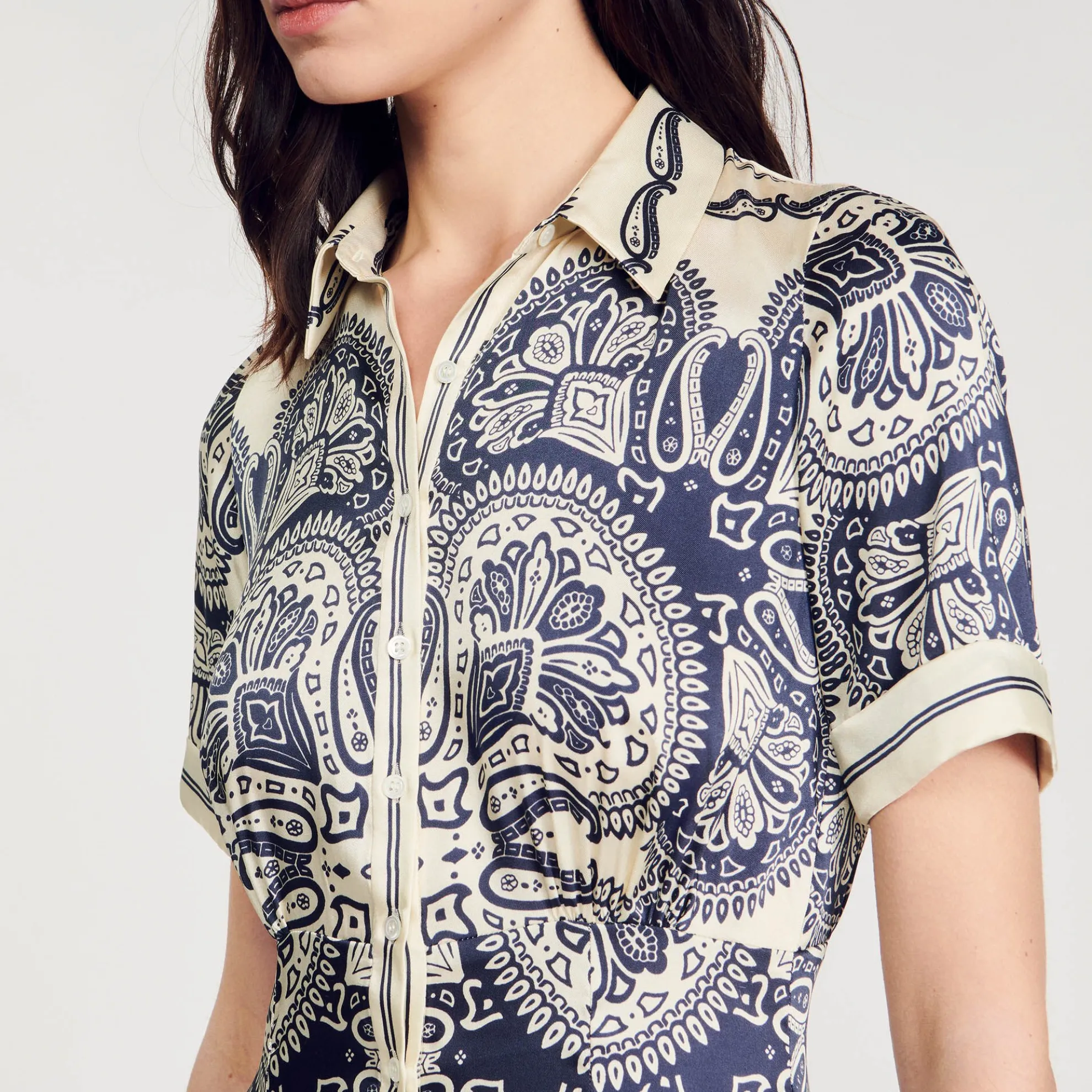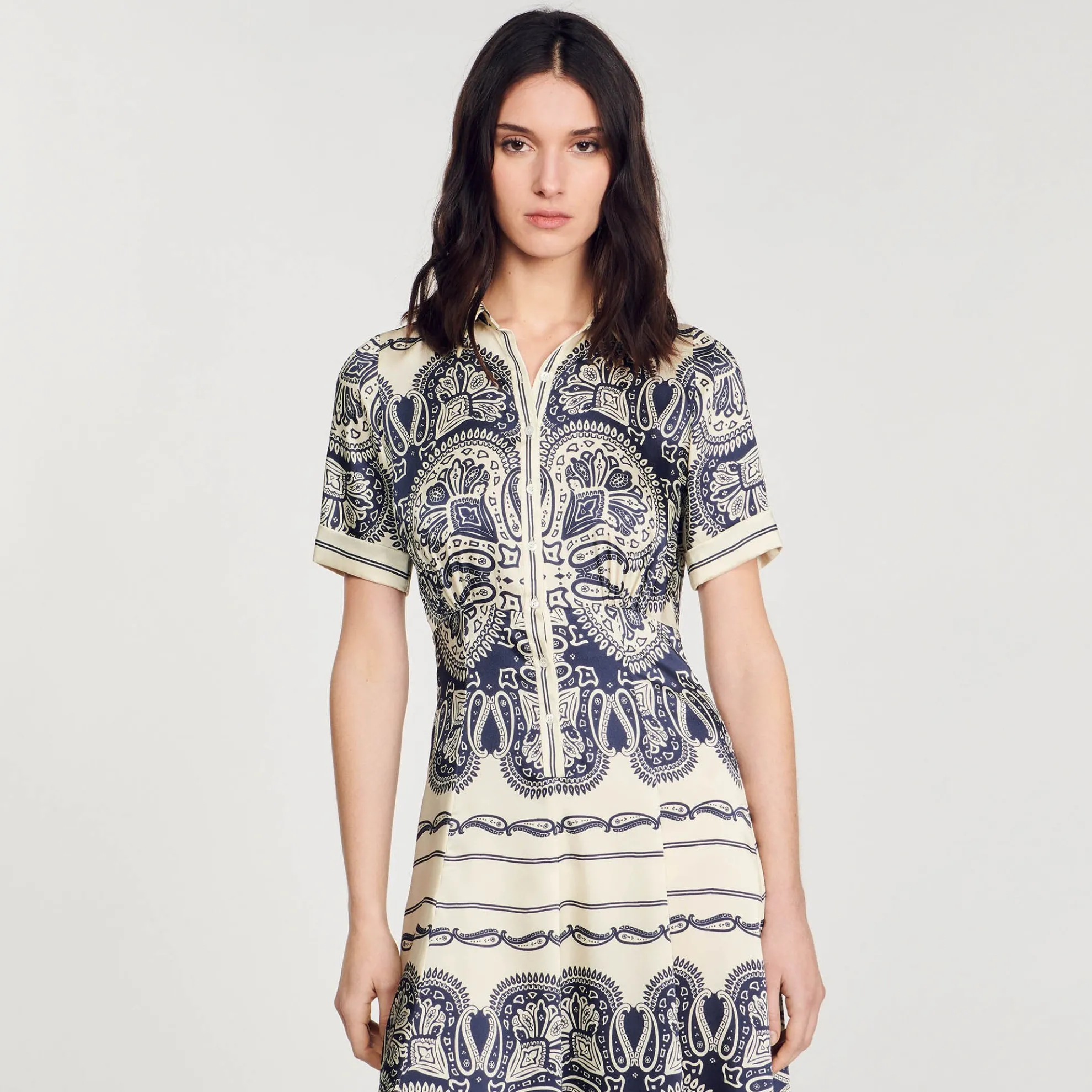 Lange overhemdjurk met knoopsluiting, een overhemdkraag, korte mouwen, uitlopend rokgedeelte en Paisley print.